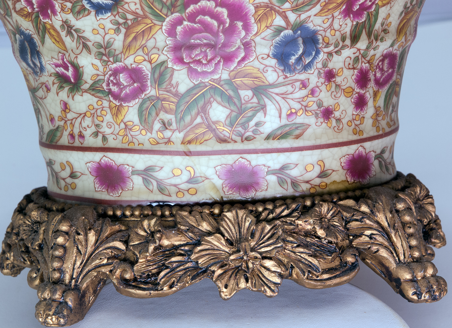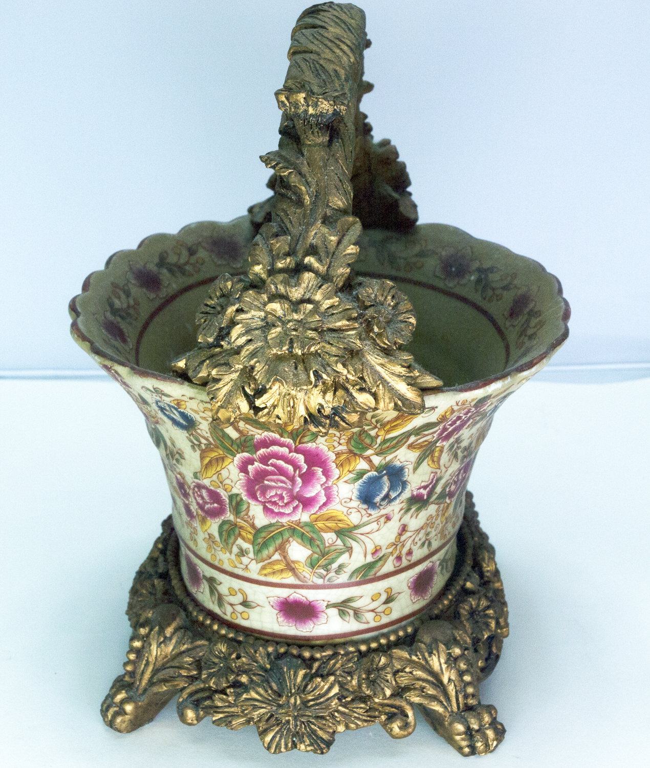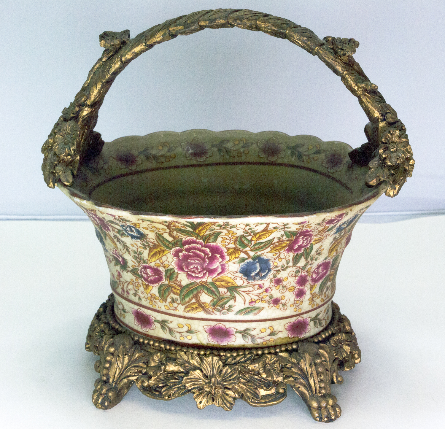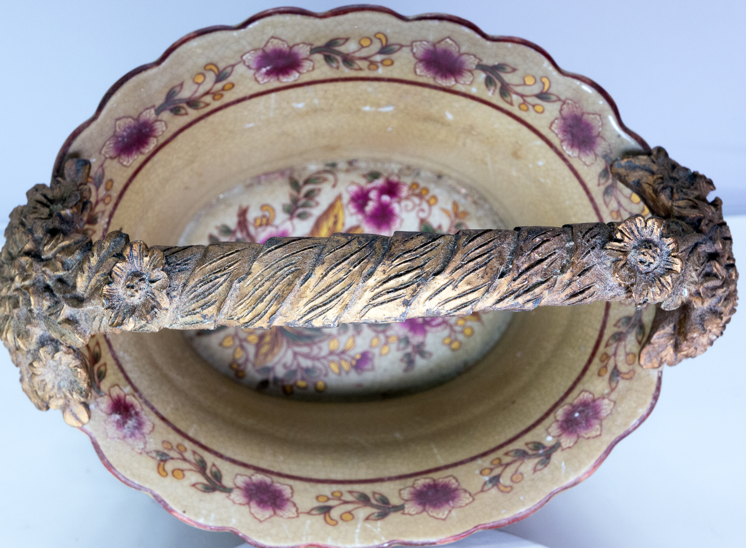 I have an old looking basket-shaped item measuring 8 inches wide, 6 inches deep, and 5 inches tall (9 inches tall if you include the handle). The body of the basket is some king of ceramic material, has an ornate floral design, has lots of crazing, and appears to be brown with age (but this could be the way it was made). The very fancy footed base and handle are made of some mystery material that is hard, but seems to have a very low density (almost like paper mache than has been hardened somehow).