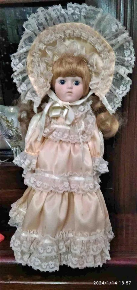 42 CM Height dolls with full dress gear and bonnet on the head.Shoes and dress in very good condition no tearing or other wear.