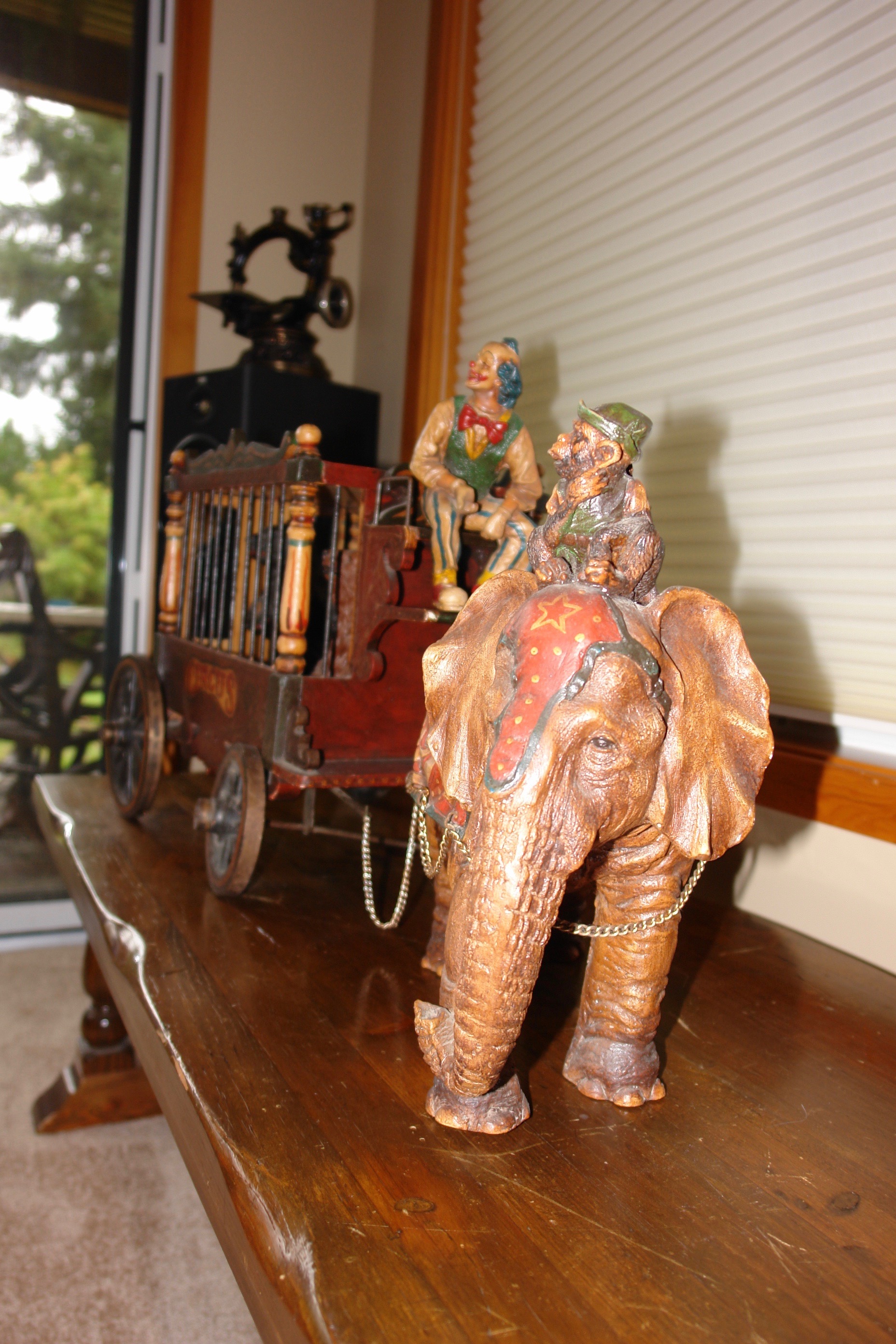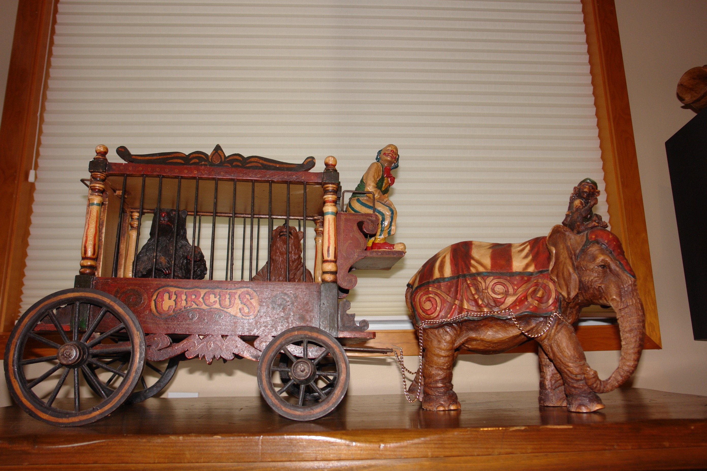 Ceramic Elephant pulling a wooden circus wagon. Two ceramic bears inside wagon. Ceramic clown driving wagon. Ceramic monkey sitting on elephant.