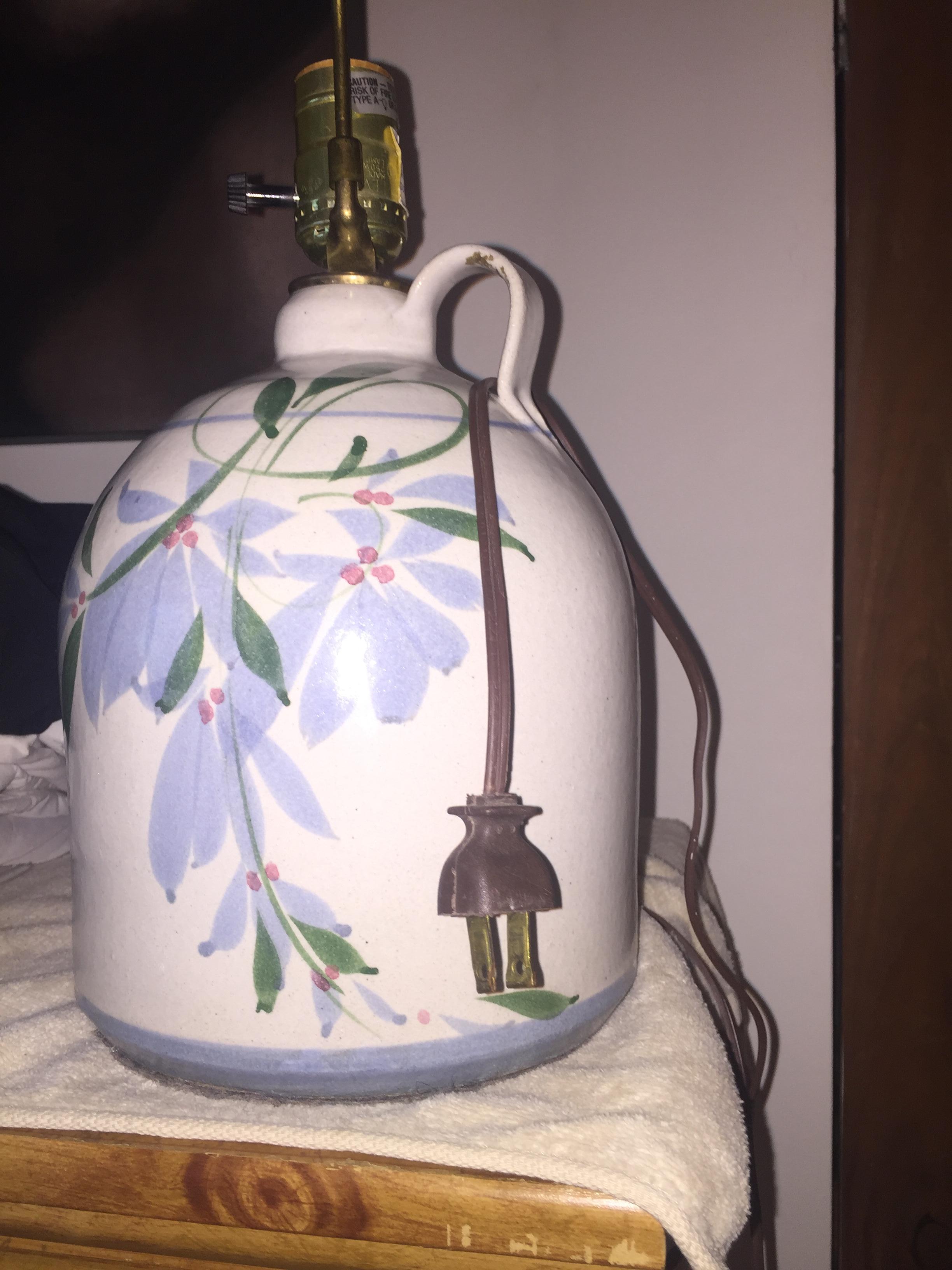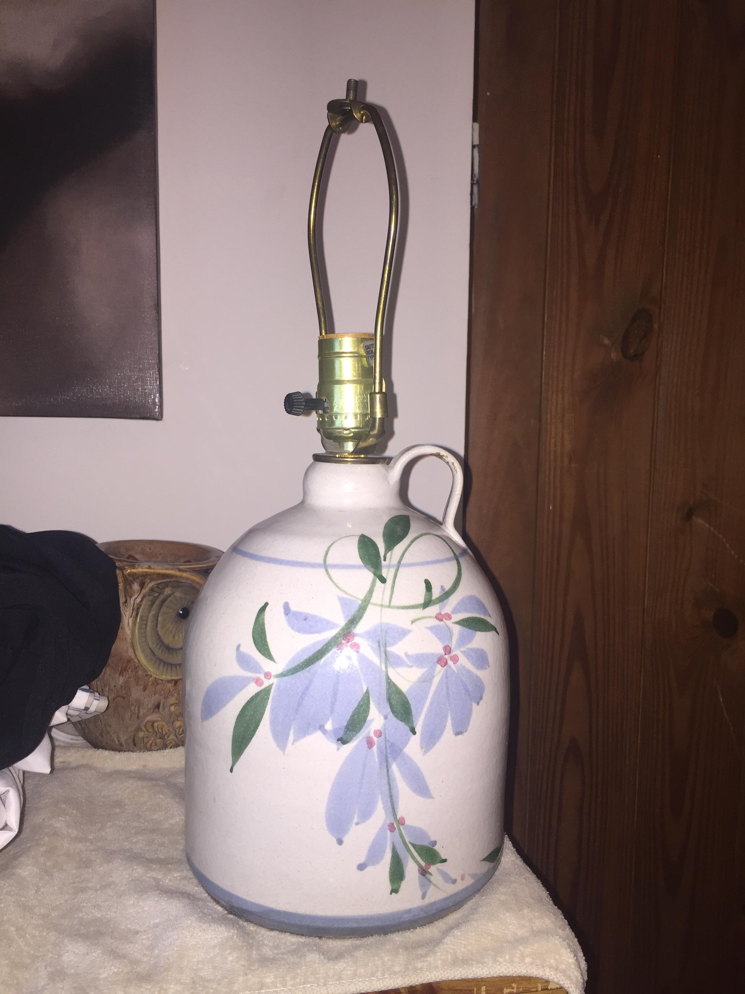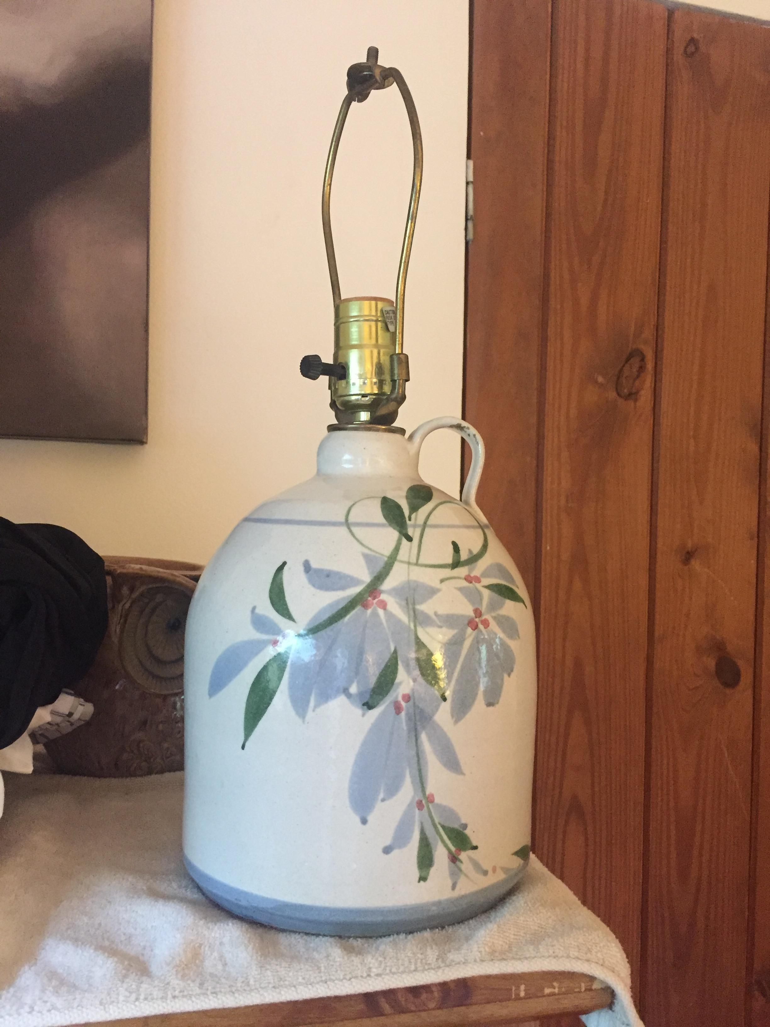 One gallon, single handle, vintage ceramic jug table lamp.  White in color with  hand painted floral art work. Thin, light blue line at top just under handle, and thicker, light blue line at base, with floral art in between.  Old ungrounded electric cord.  Felt bottom.  Standard lightbulb receptical  Great condition.  No chips in paint