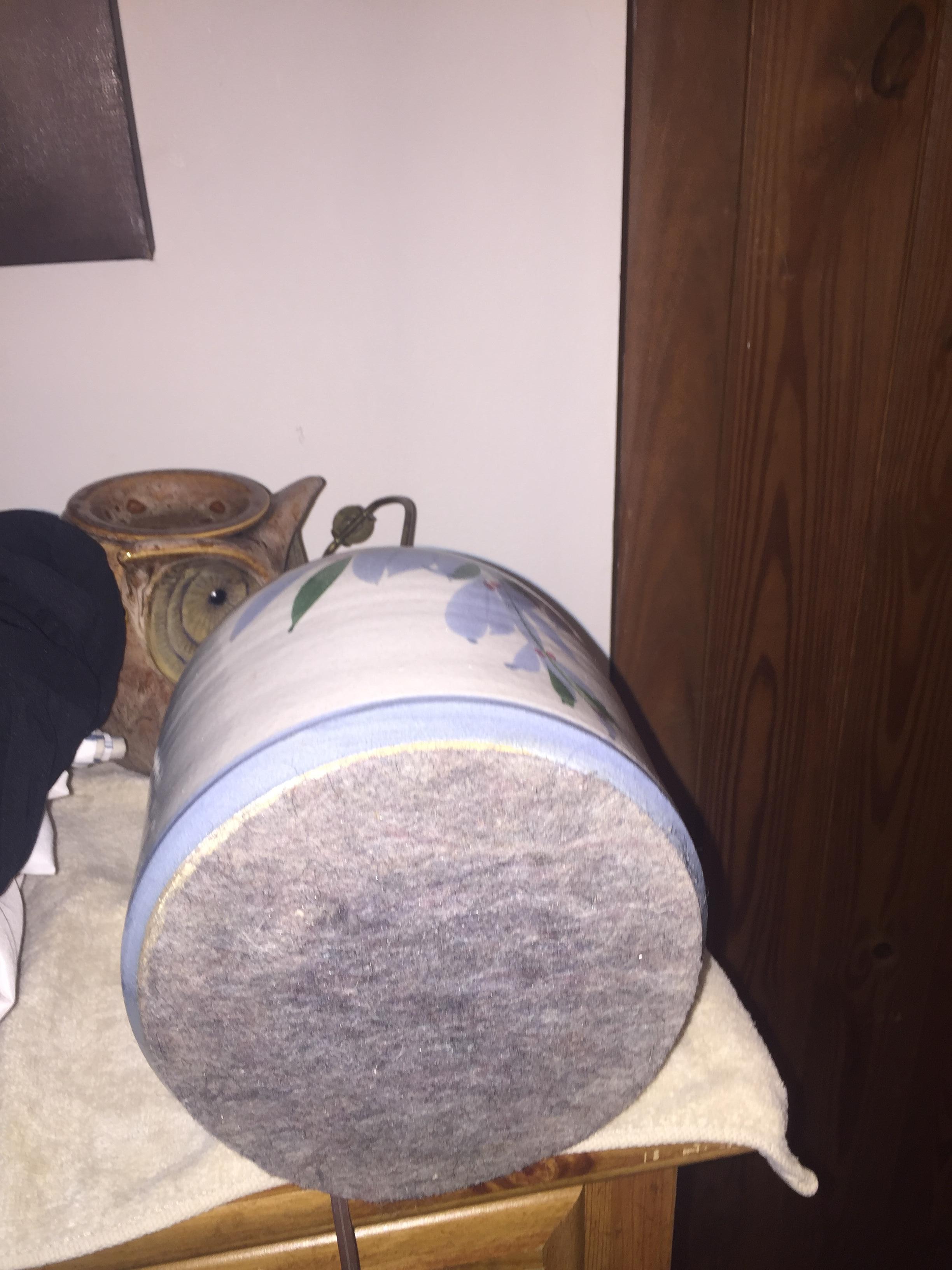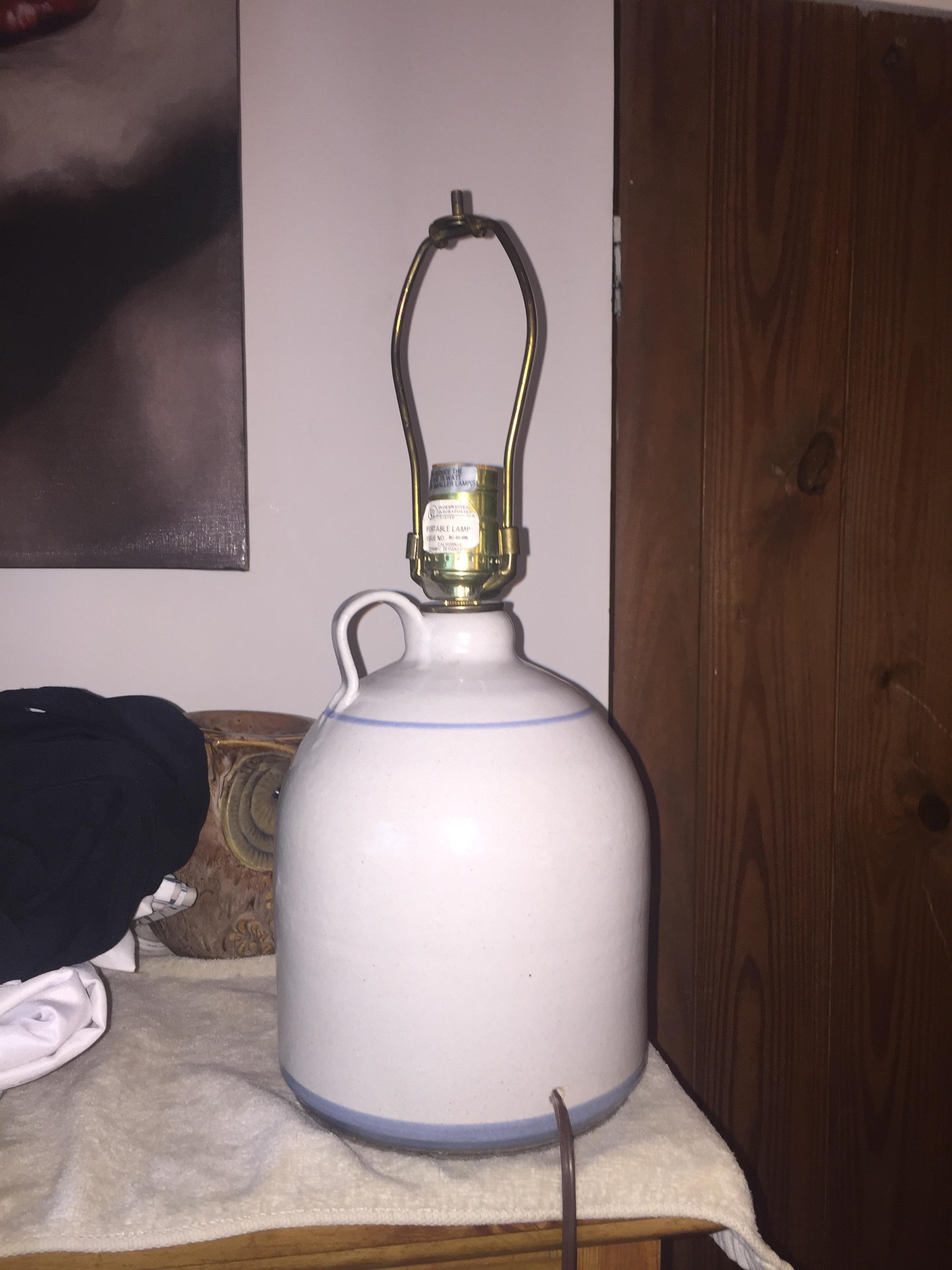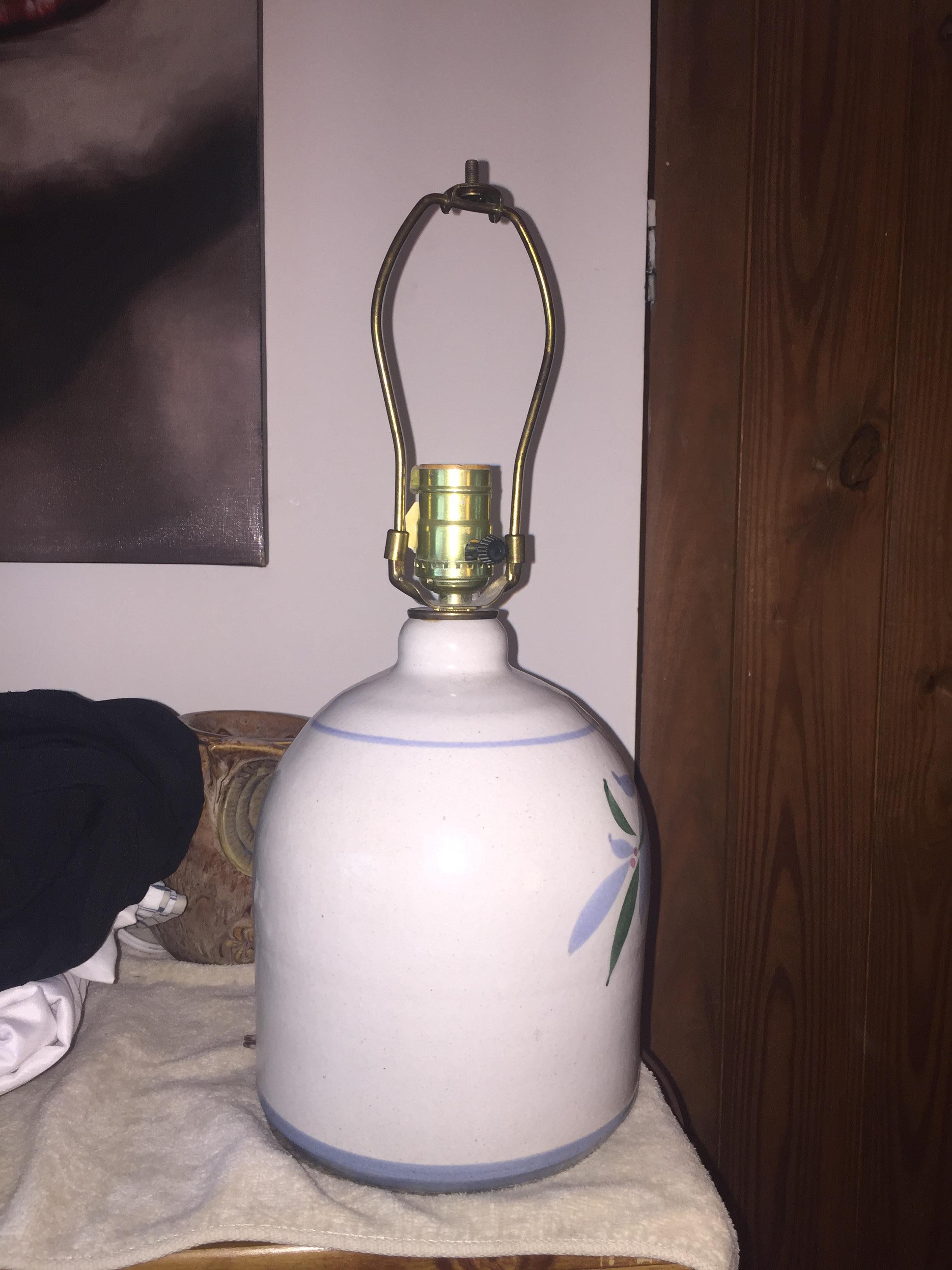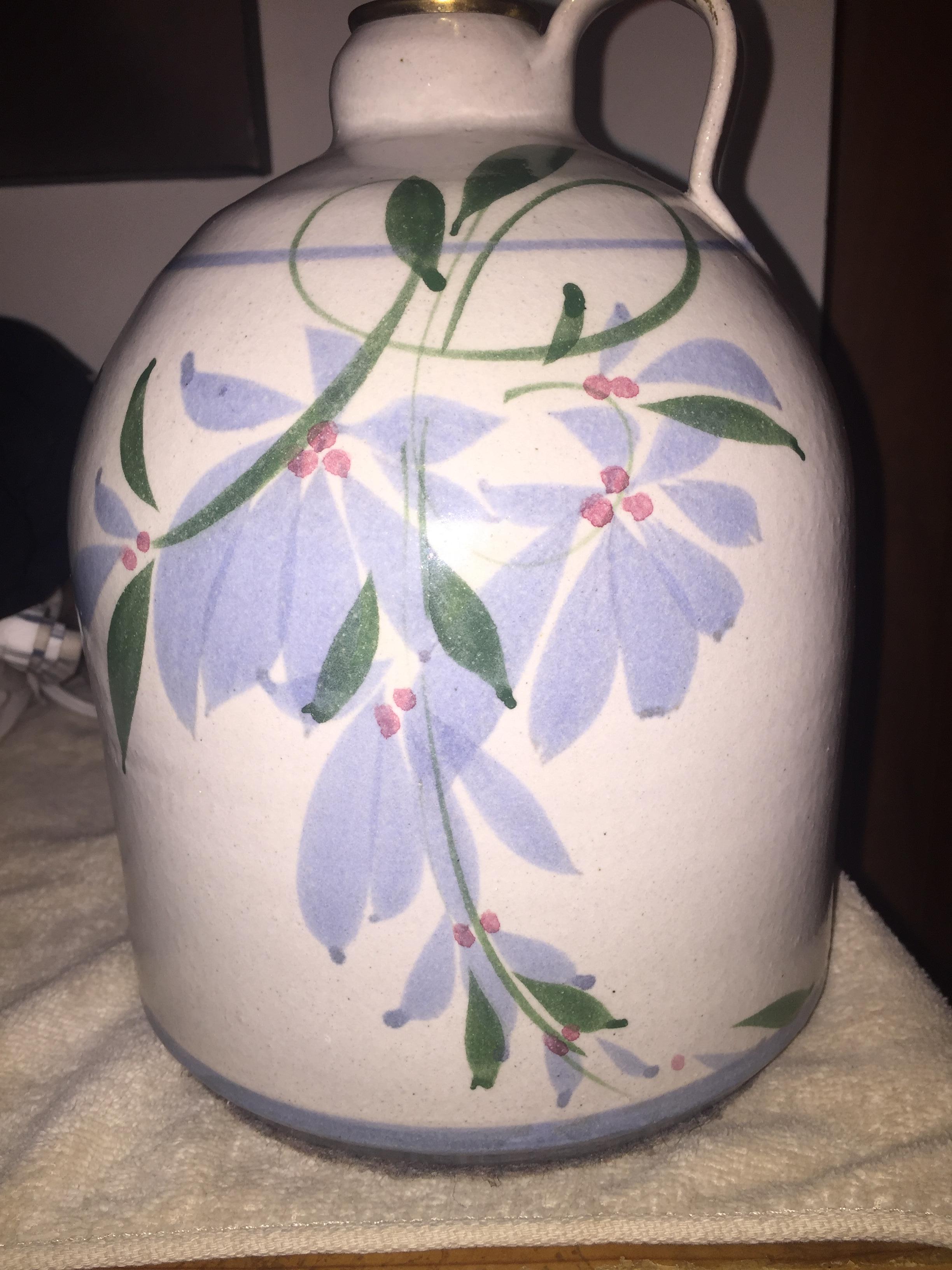One gallon, single handle, vintage ceramic jug table lamp.  White in color with  hand painted floral art work. Thin, light blue line at top just under handle, and thicker, light blue line at base, with floral art in between.  Old ungrounded electric cord.  Felt bottom.  Standard lightbulb receptical  Great condition.  No chips in paint