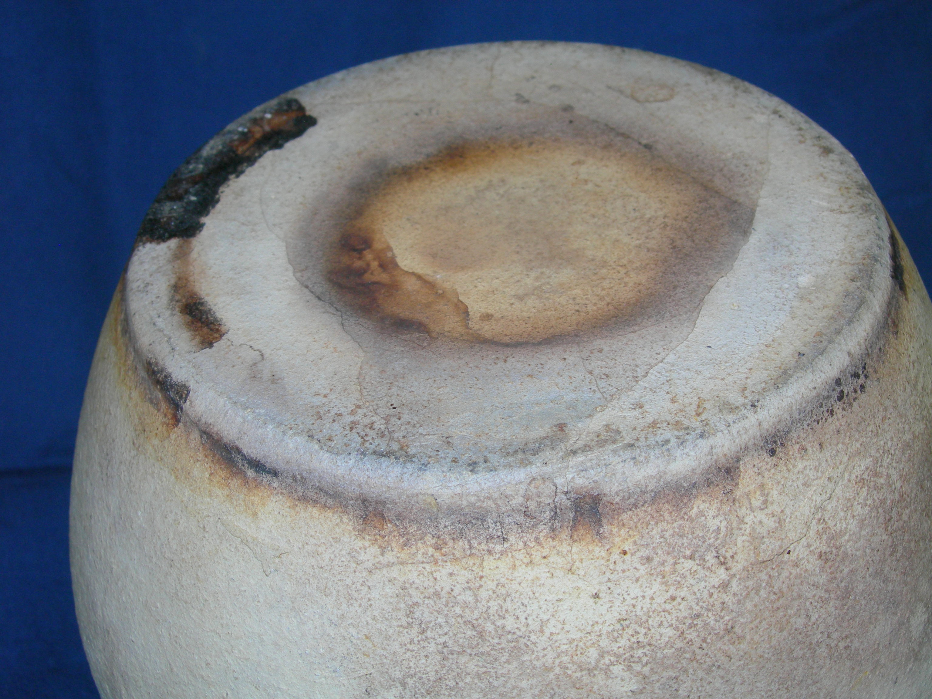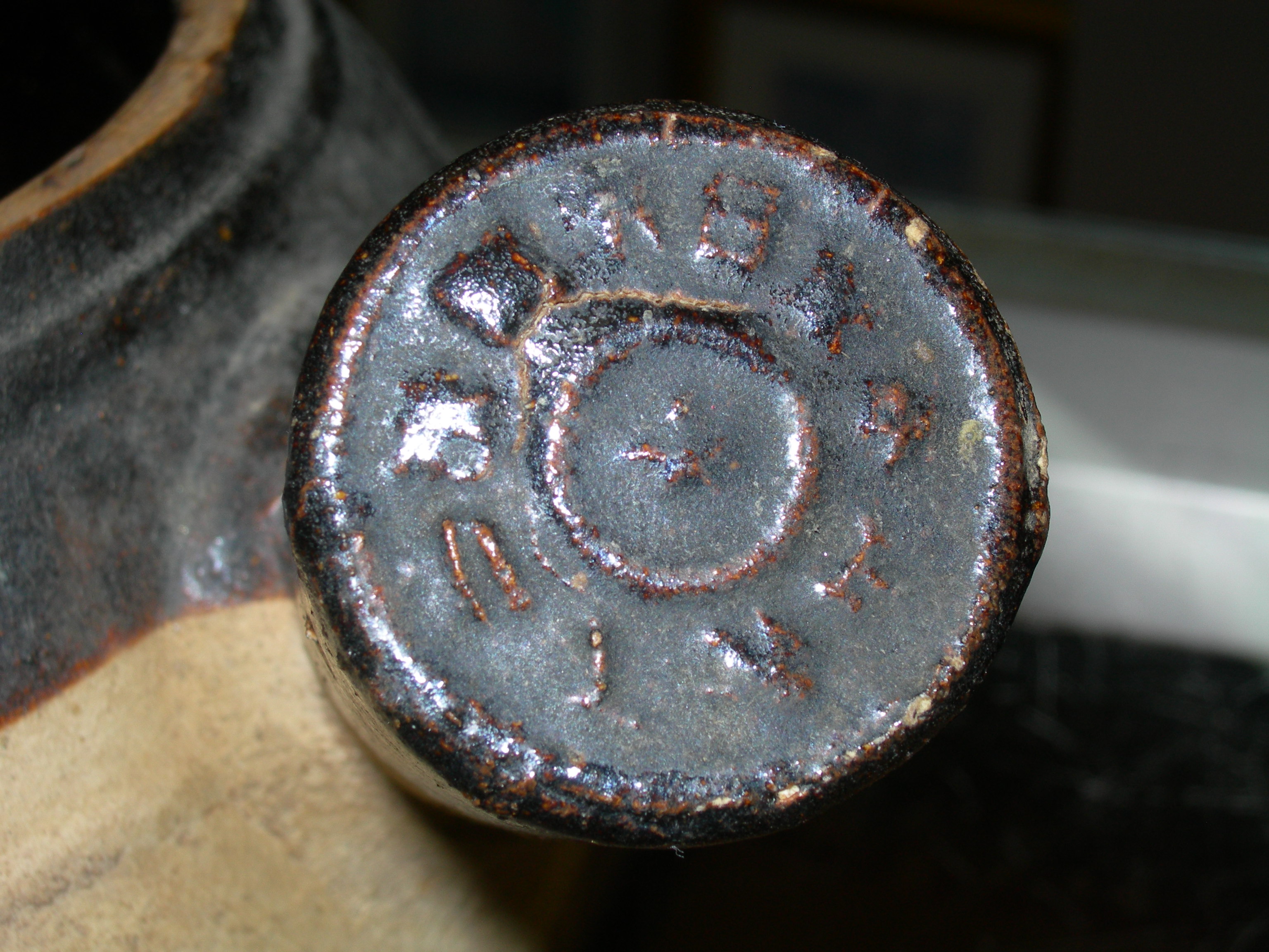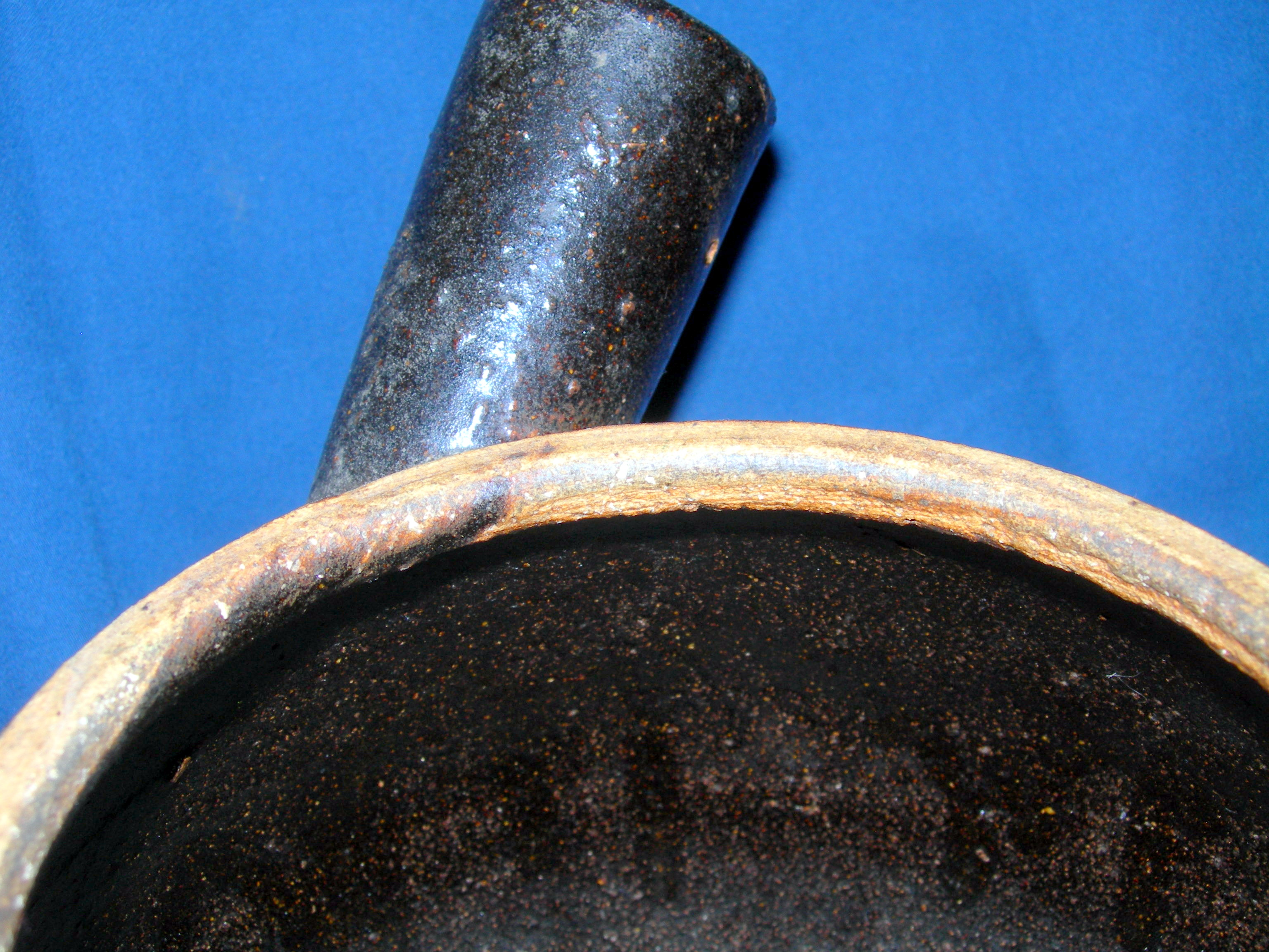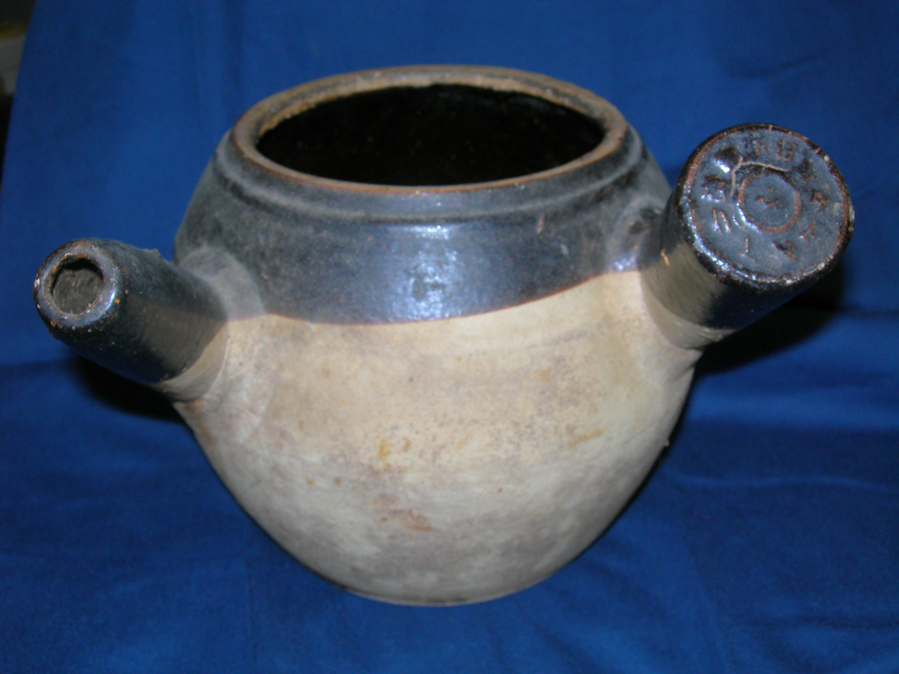 Pot, possibly a tea pot, with offset handle and spout pointing in same direction.