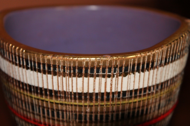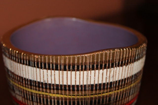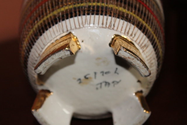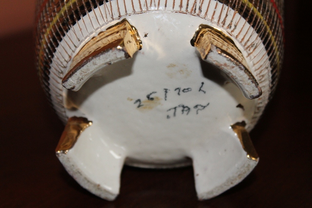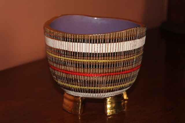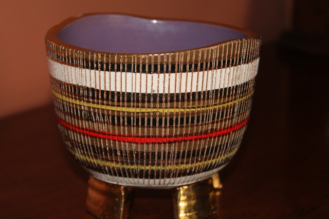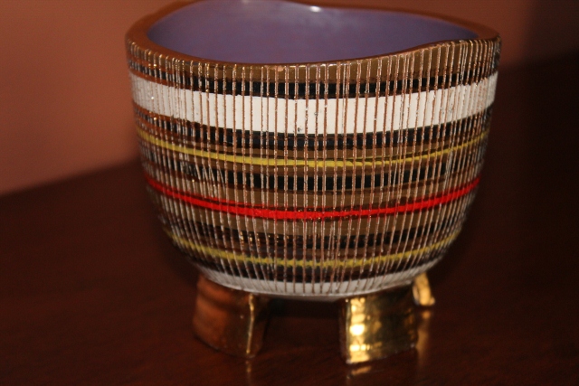 Ceramic pot/dis with 4 legs. Color is similar to a plaid.  Brown, black, gold, red, white.  There are markings on bottom - looks like: 2 5 / 7 0 L
