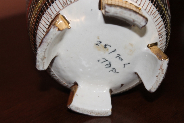 Distinguishing marks Trimmed in gold. There are markings on bottom aren't clear - looks like: 2 5 / 7 0 L