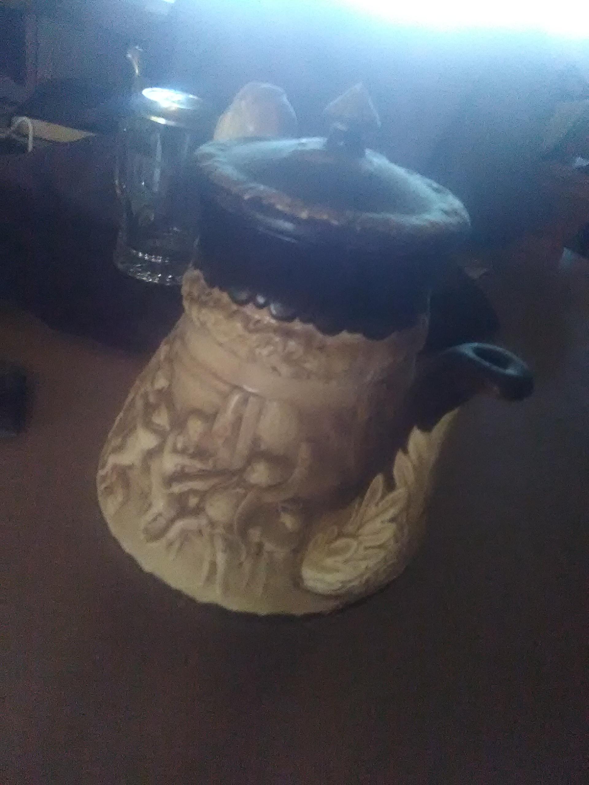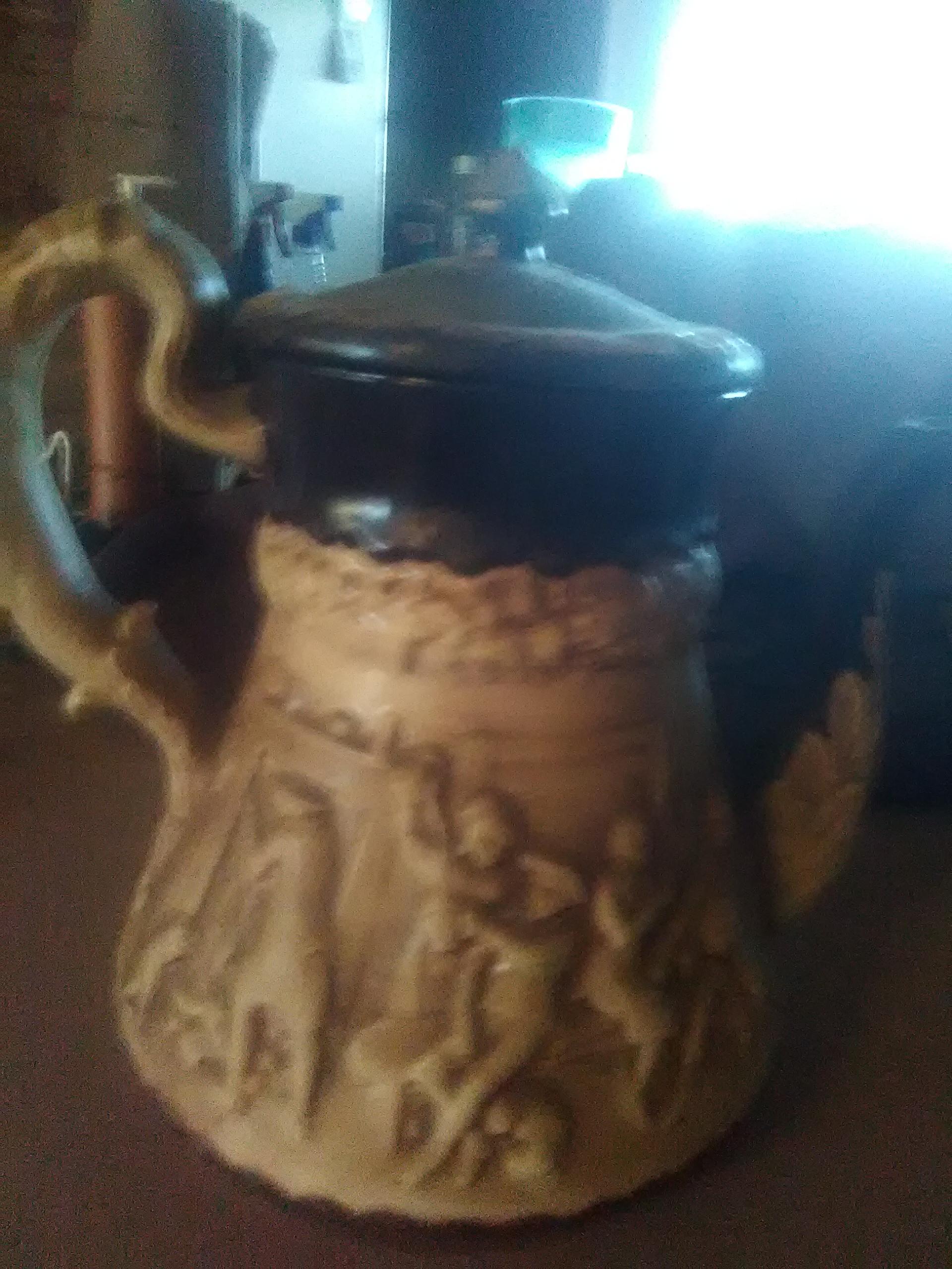 Brown and tan. Kettle tea pot 17th century comremative on underneath lid engraved PAW