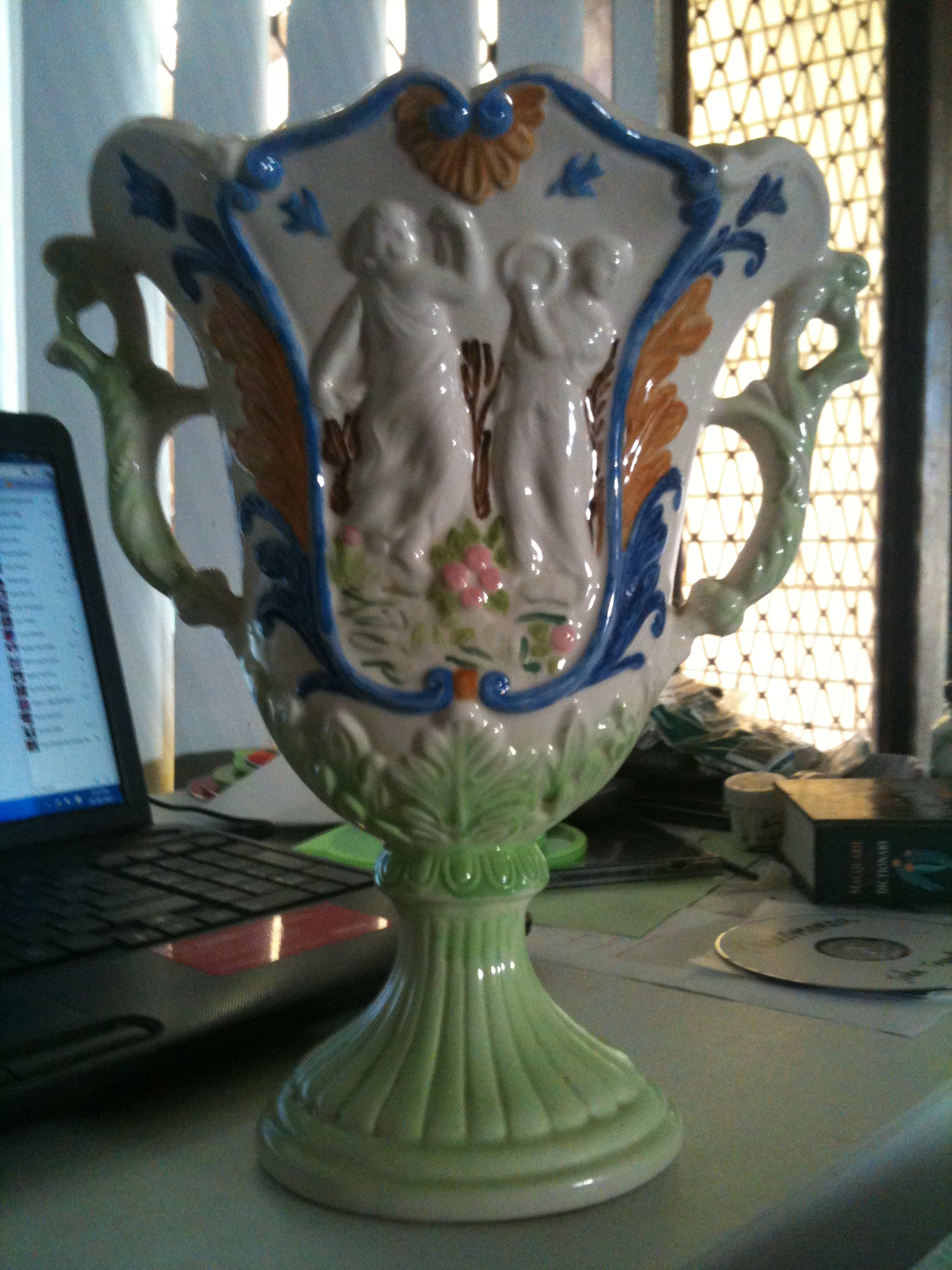 Italian 2 people (Olympic releifs)  different on each of two sides, main colours are green white blue tan,  27.3cm tall