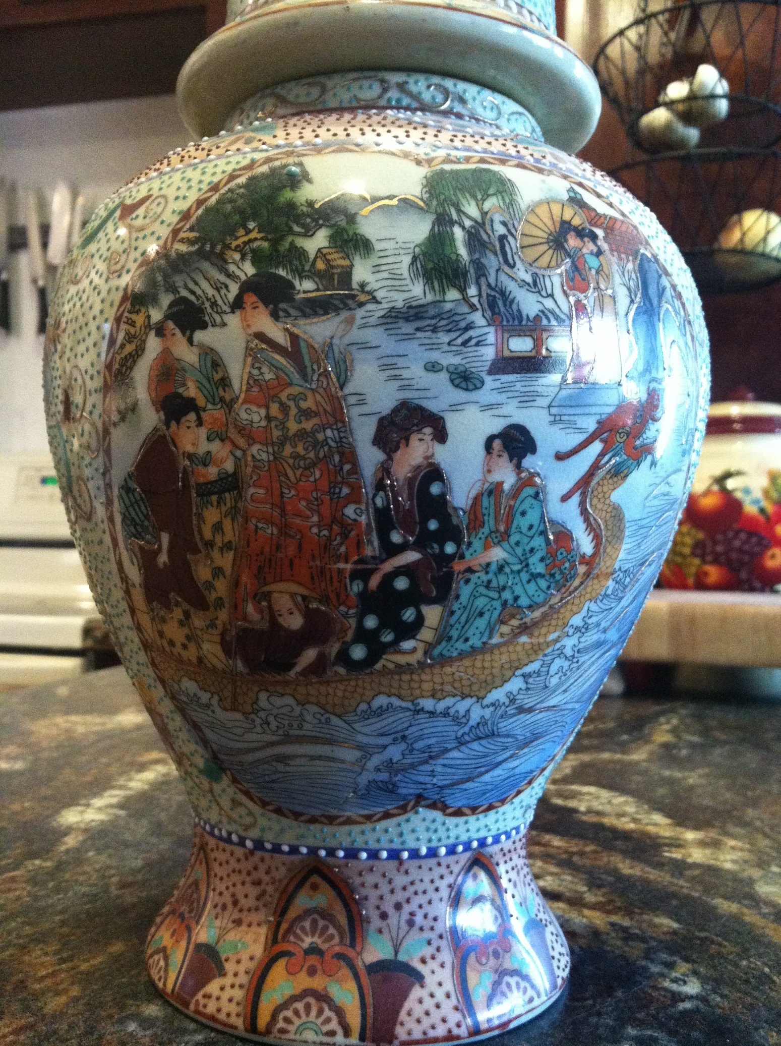 It's Chinese, but patterned after Japanese Satsuma moriage Pottery. Most pieces like this post date World War Two, but similar examples are still in production.