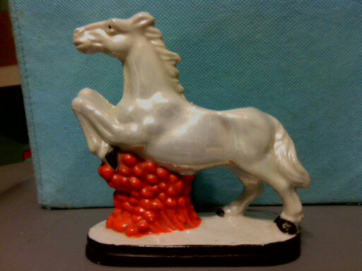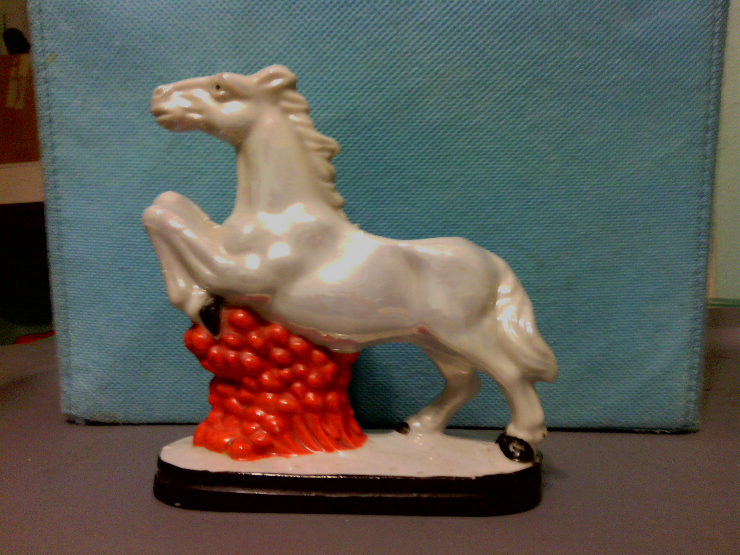 I bought this at an auction, stamped on bottom made in japan and japan is etched on right side. Theres a hole made in the top of horses body making the horses body hollow. Someone once told me that it was from the 1940's.
