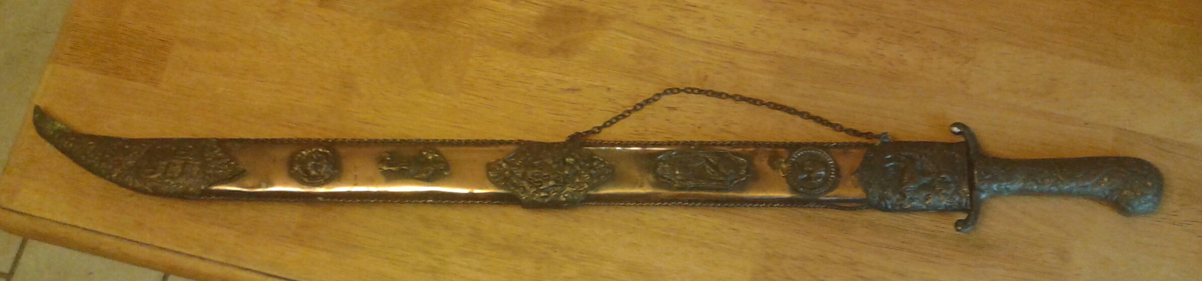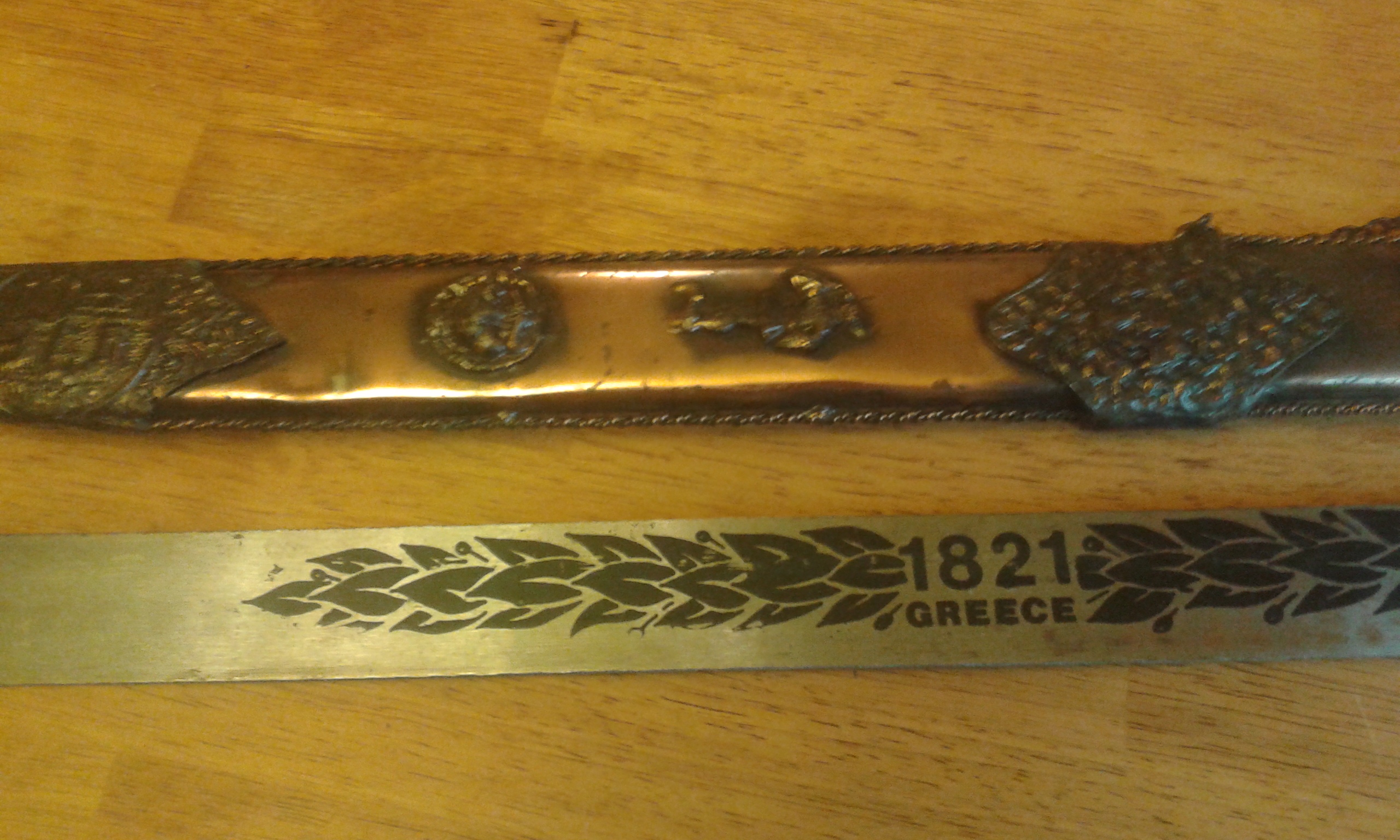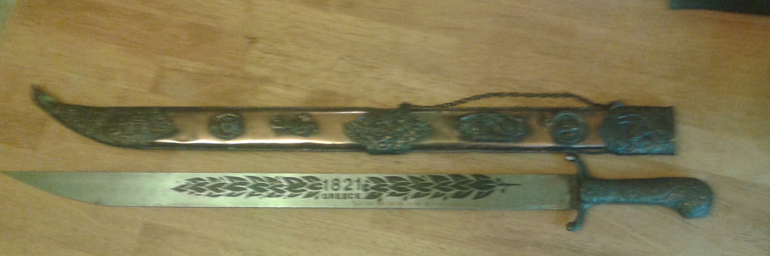 Scabbard that says 1821 on the blade. The blade isn't sharp so it may be a ceremony sword? It has some patina on it. I don't really know about these types of things but I can answer any questions u may have.