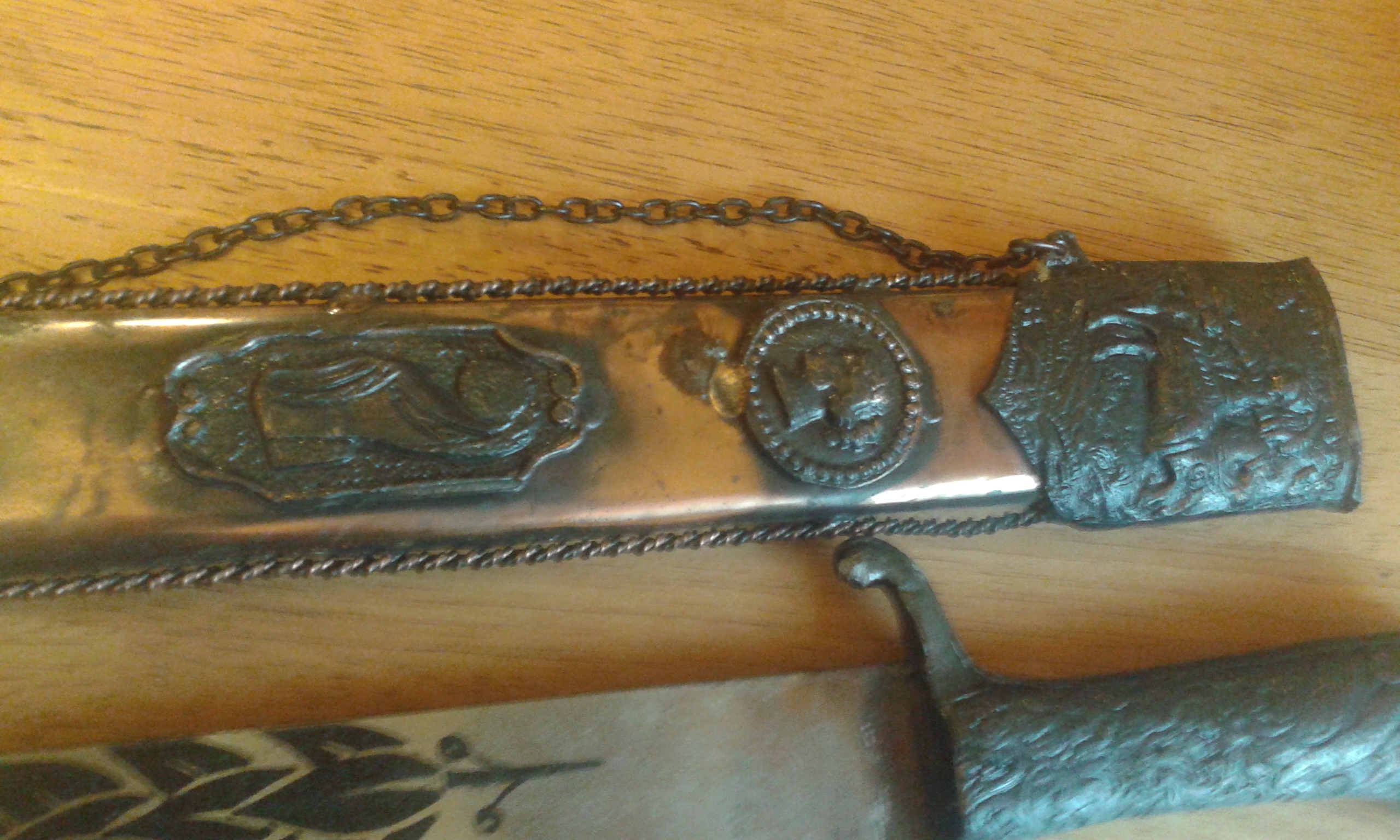 Pewter hilt relief decorated in foliage. Chained edge brass scabbard with hide medial segment, mounted with pewter appliques of the Greek eagle,