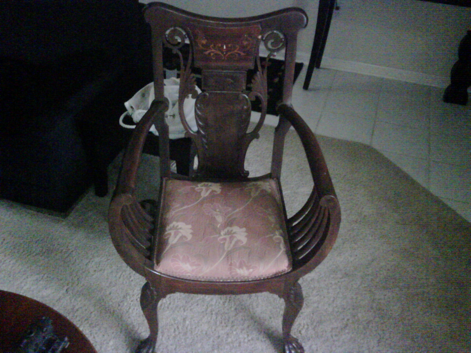 Chair has original finish and upholstery. Burlap strips found under bottom cover. Has marquetry inlay, claw feet, seperate crest rail.