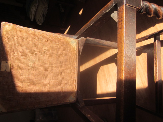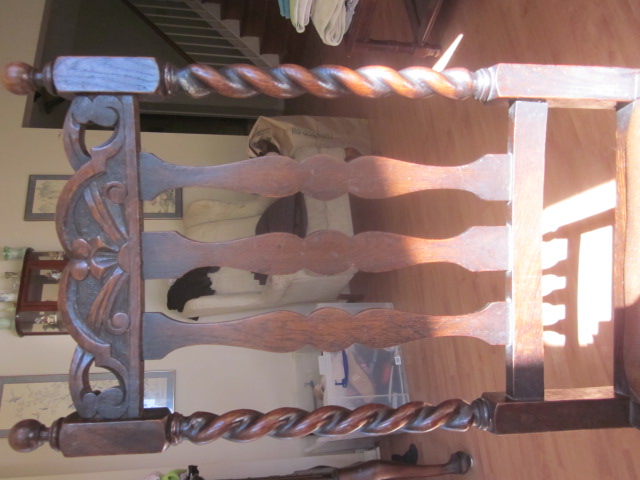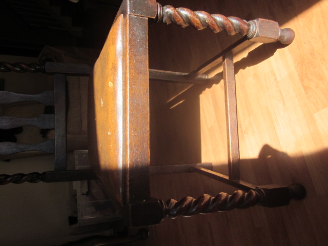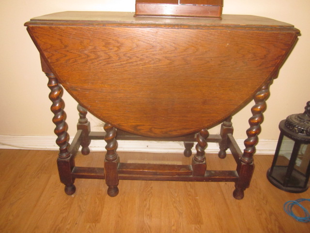 Drop leaf dining table original finish and four matching chairs. We believe it is from the UK as it was my Grandmothers set (born 1900). Chair backs are carved.