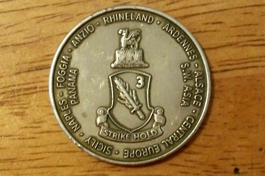 History partroopers were the frist trained to jump from air craft in Frot Bragg N.C they also jumped at night World War 1&2 airborne 3rd 504 strike hold they fought in Central Europe, Sicily to name a few my husband found it in home that he worked on he is a carpenter we have had it for 11 years and have no idea about the coin or it,s value if any