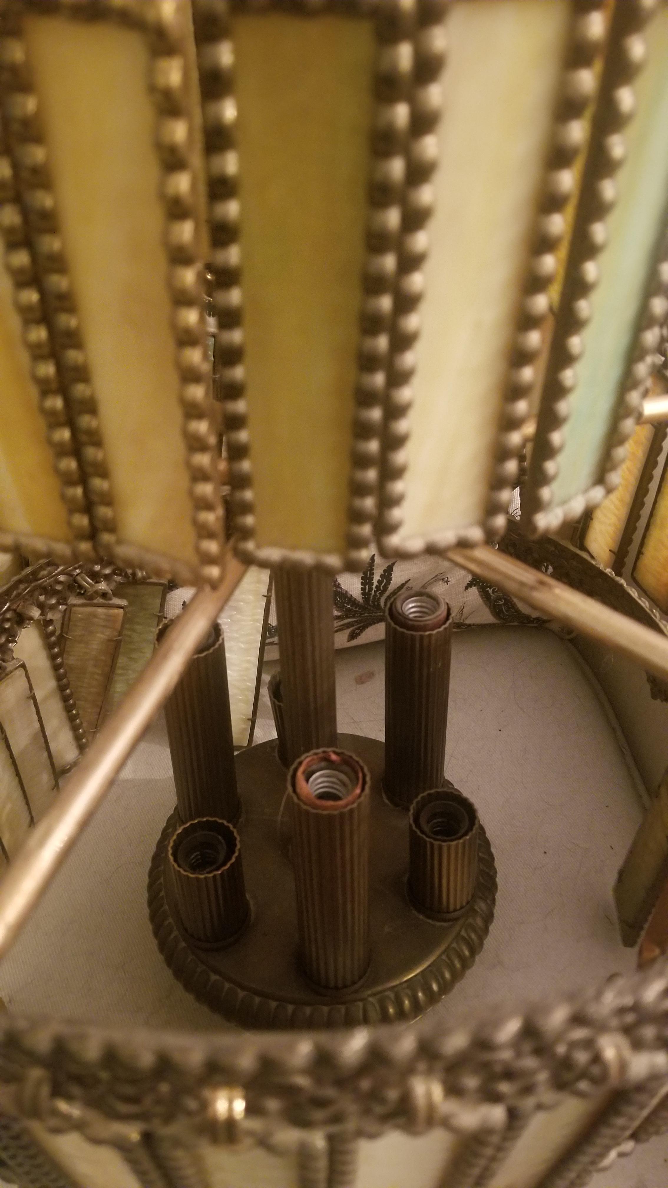 3 tier brass chandelier with slag glass? 20x14. Very heavy. No markings. 1970s?