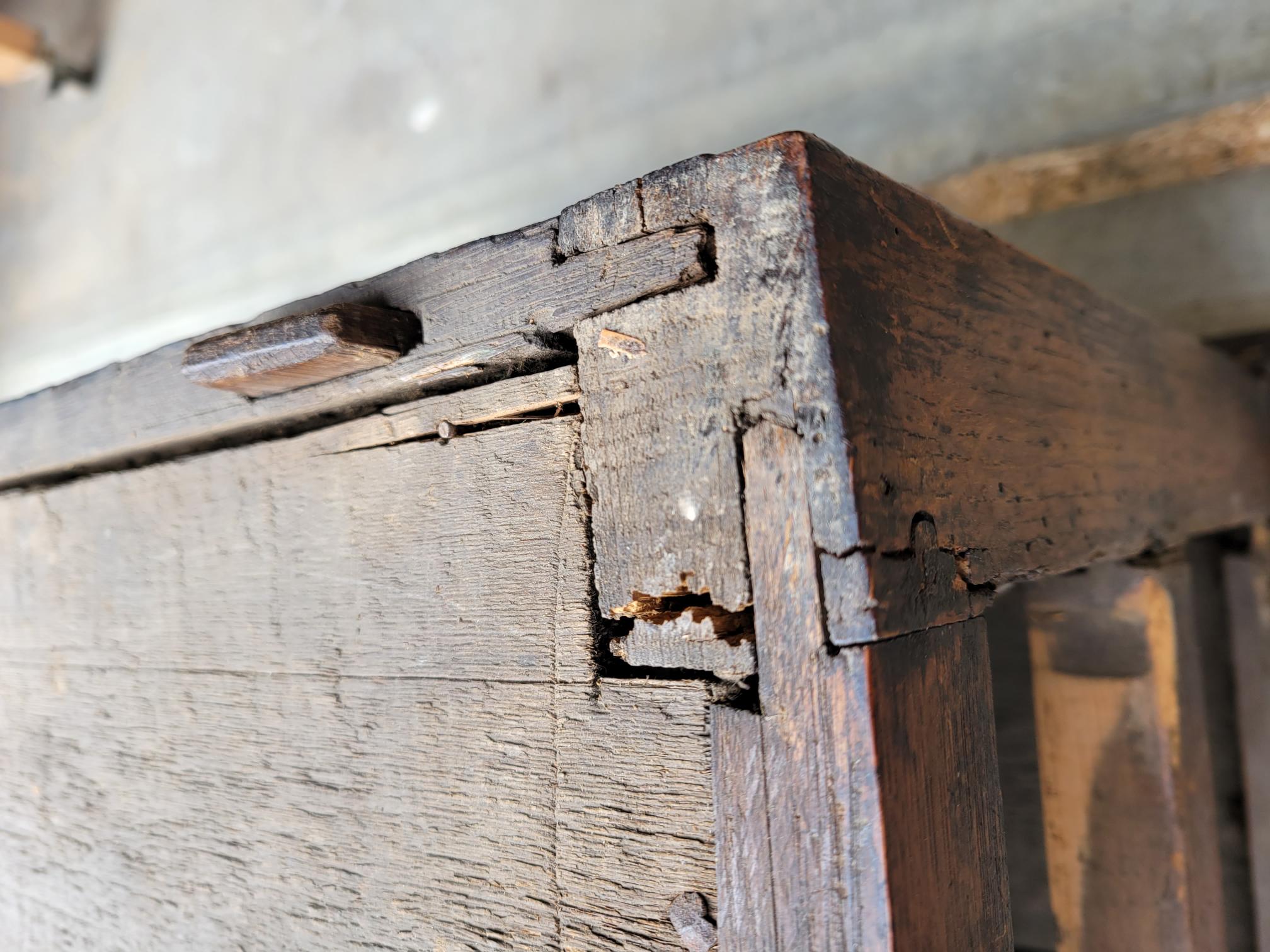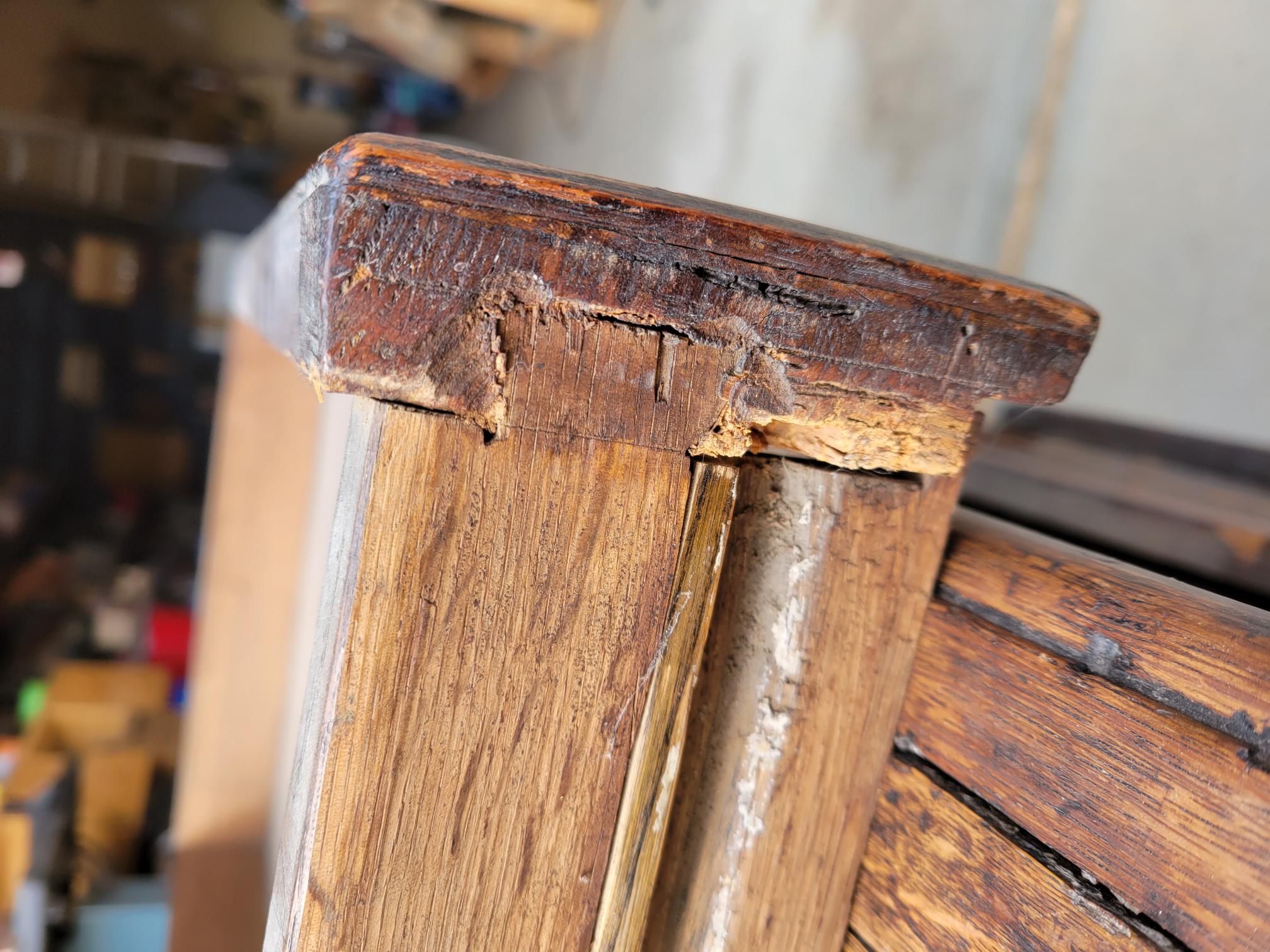 - Floating tennon to register top and bottom together. Three of the 4 were repaired to replace material containing the mortise. This was done very well and you can barley see where the new material starts and the original old material ends. great grain and colour match