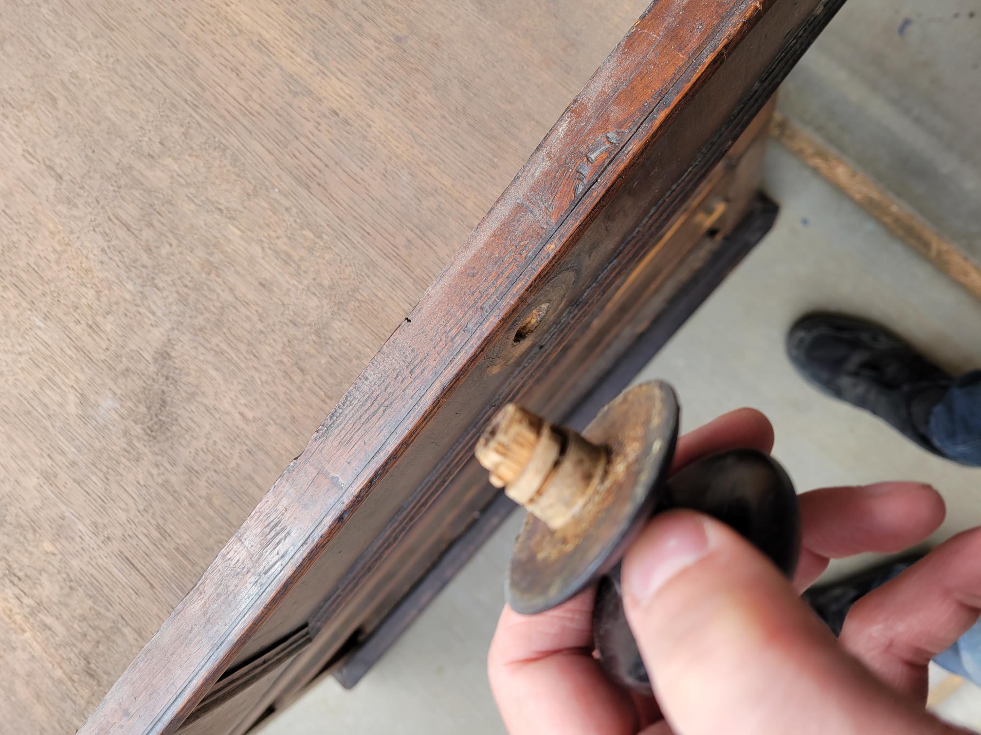 - Knobs look like a new addition, you can see the round dowel has a spiral groove cut into it, these are mostly all loose now.