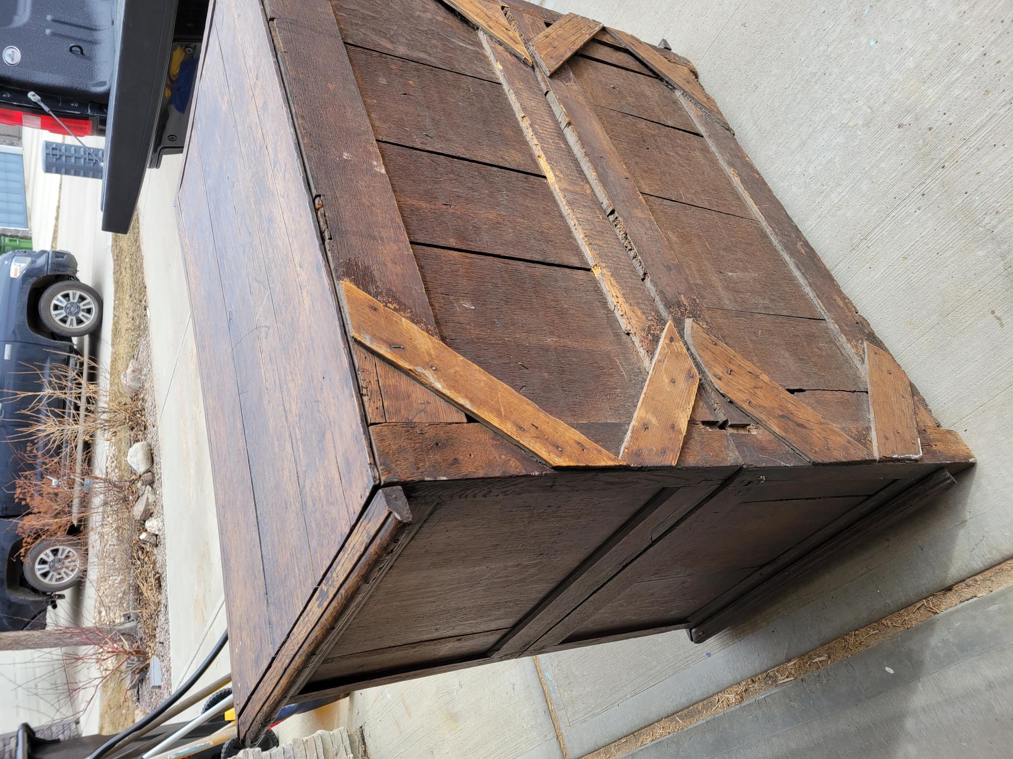 Two peice chest of drawers Bottom and top half stack one achother for easy portability. advertised as an 1800's sea captain's chest at the estate sale which could be a clue to some of its history.