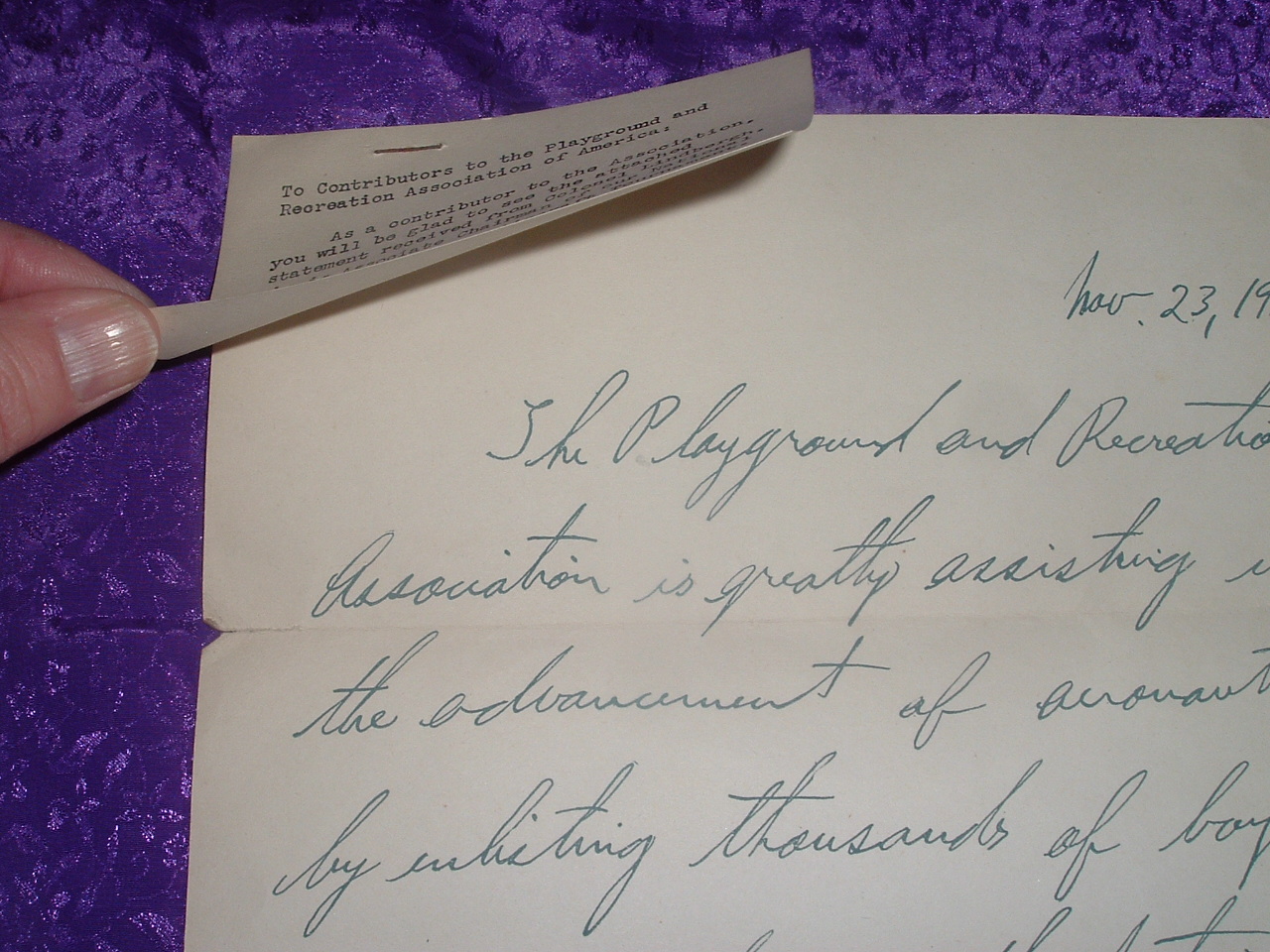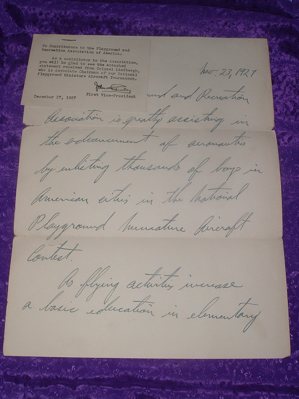 It has a stapled card on it To the contributors of the playground and Recreation Association of America. As a contributor to the association, you will be glad to see the attached statement received from Colonel Lindbergh, wo is Associate chariman of our National Playground Miniature Aircraft Tournament. December 17, 1927