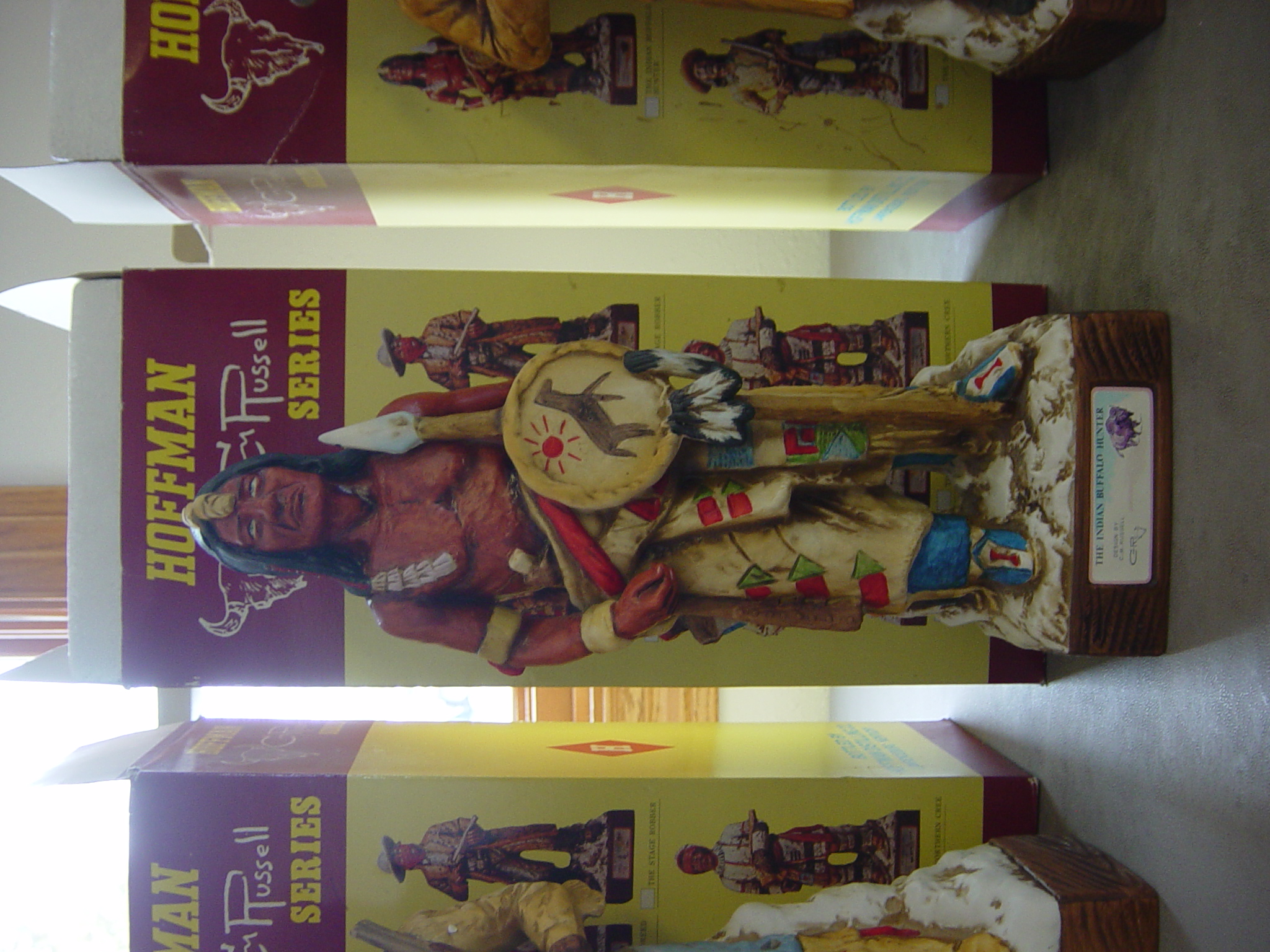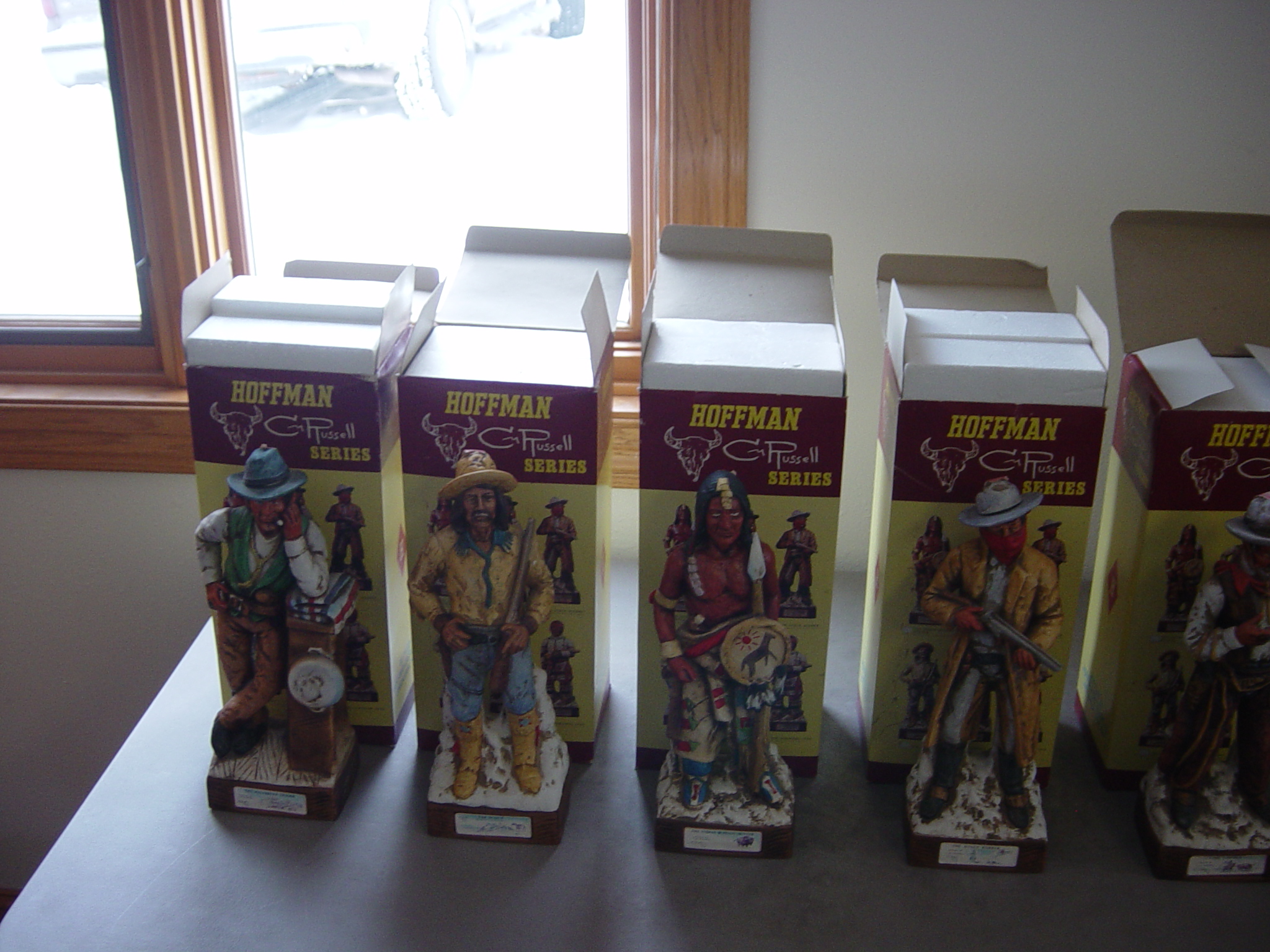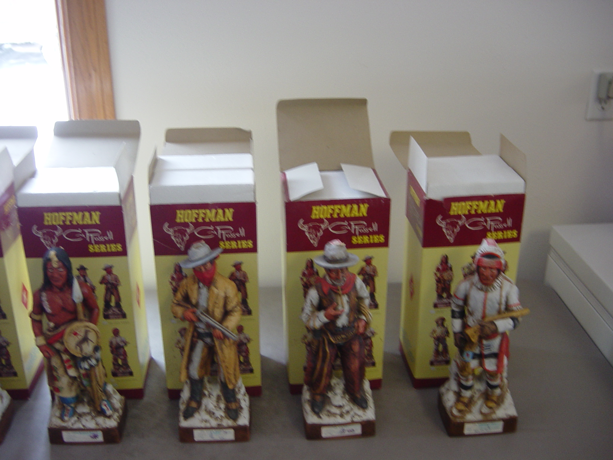 I have an original Charlie Russell Hoffman Series. This series consists of six different liquor bottles each with their own unique design. There is The Indian Buffalo Hunter, The Halfbreed Trader, The Stage Robber, The Scout, The Cowboy, and The Northern Cree. I have each one of these bottles. None of them have ever been opened and they are still in their original boxes. Each bottle still has it's tax paid seal in tact on the bottle. The date on the bottles is 1977. If you can use any more information just let me know.
