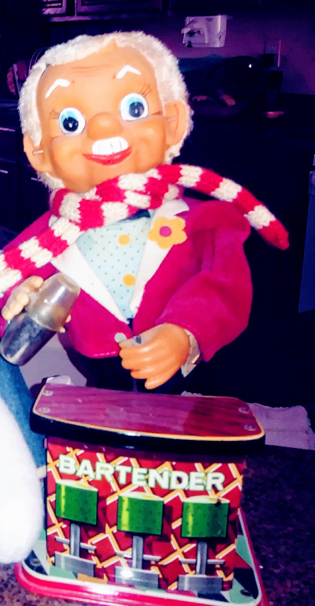 He shakes his martini shaker, pours into the glass, takes a drink, smacks his lips while his face turns red, and then blows smoke out of his ears. This Rosko tin toy takes 2 "D" batteries . with original box.