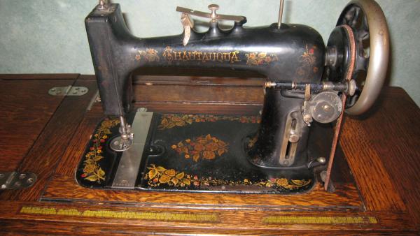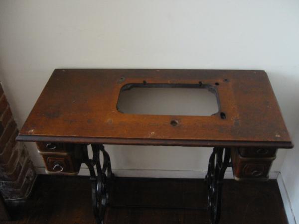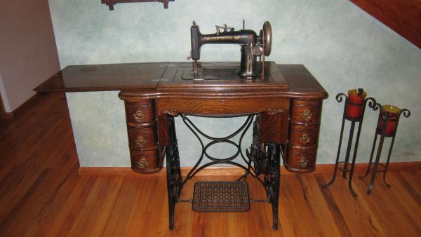 Center drawer with 3 drawers on each side. Skelton keys to lock drawers. Applique wood mouldings/decoration on cabinet. Gold floral decoration on machine. Measuring tape applied to surface in front of the machine.