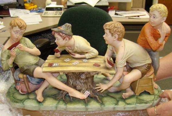 Large porcelain statue of four boys playing cards (and cheating) at a table on a large stump.