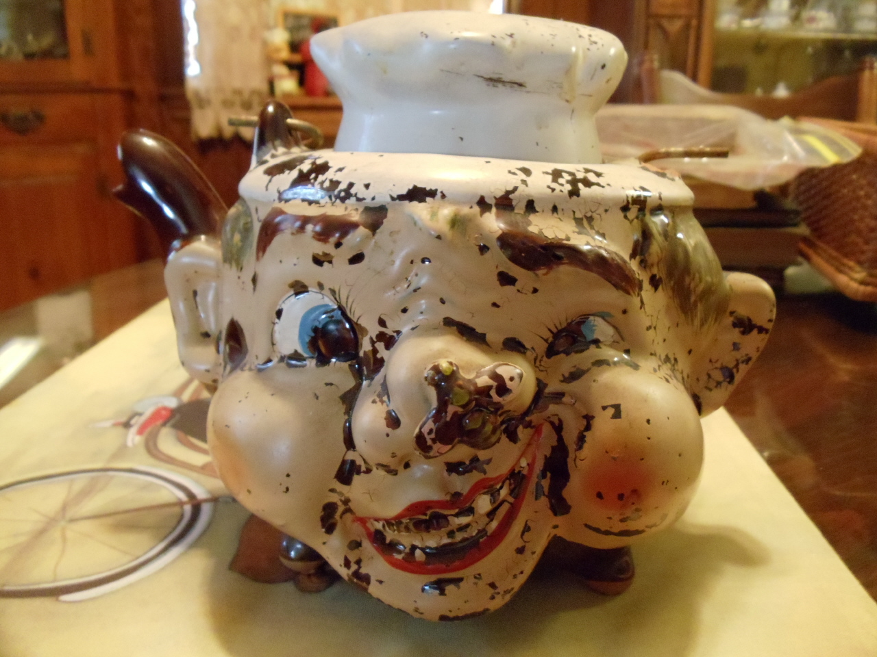 Chef head teapot. The top is white as a chef's hat usually is. The pot itself is brown with kind of a shinny finish.  It has a face with a fly on his cheek. It is a funny, kind of goofey face. It has a spiral handle that appears to have been brass colored, which now looks a little rusted out. It has four footed corners at the bottom.