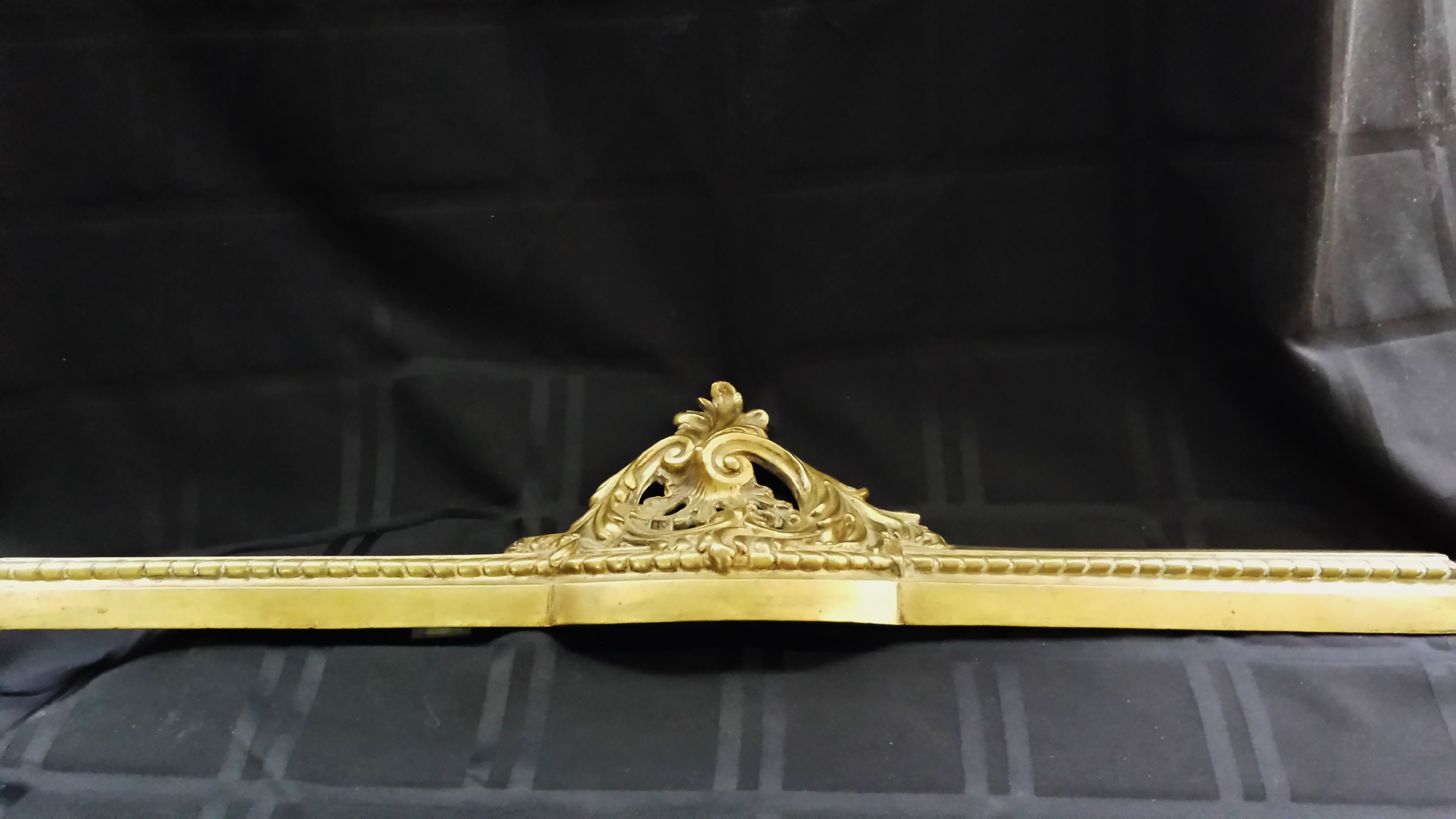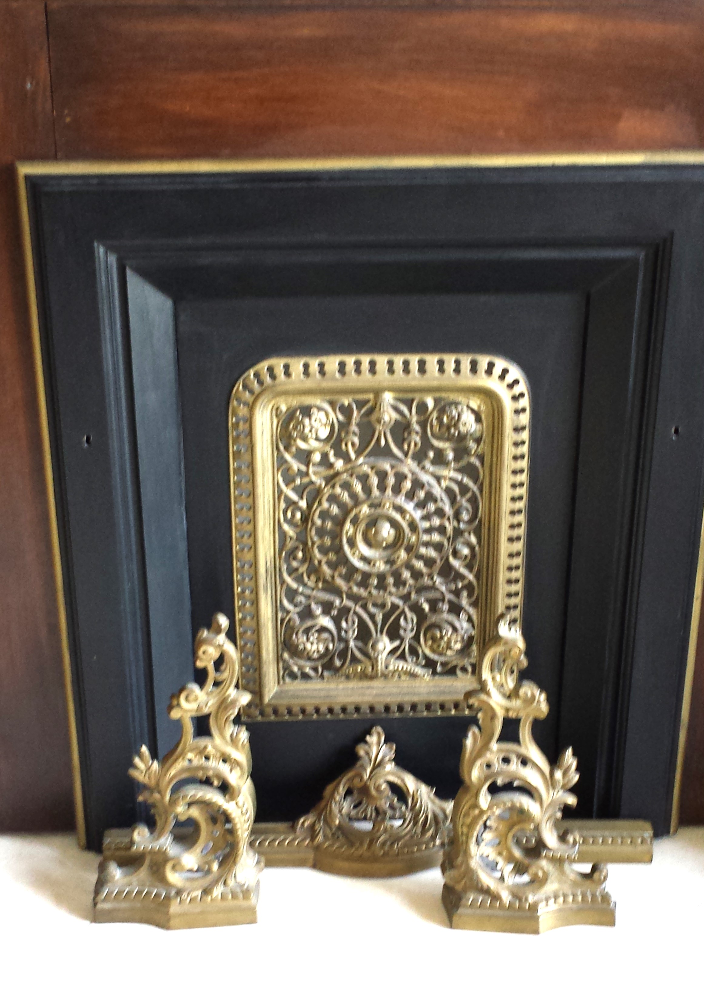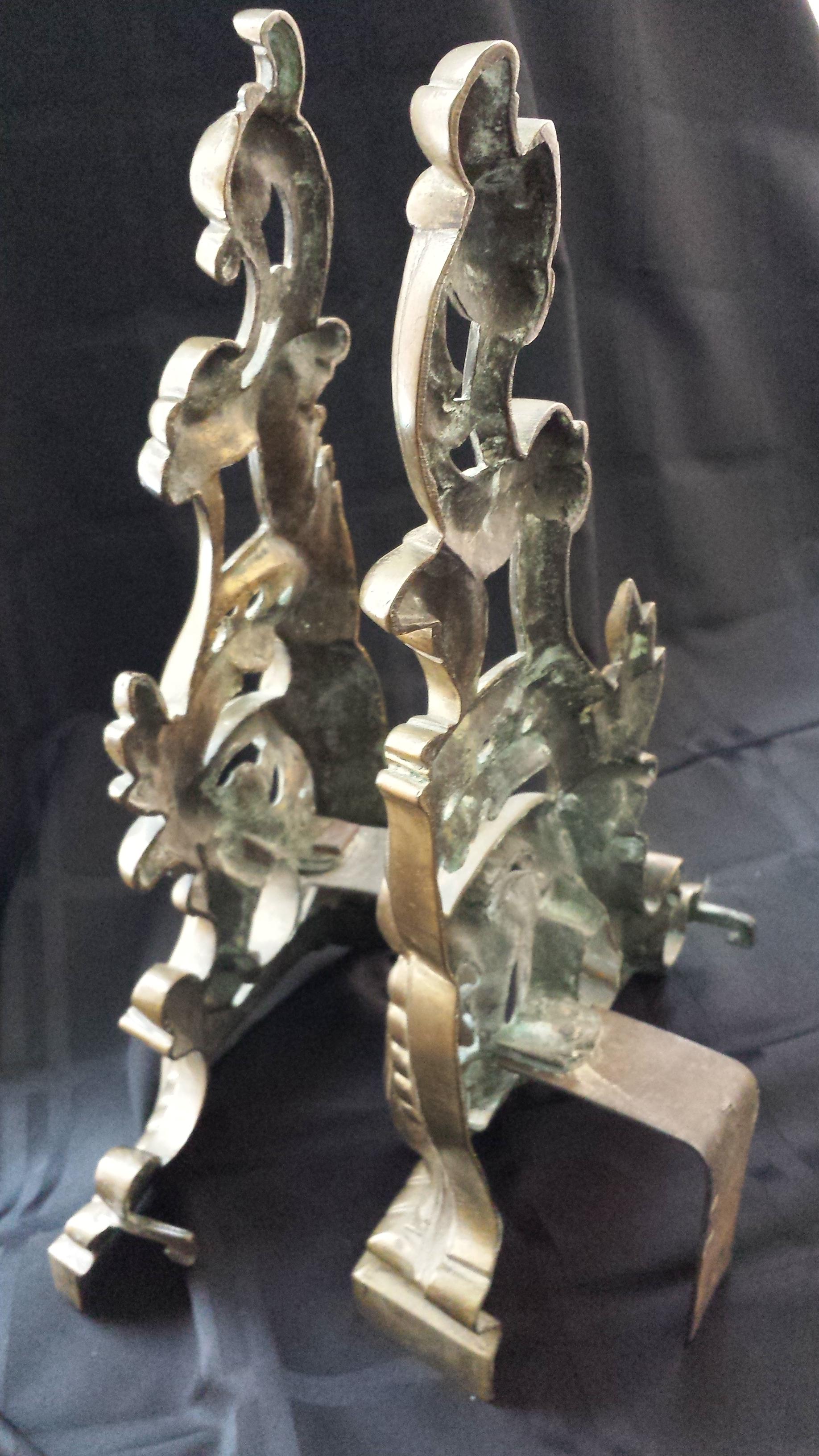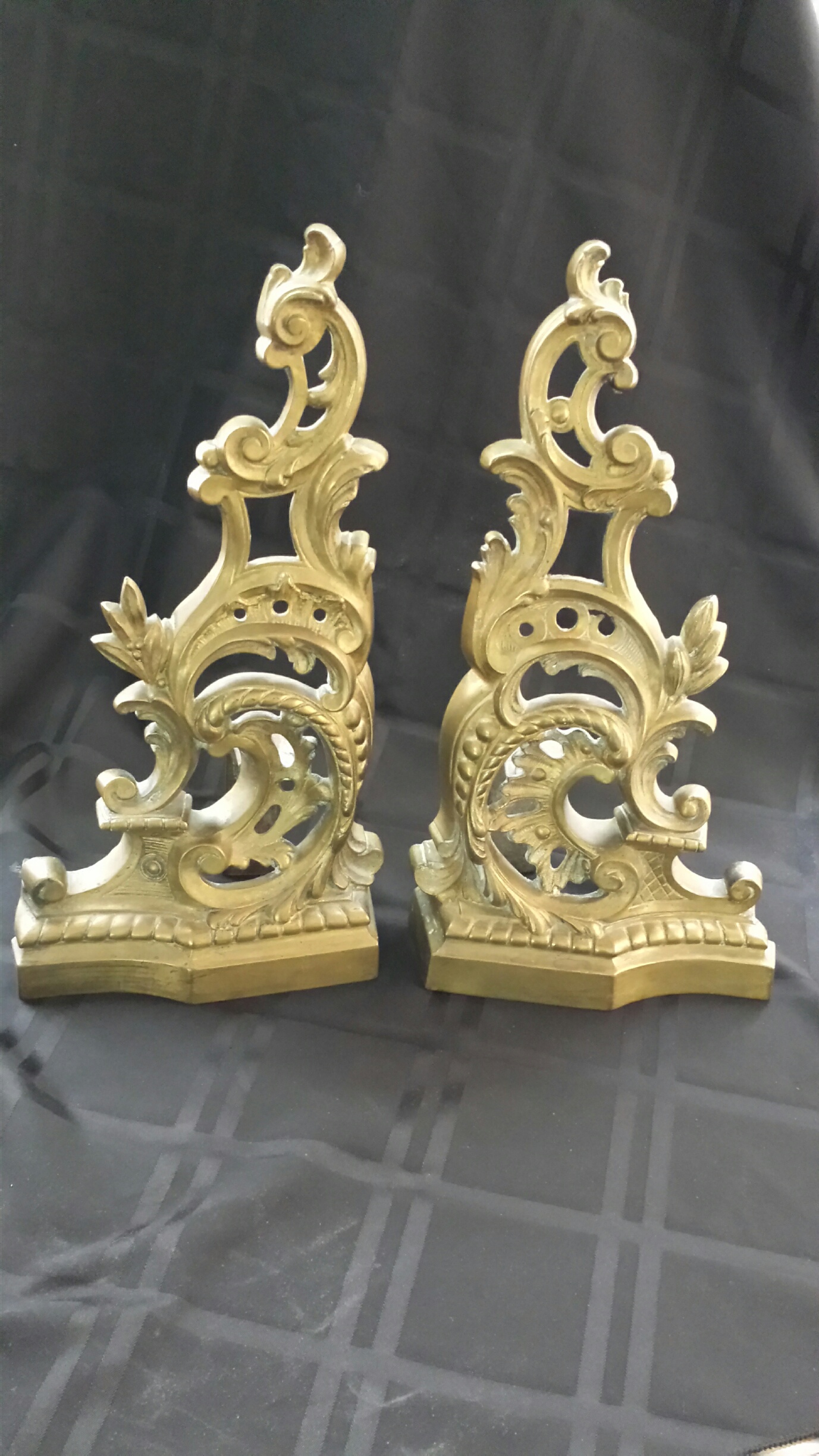 French Rococo Brass Chenet Andirons. Pictured in front of fireplace mantel and individually.