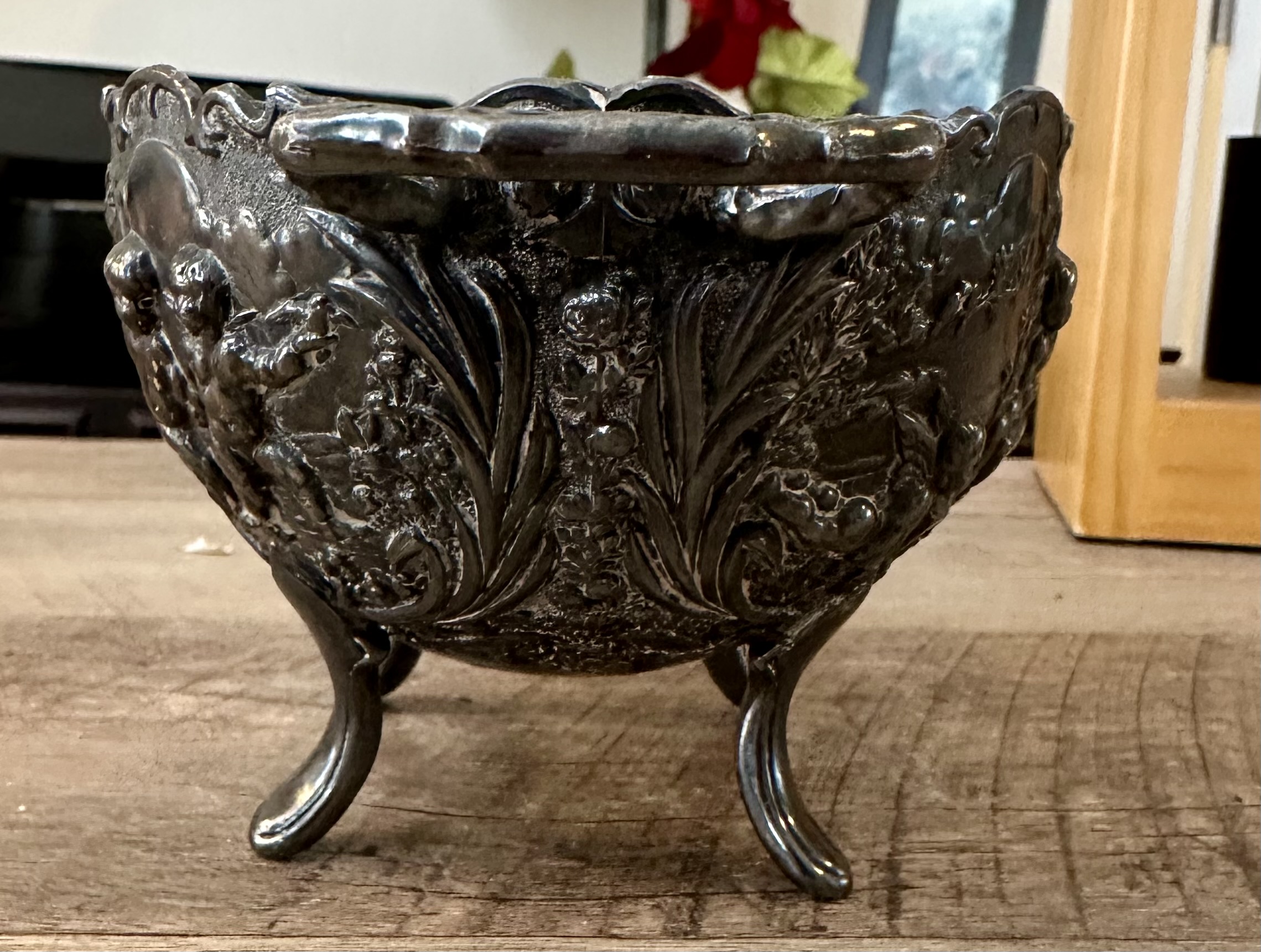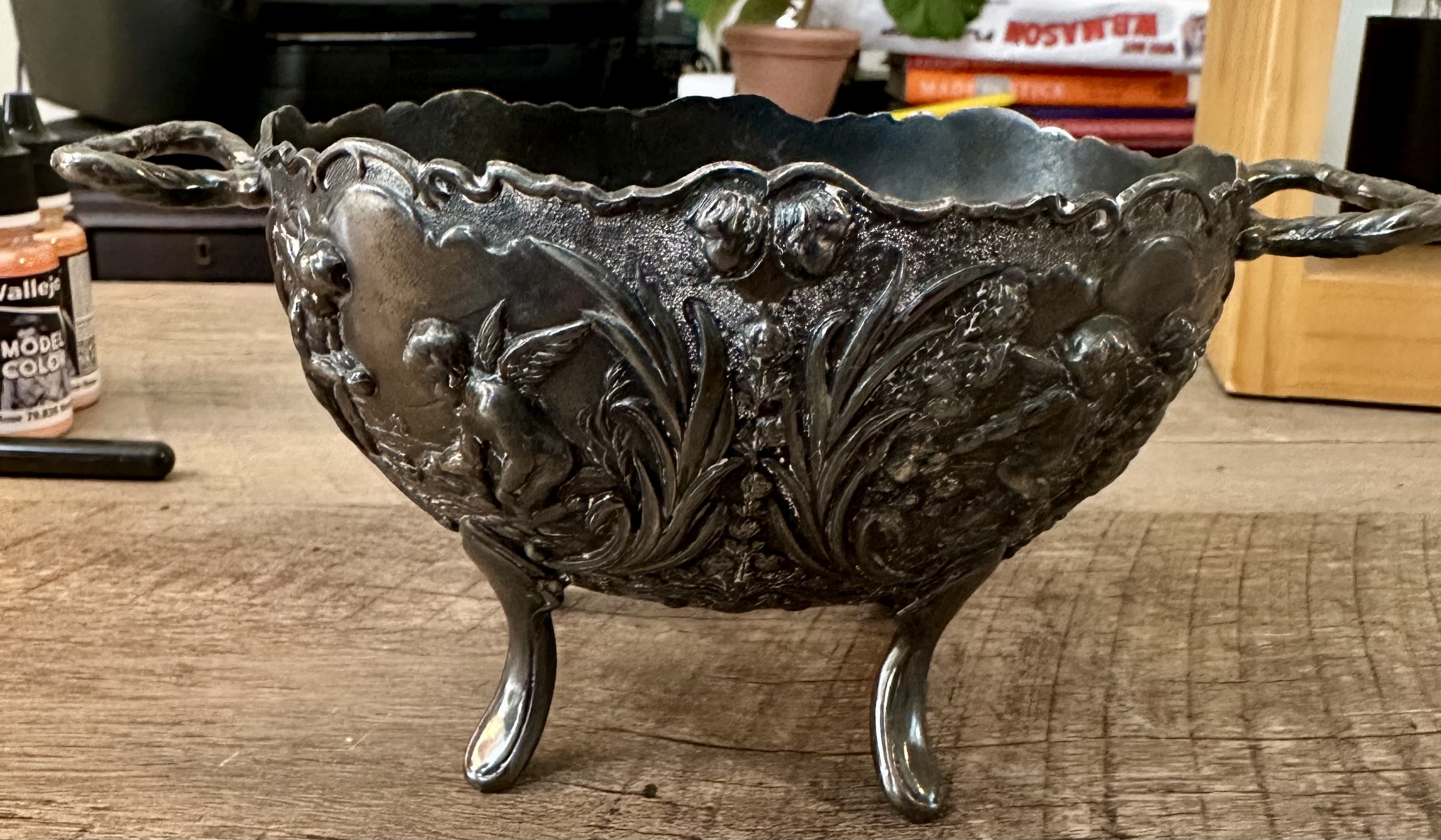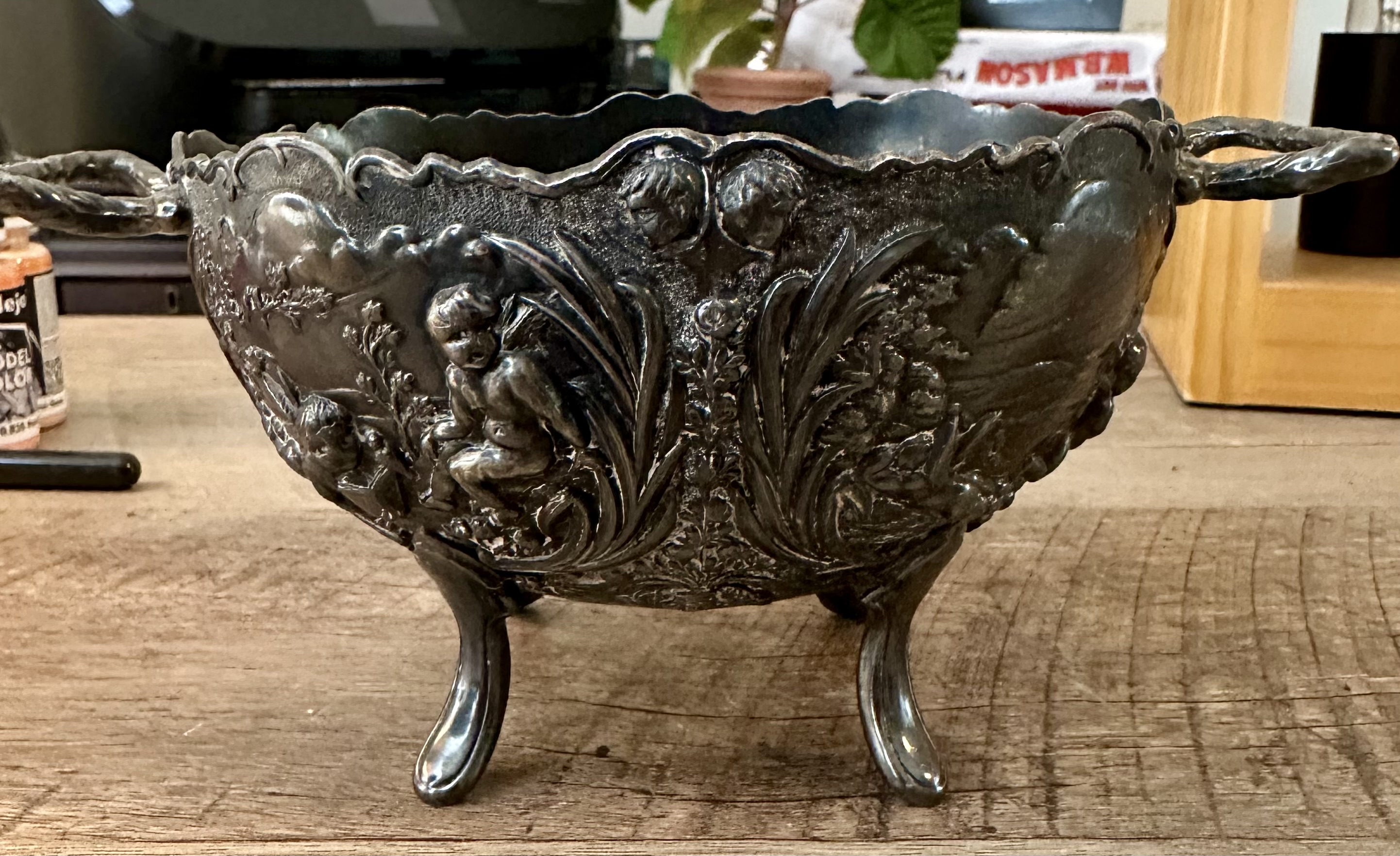 The item is a decorative bowl featuring cherub motifs and floral designs. It is made of metal, likely silver-plated, given its shiny appearance and ornate detailing. The bowl has a scalloped rim and is supported by three elegantly curved legs. The dimensions are approximately 10 inches in diameter and 5 inches in height. The bowl has two handles on either side, enhancing its aesthetic appeal.