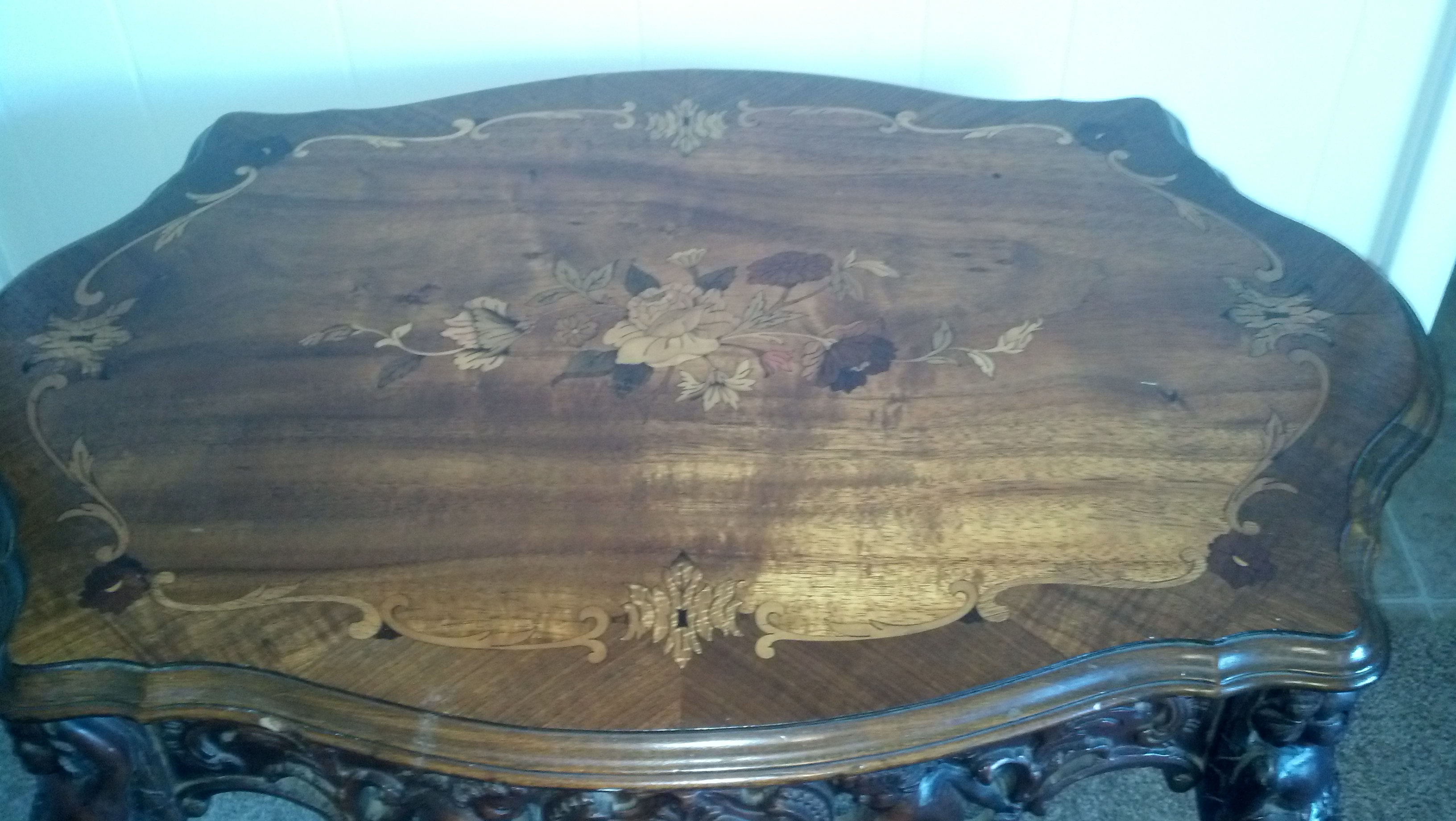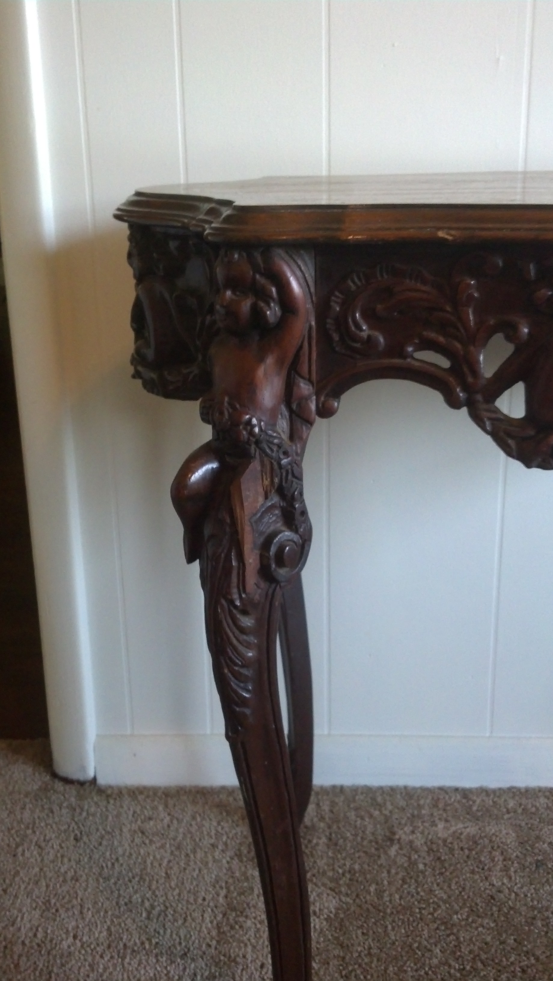 Re: cherub carved legs and sides with inlay top foyer table