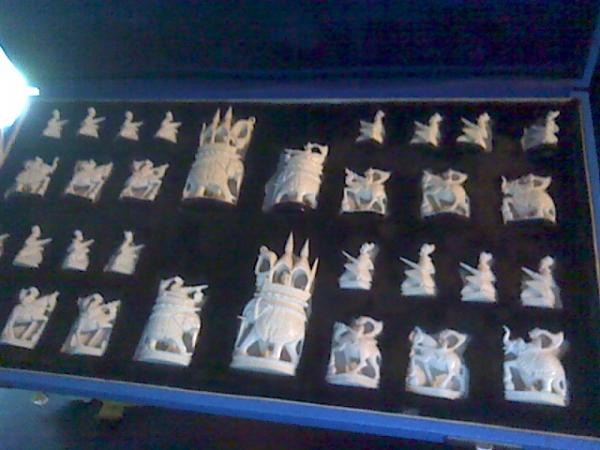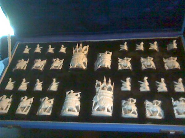 not sure ... but  I believe this is part of a chess set ... this is all i have of it .. 32 pieces of ivory very very detailed  in A  velevet lined box ...would love some on it .. Im sure we would like to sell if it is worth it ..