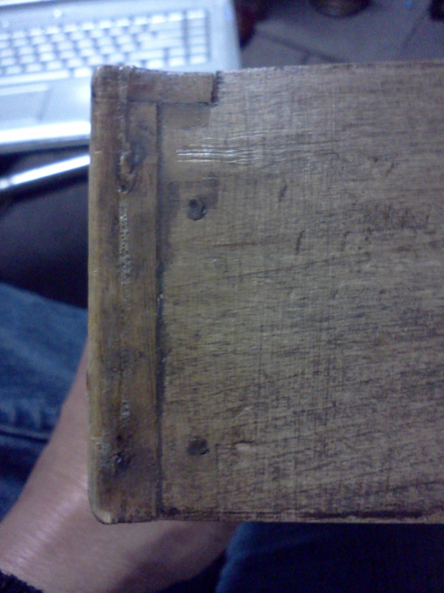 Inlaid chess table with carved border around the top. Two drawers, one on each side. In very good shape, sturdy. Only flaw is one of the drawer bottoms looks like it was made too short, but all original, I am sure.