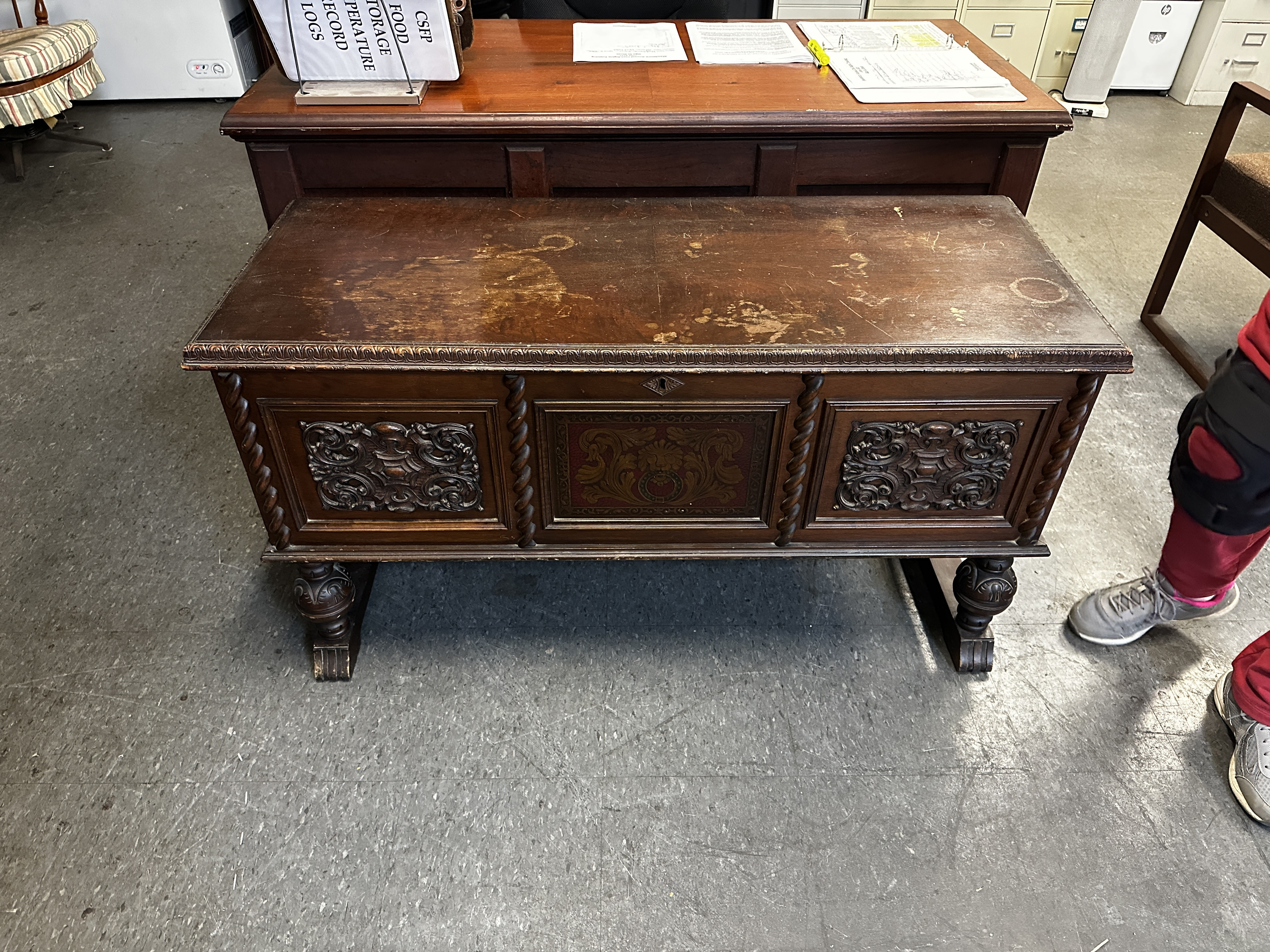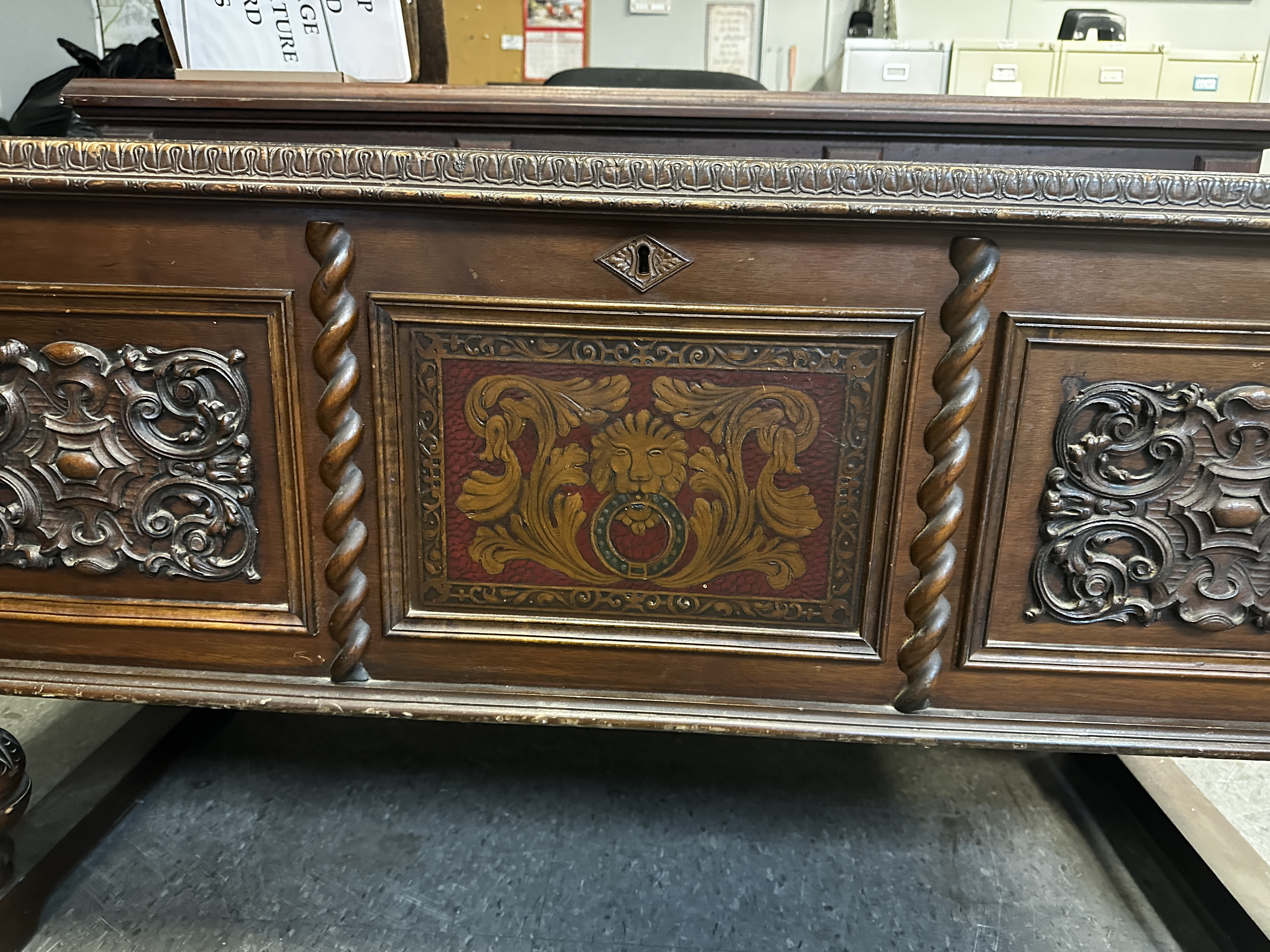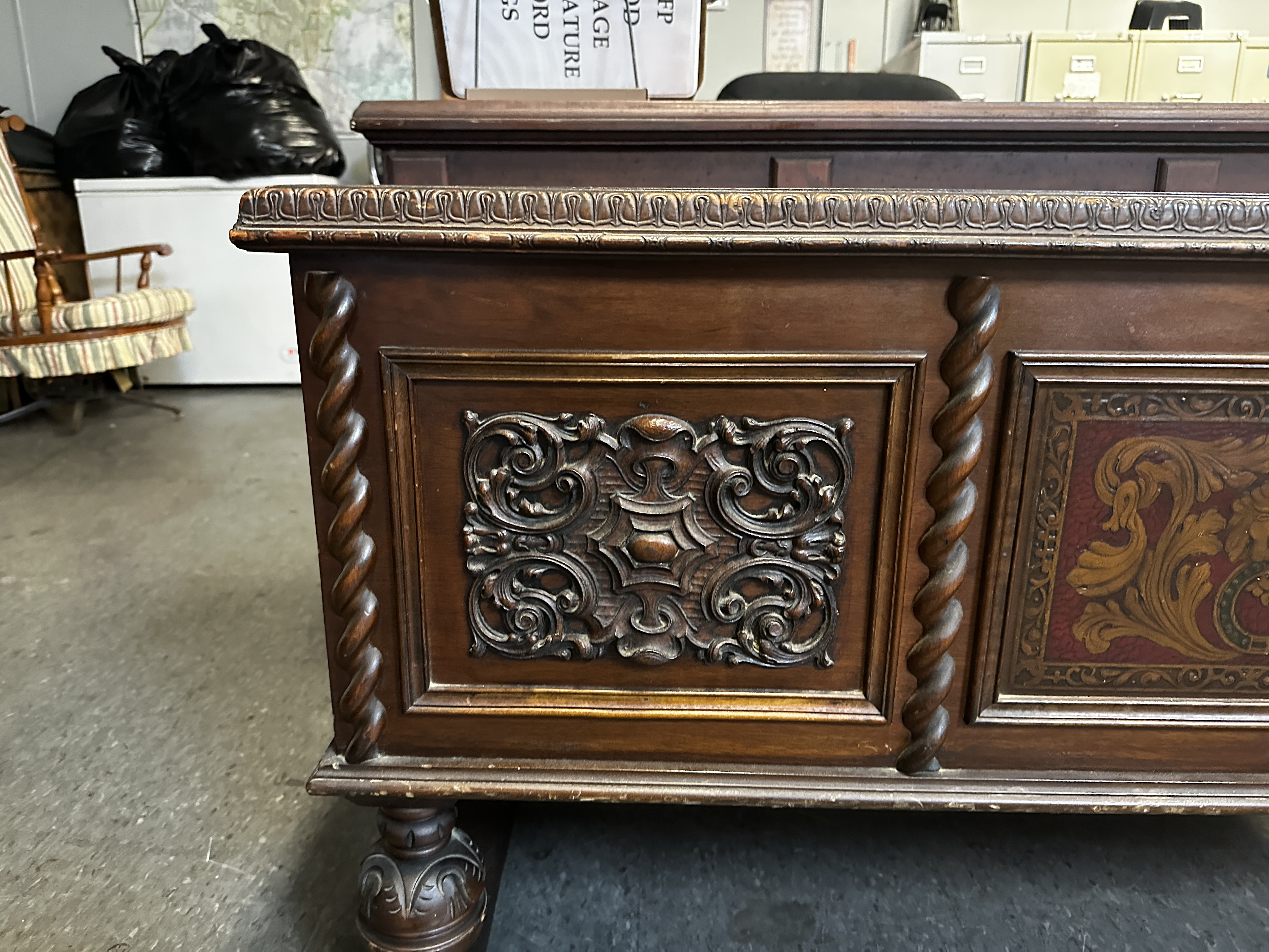 The Ed Roos Company was one of the most prolific cedar chest manufacturers in the United States. At its peak, it was producing up to 1,000 chests a day from its massive factory in Forest Park, Illinois. Roos chests were especially known for blending utility and elegance, often with ornate or painted panels and hand-finished carvings, as seen in your example.
