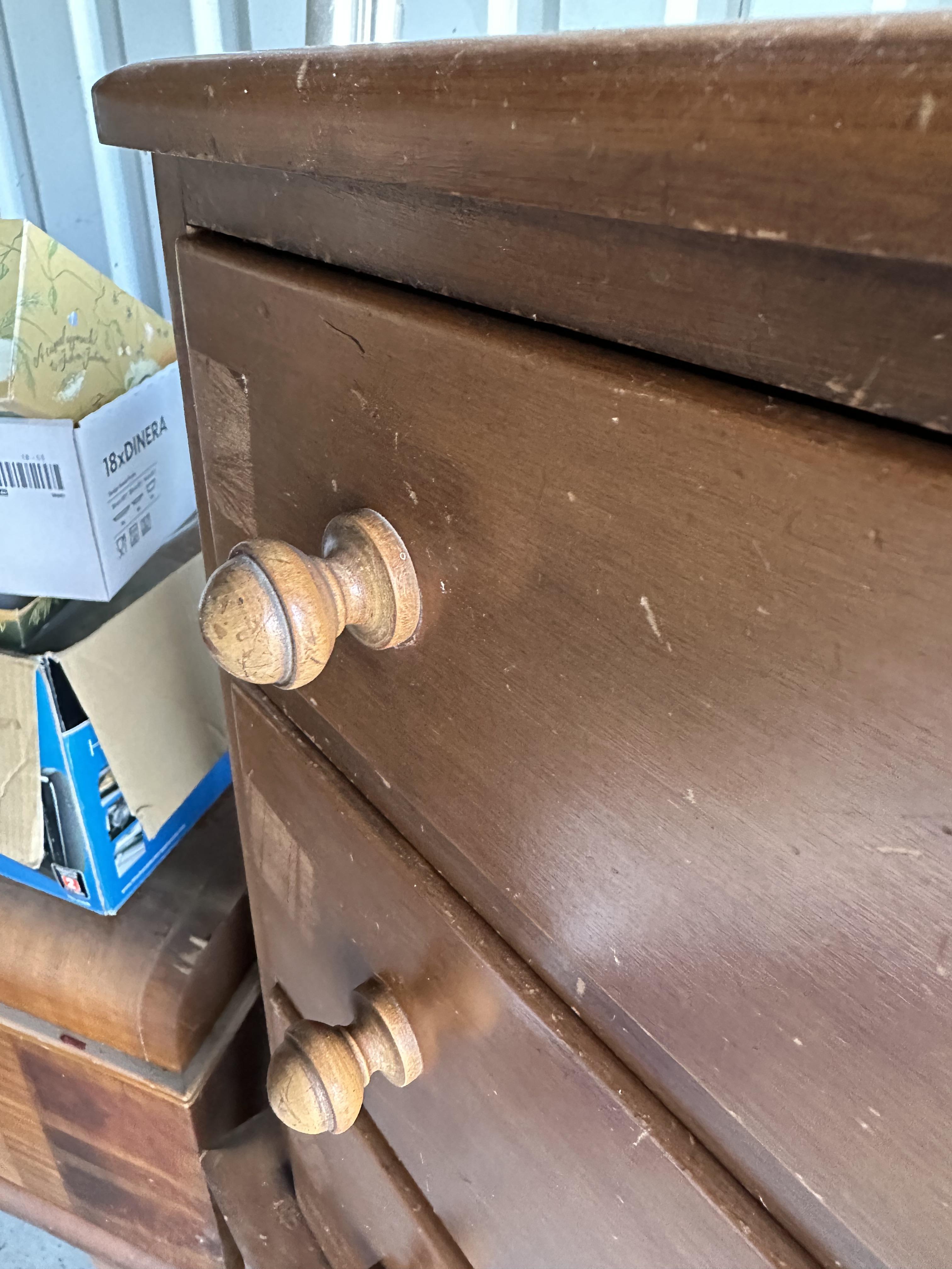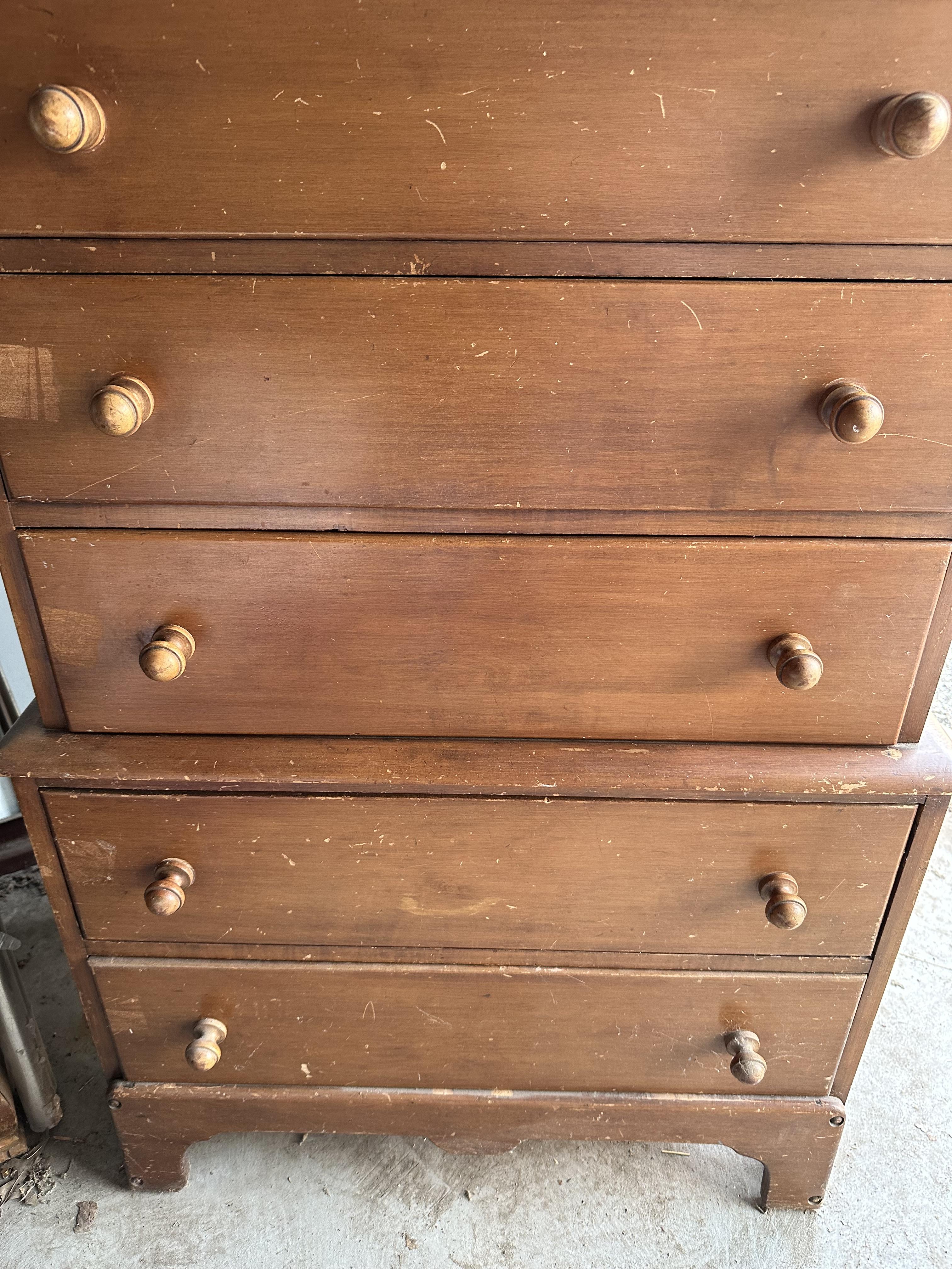 Chest on Chest, 5 drawers - 3 on top and 2 on bottom. Sticker on back of cabinet says Davis Cabinet Company, Nashville Tennessee, Stock Number 440, Finish Maple.