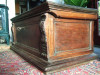 My fiance bought this from his friend. There is no known history or origin not exactly sure of the material either. I'm guessing wood and tin but not sure. There were leather handles on both sides but one has broken off. The lock on the front says corbin lock New Britain Conn. The inside tray is missing and it smells like rotten wood. Could you give an estimated value as it is and would it lose value restored? We will most likely be listing it for sale.
