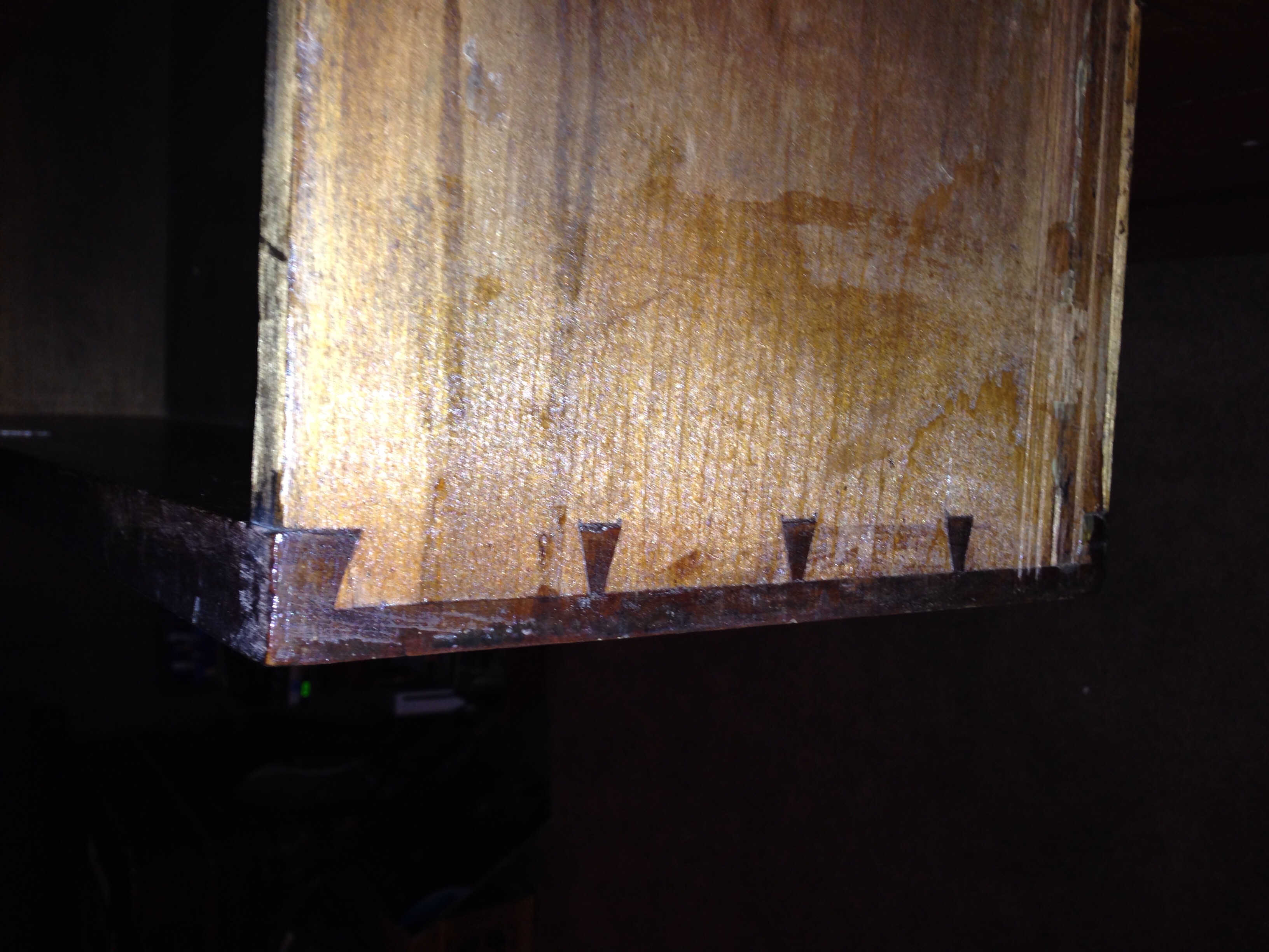 Chest with larger top drawer. All solid wood throughout no veneers anywhere. Finish is old but Not checked, cracked peeling minor surface scratches. Appears to maybe be made of poplar with a  cherry stain. One pic attached of the chest one of the type of construction on the dovetails on the drawers.