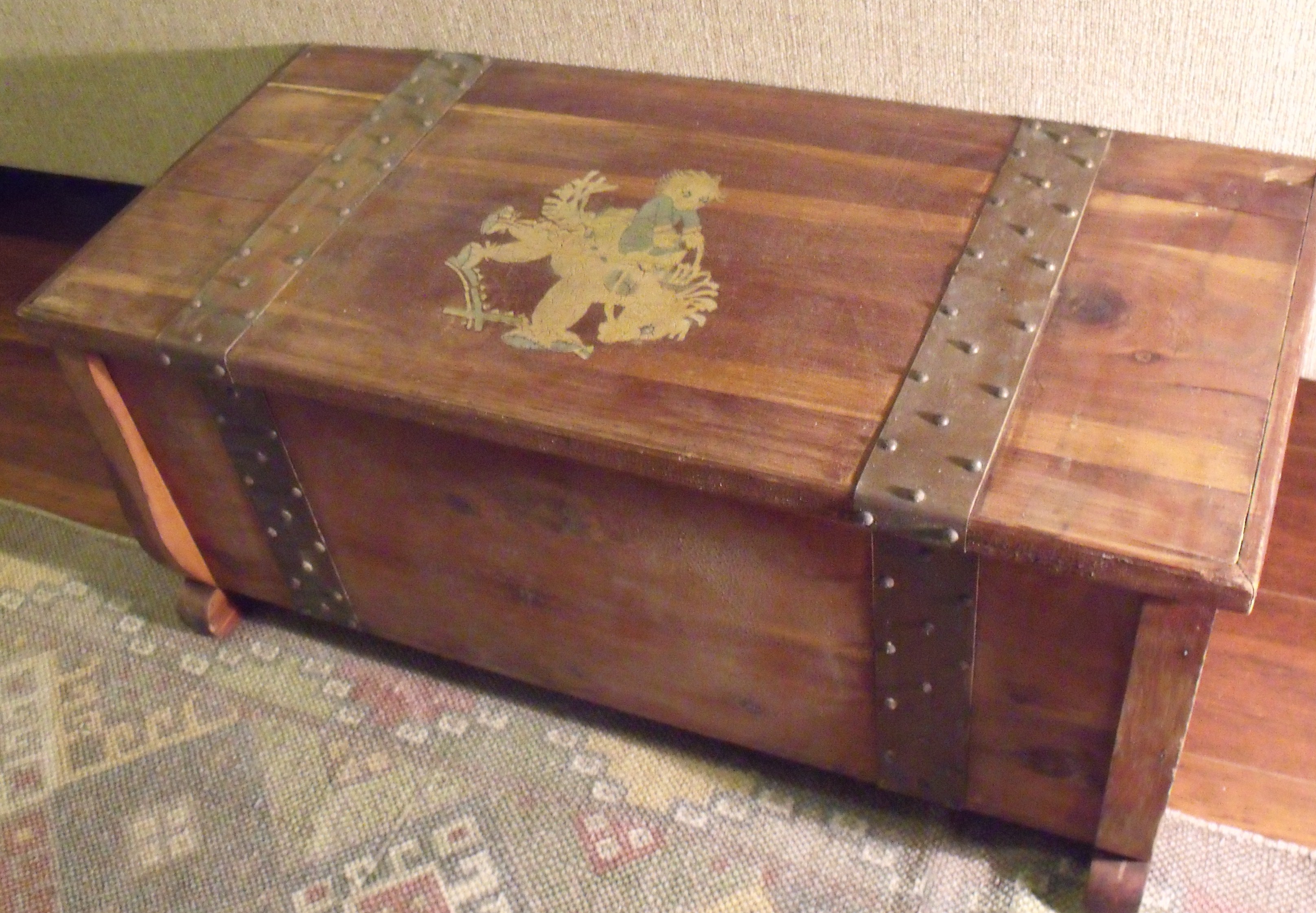I was recently given a small chest (about 36" x 12" x 12" or so), with a painting on top of a child riding a horse. The paint has crackled over the years and faded, but is in rather good condition. The chest looks to be made of cedar. It also looks as though there used to be another painting on the front that has worn off over time. There are (copper?) straps and wooden handles. All in reasonably good condition. I would guess from the painting, it might be from the 30s? Any idea what I've got here?