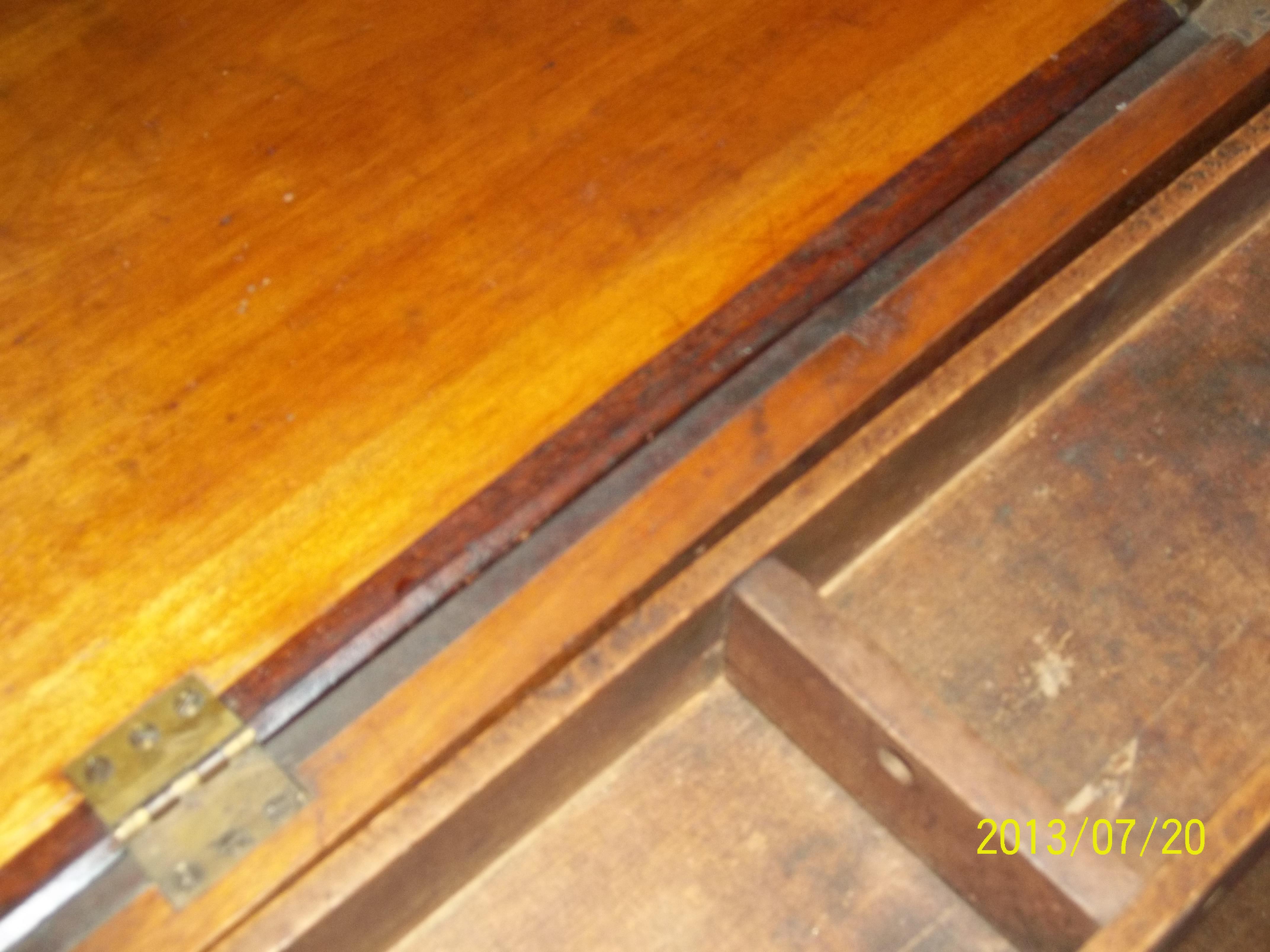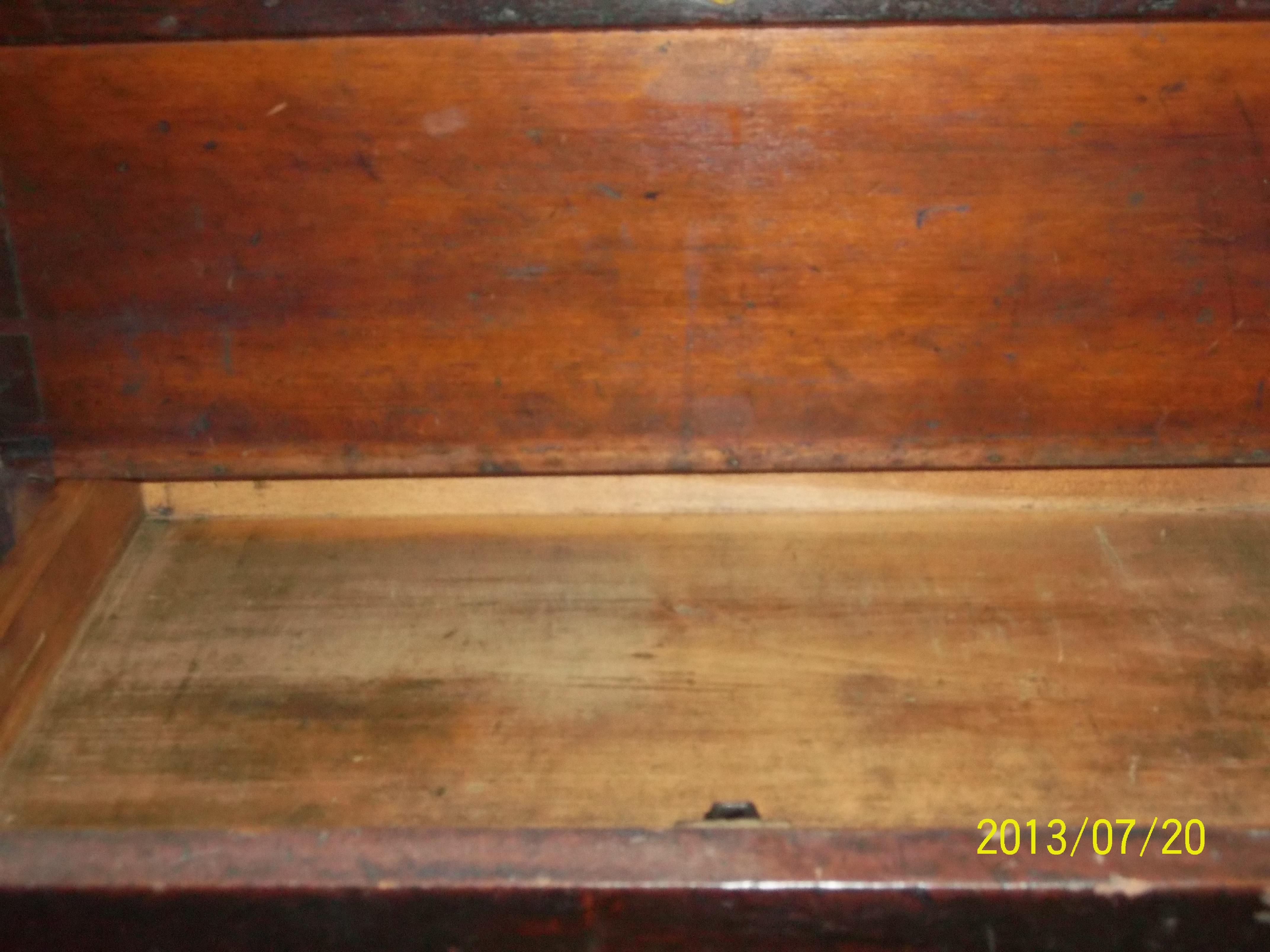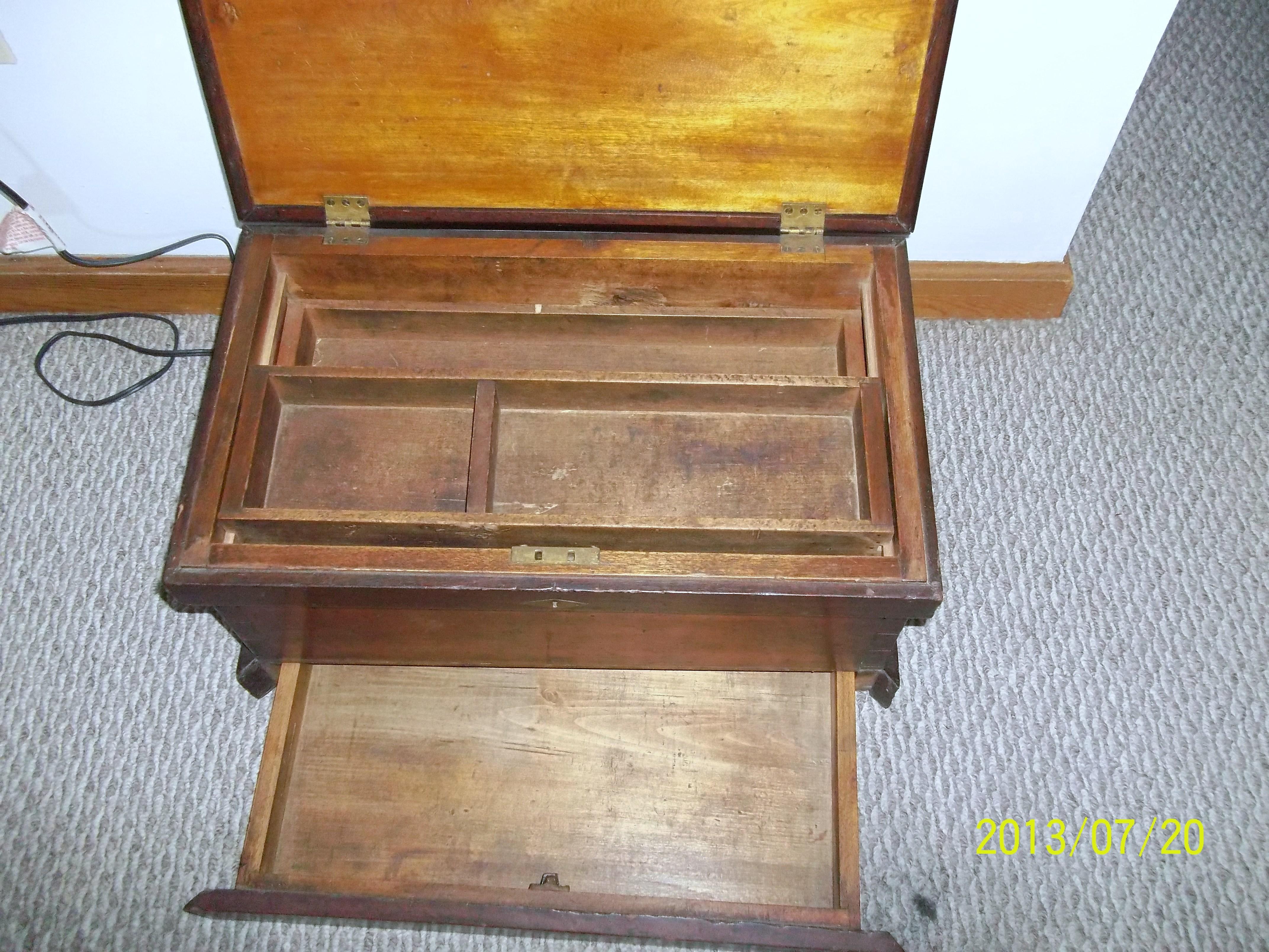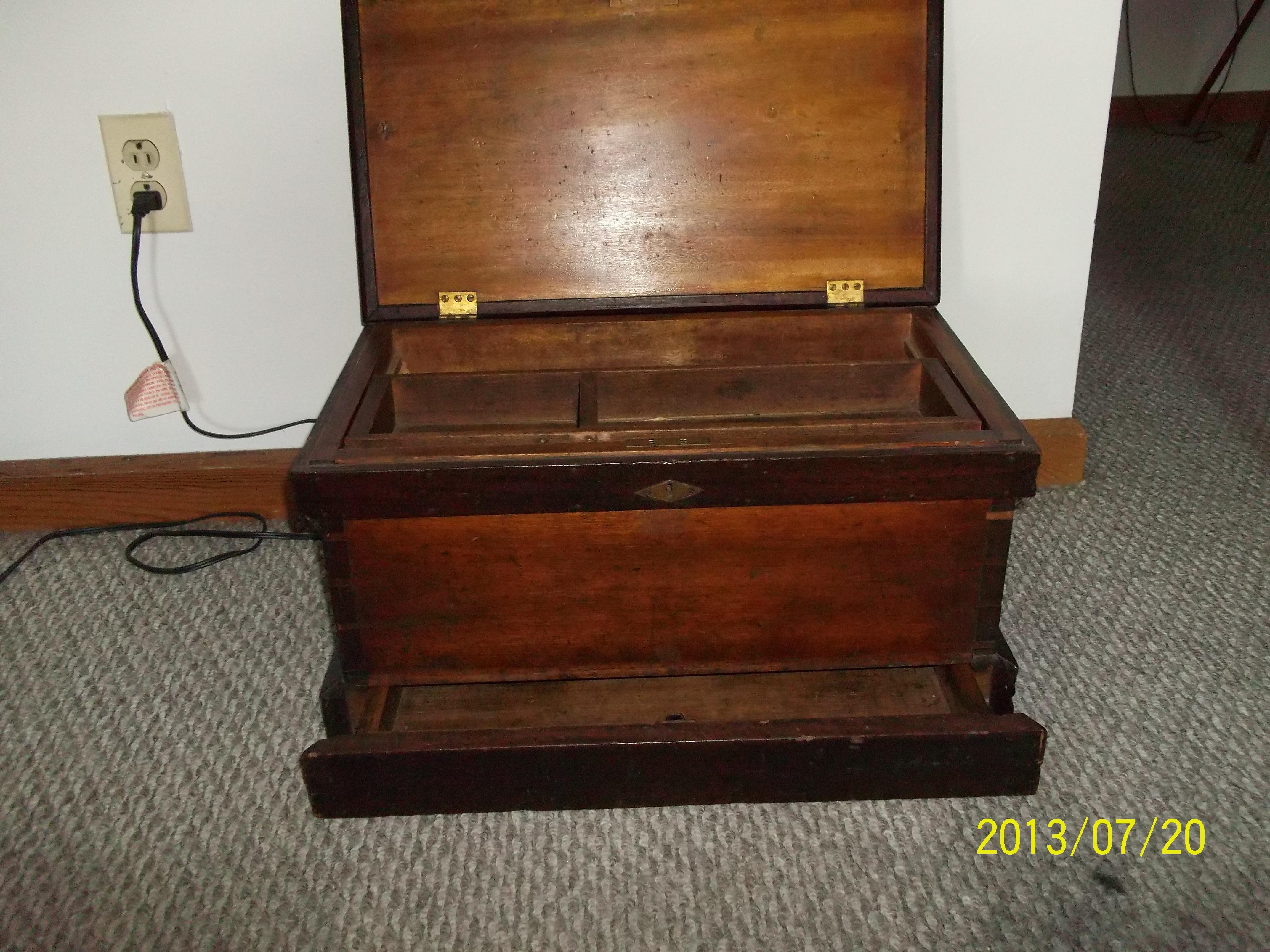 inherited this chest from my brother,inside dimensions 19 inches long, 10 inches wide,7.5 inches deep. has secret drawer, opens from inside at bottom by pulling up on a knurled knob,has 2 sliding drawers. dovetailed,do not know what type of wood it is made from,had it appraised on line which i paid for appraiser told me it was a factory made tool box,to me it appears to be hand made.it is fairly heavy for it's size .Over the years i have scoured the internet,lots of antique guides have never come across any chest resembling it or similar to it. i am interested in selling it but have no idea of what it is worth any help would be greatly appreciated