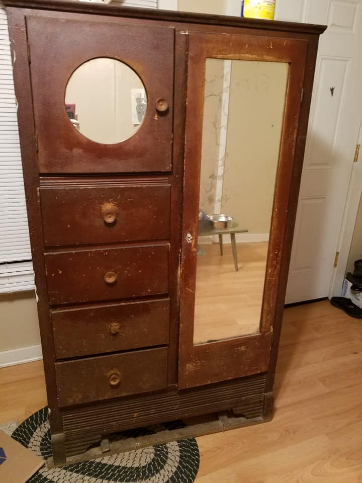 I'm new here and I just have some questions. My great grandfather's farm house is scheduled to be demolished next week and I have acquired this chifferobe that belonged to him. I have searched and cant find any information about a piece like this. I have found similar pieces with square mirrors where the round one is but nothing with a round mirror. I know its is pretty rough shape and I want to restore it as best I can. I guess my questions are does anyone know anything about how old this is, where it came from or anything? And any advice on restoring it? Should I strip the finish or try to save it? I'm new to antique furniture so any help would be greatly appreciated. Thank you!