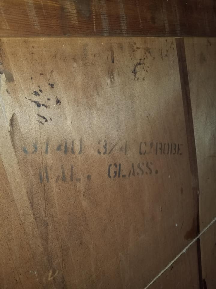Distinguishing marks round mirror on the door of the hat cabinet, it also says 3140 3/4 C'ROBE WAL. GLASS. on the back of it