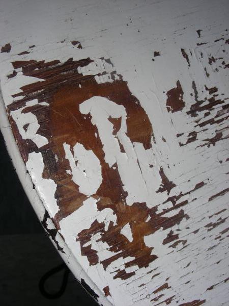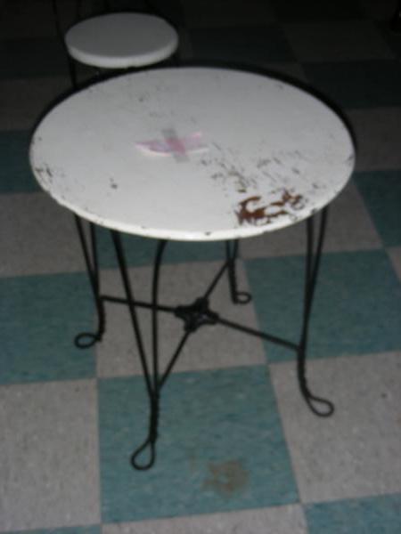 Other than the peeling paint this table is in excellent condition - ni rust, no weak points in the legs of the table or chairs. (Which look like wrought iron but I am not sure.)