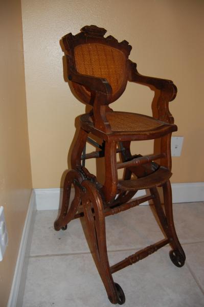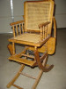 Wood highchair with wicker seat and back. Chair converts into a child rocker. Very little information is known to us about this item. I am looking to find out more about this item