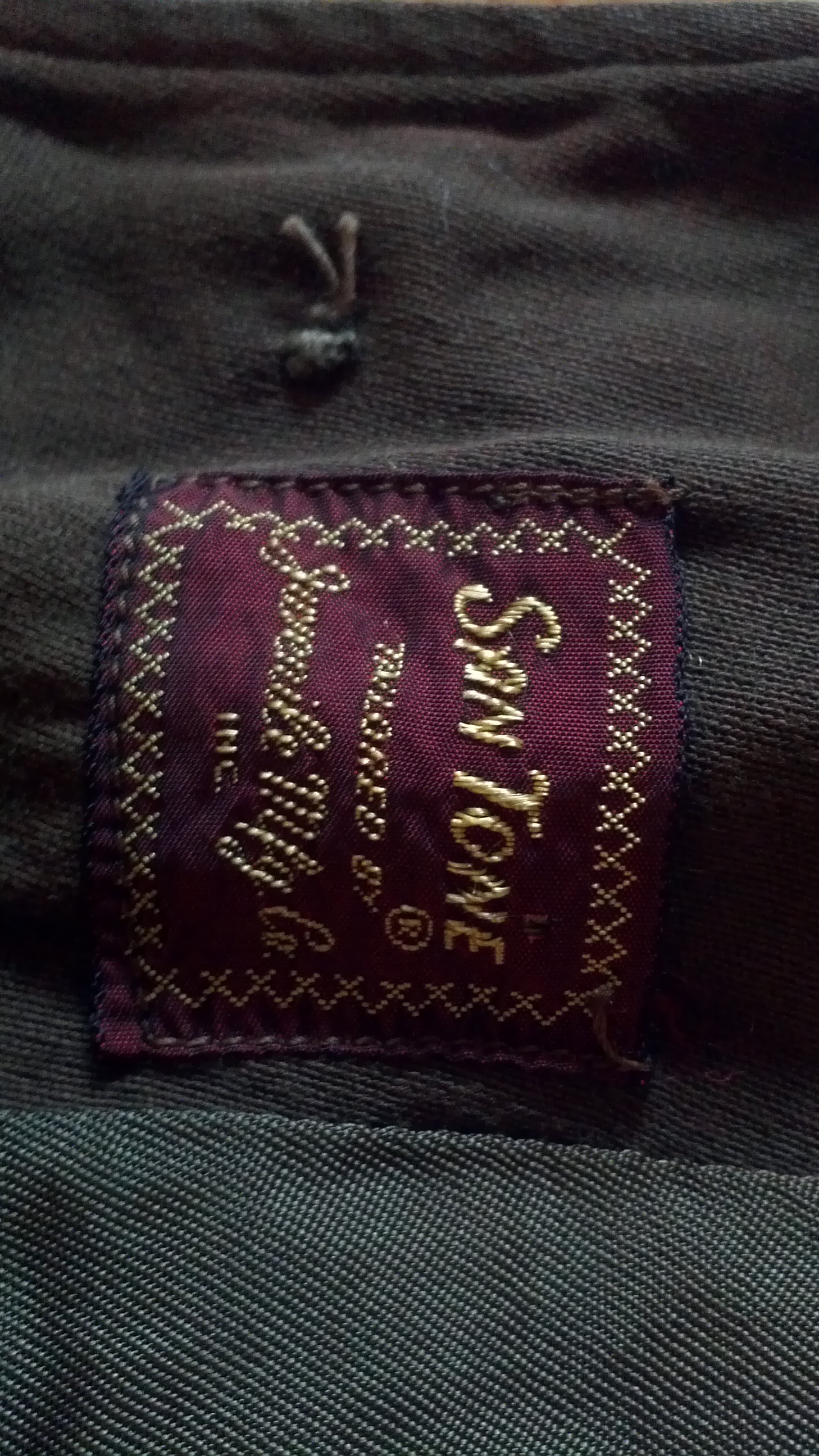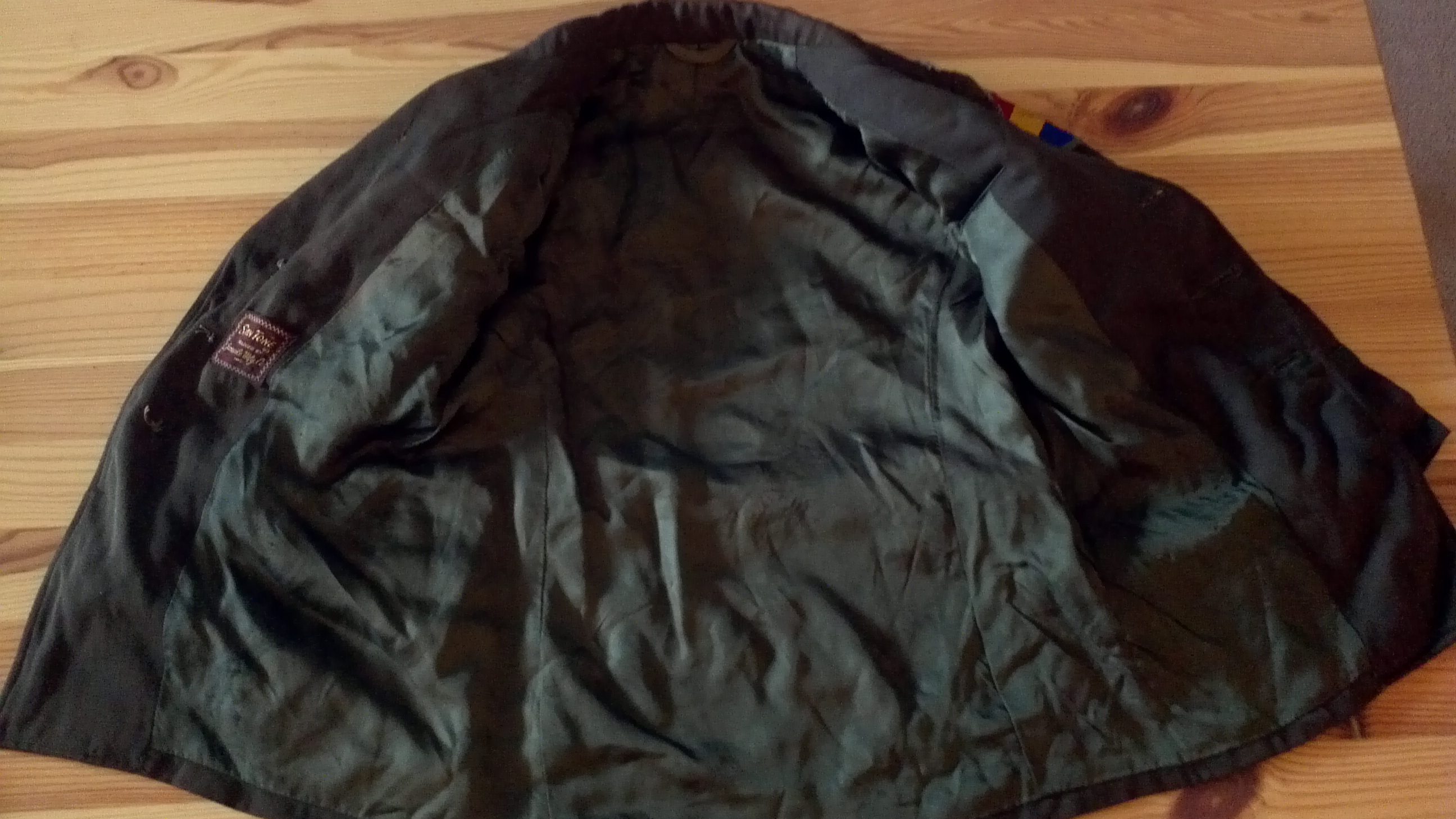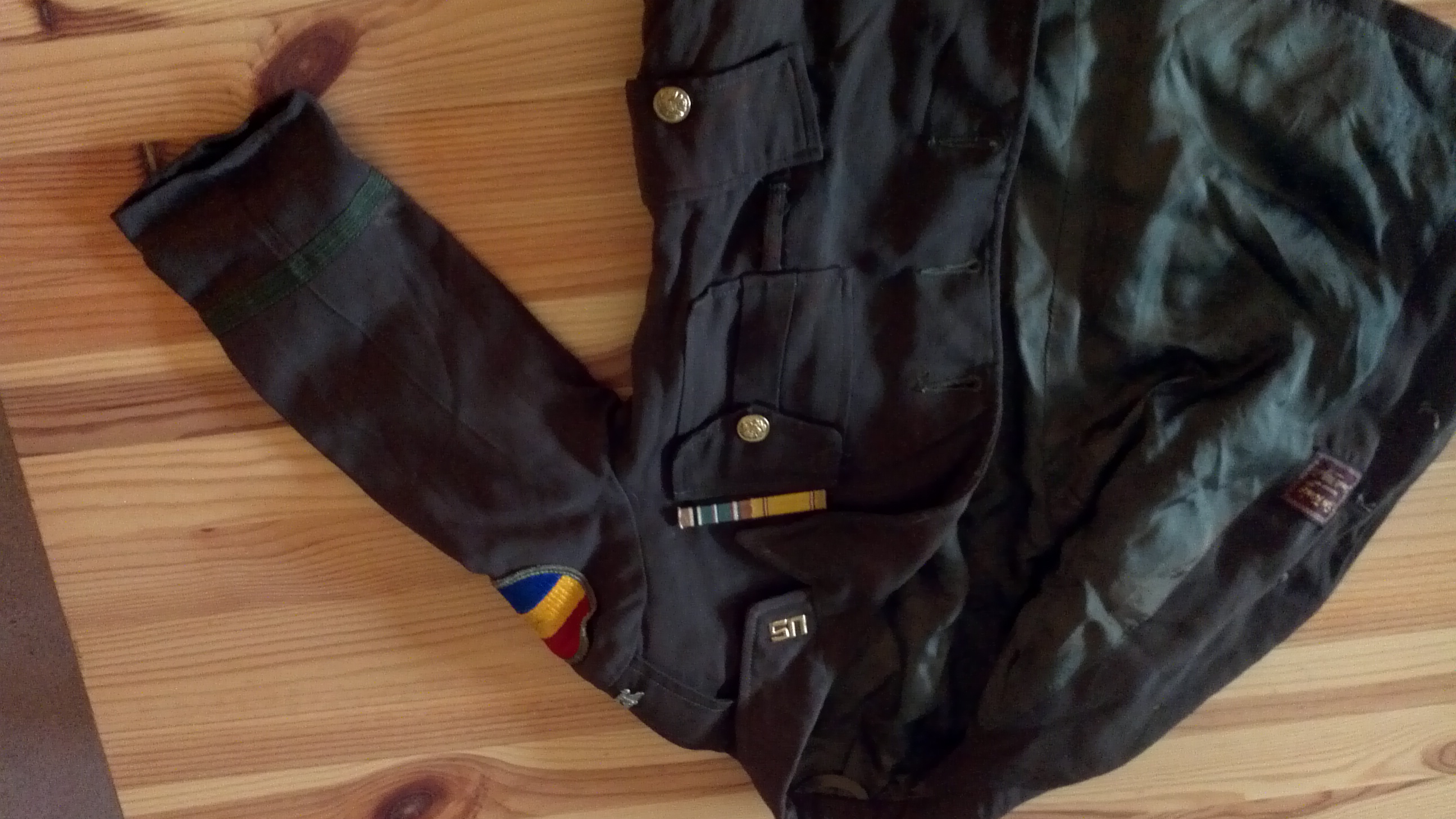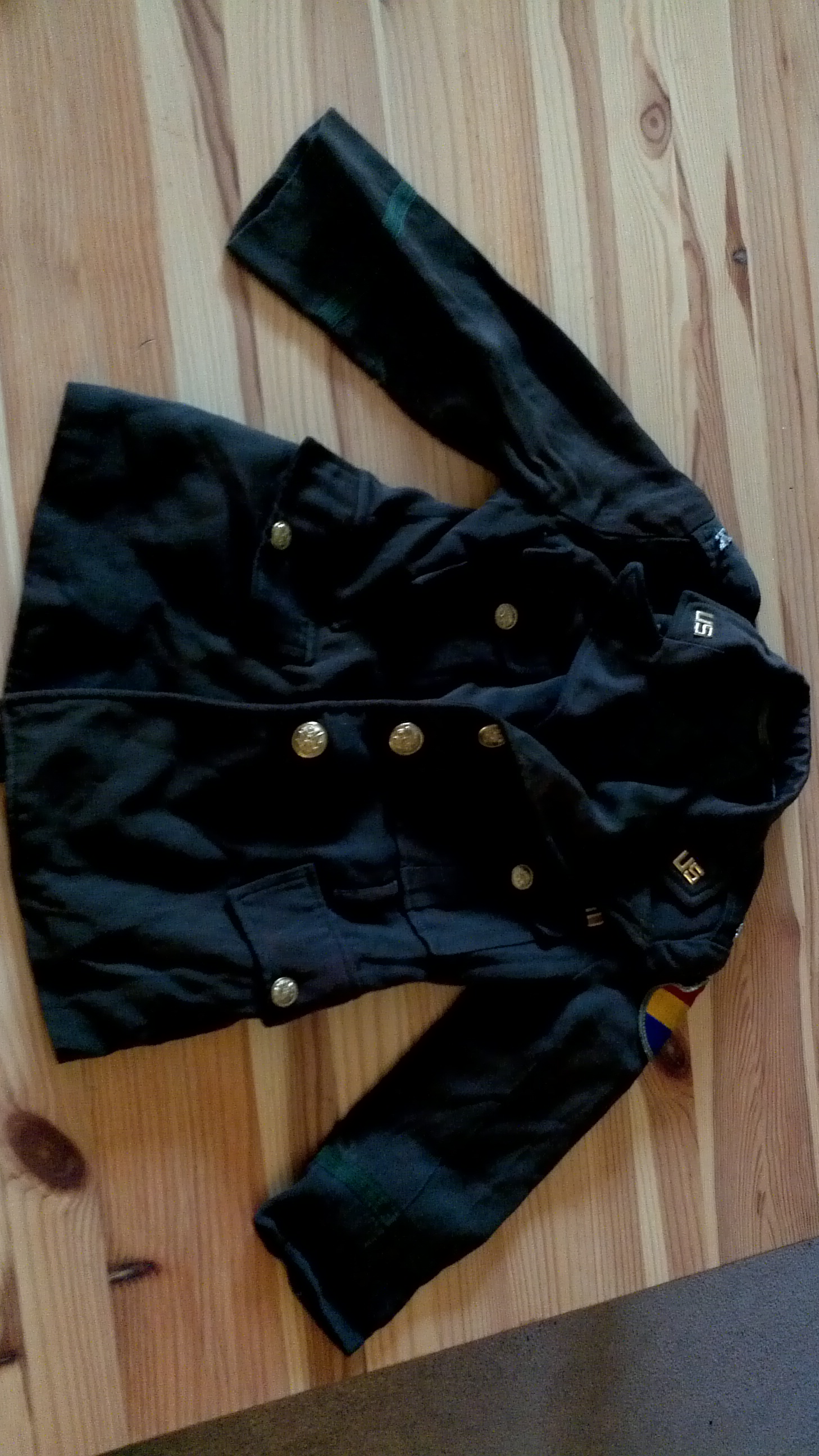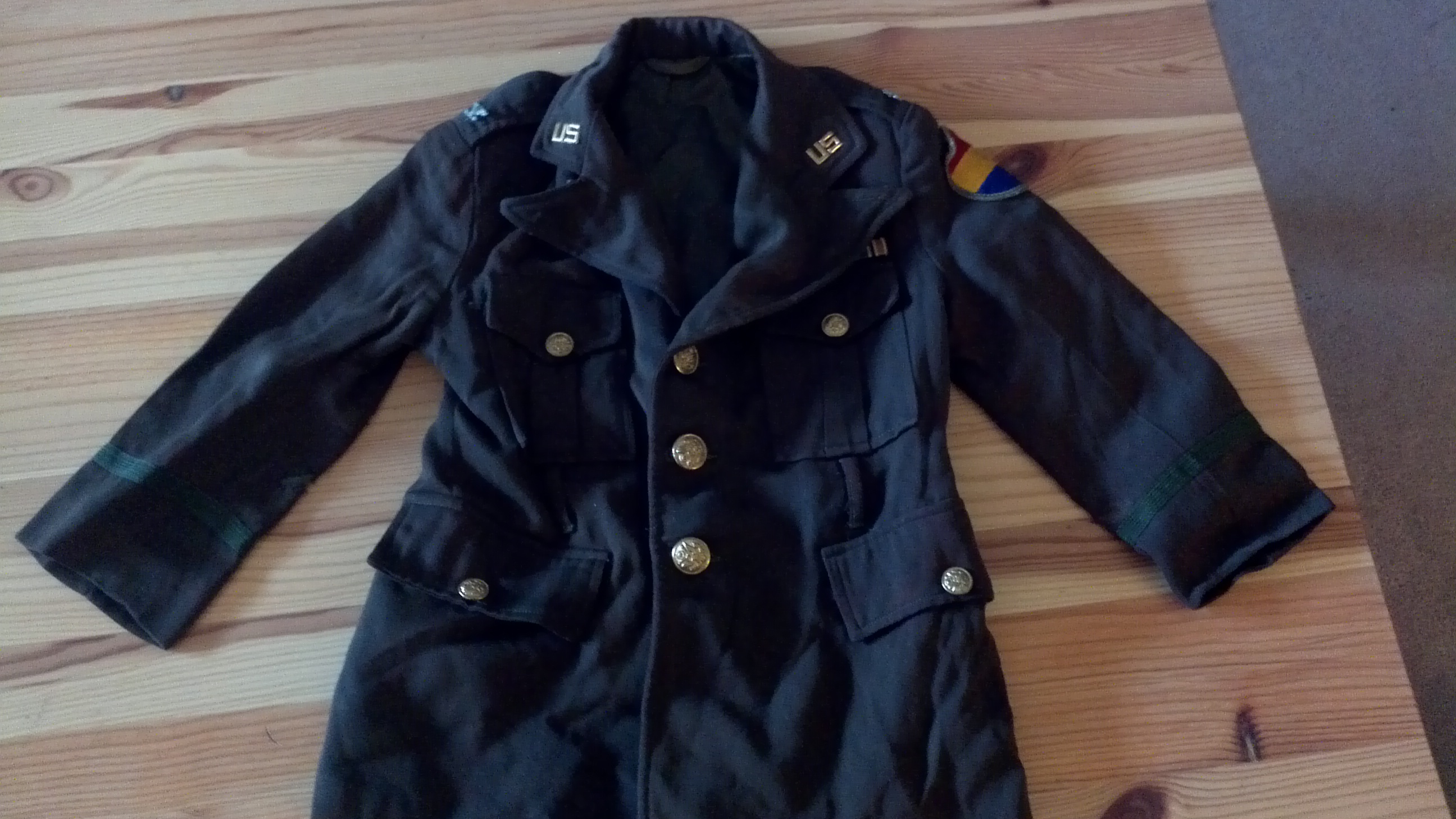 Child's Army jacket. Sized for approximately ages 2-4. Manufactured by San Tone Industries and tailored by Juvenile Manufacturing Co. Jacket is green with gold buttons. There are patches and pins on the jacket. It is lined and appears to be made in above average materials. There are belt loops, but I do not have the belt. There are two small tears in the right sleeve and one small onetears at the very bottom of the front right panel. No tears in liner.