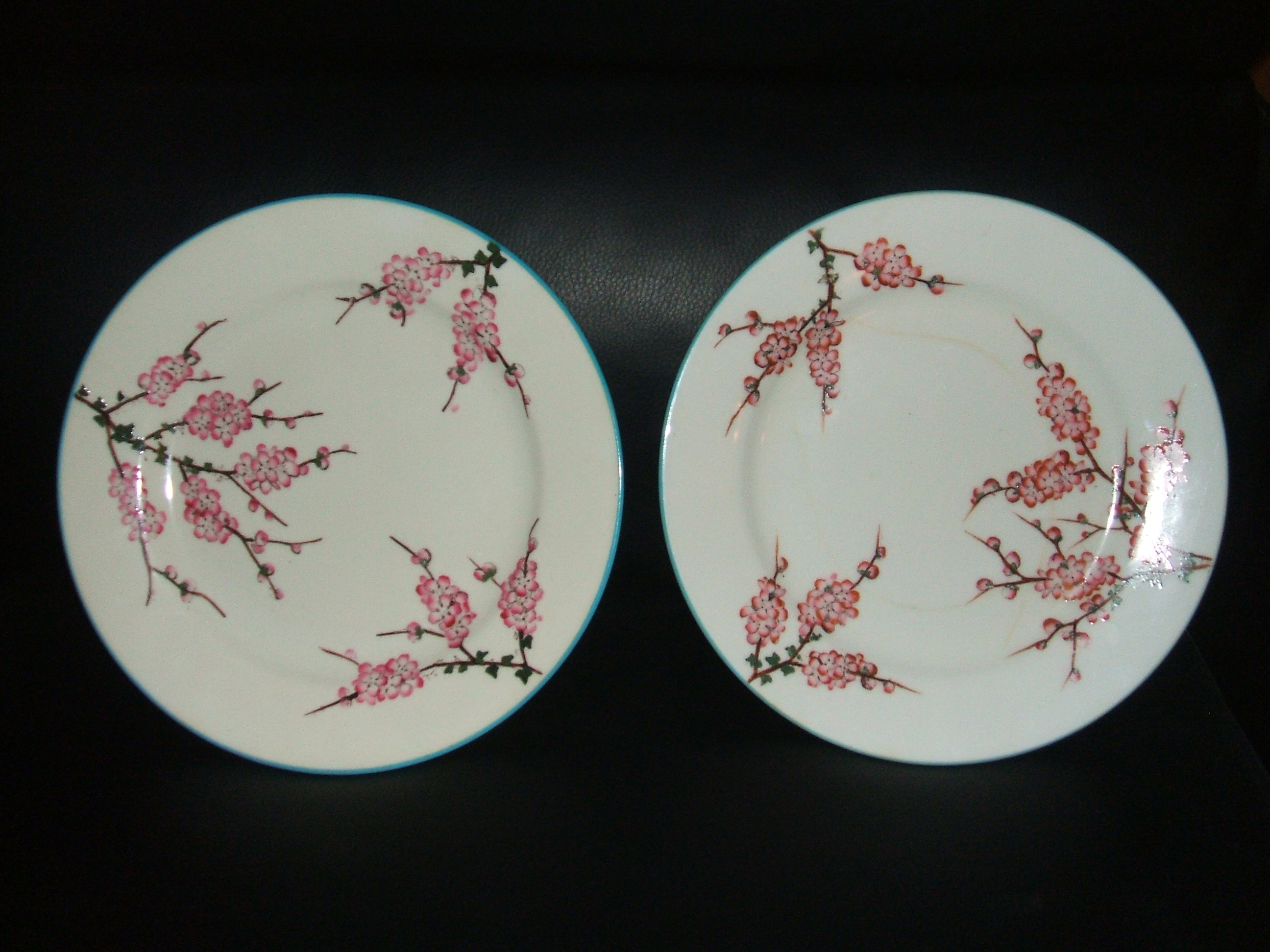 Stoke and sons Crescent “China” Rose and Aqua cherry blossom design (produced 1874-1924). Has G & J intertwined on back with “sons” in a crescent shape with “N” and “6” and 6200 on back. Two 8” dessert plates.