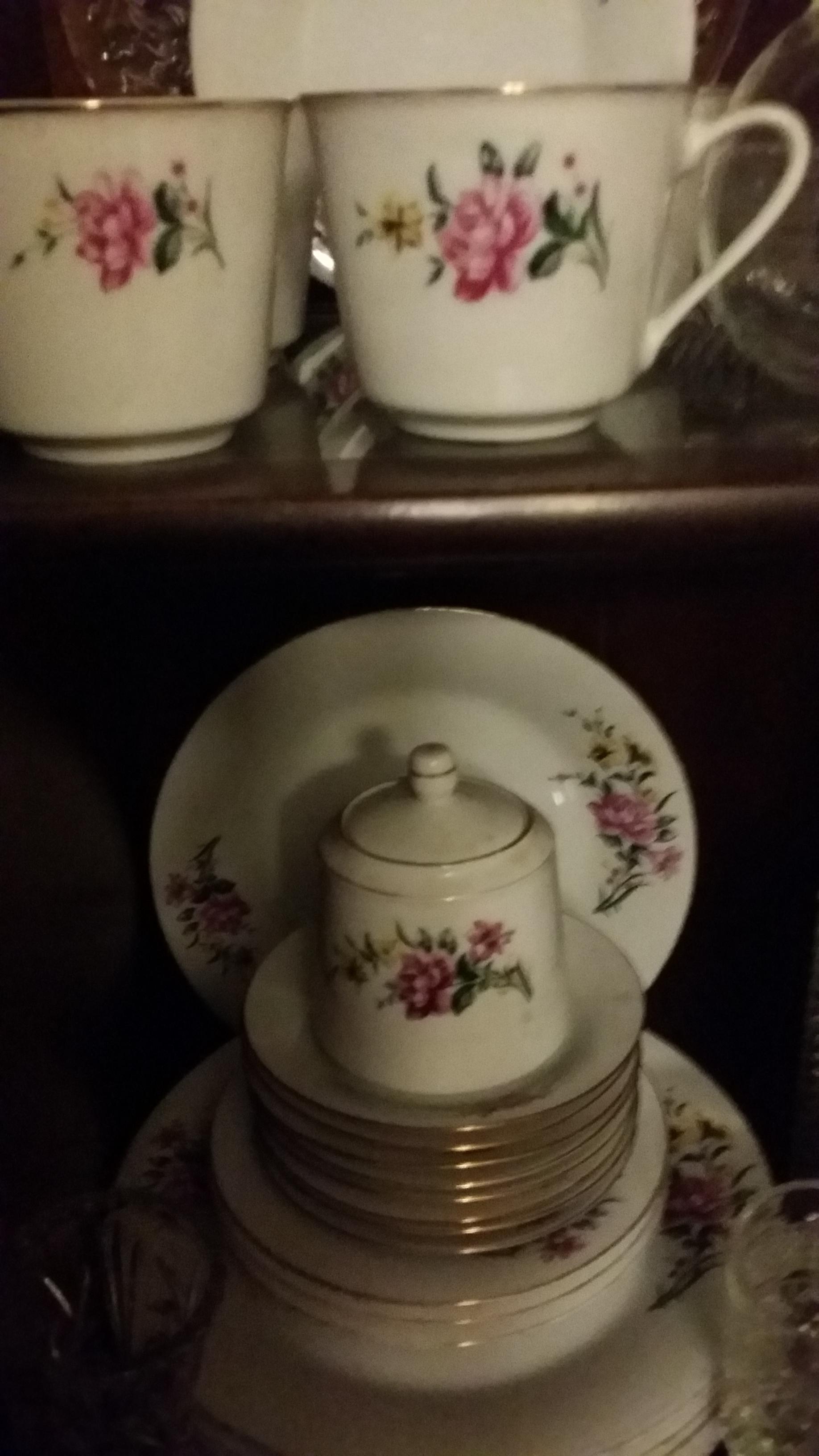 This is part of a large set including service for 8, cups, saucers, platter, sugar bowl and creamer server.Darker green branches with flowers in a darker pink and light yellow with Gold accents on the rims.