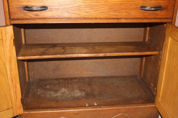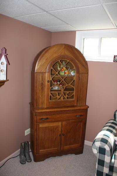 It reminds me of a old radio, it is curved on top. It is a china cabinet, it has a door that has beautiful wood scroll behind the glass...which is also curved. There is a bottom and two shelfs there. On the bottom half there is a long drawer and two cabinet doors, inside there are two shelfs. I have never seen anything like it and am looking for information on it.