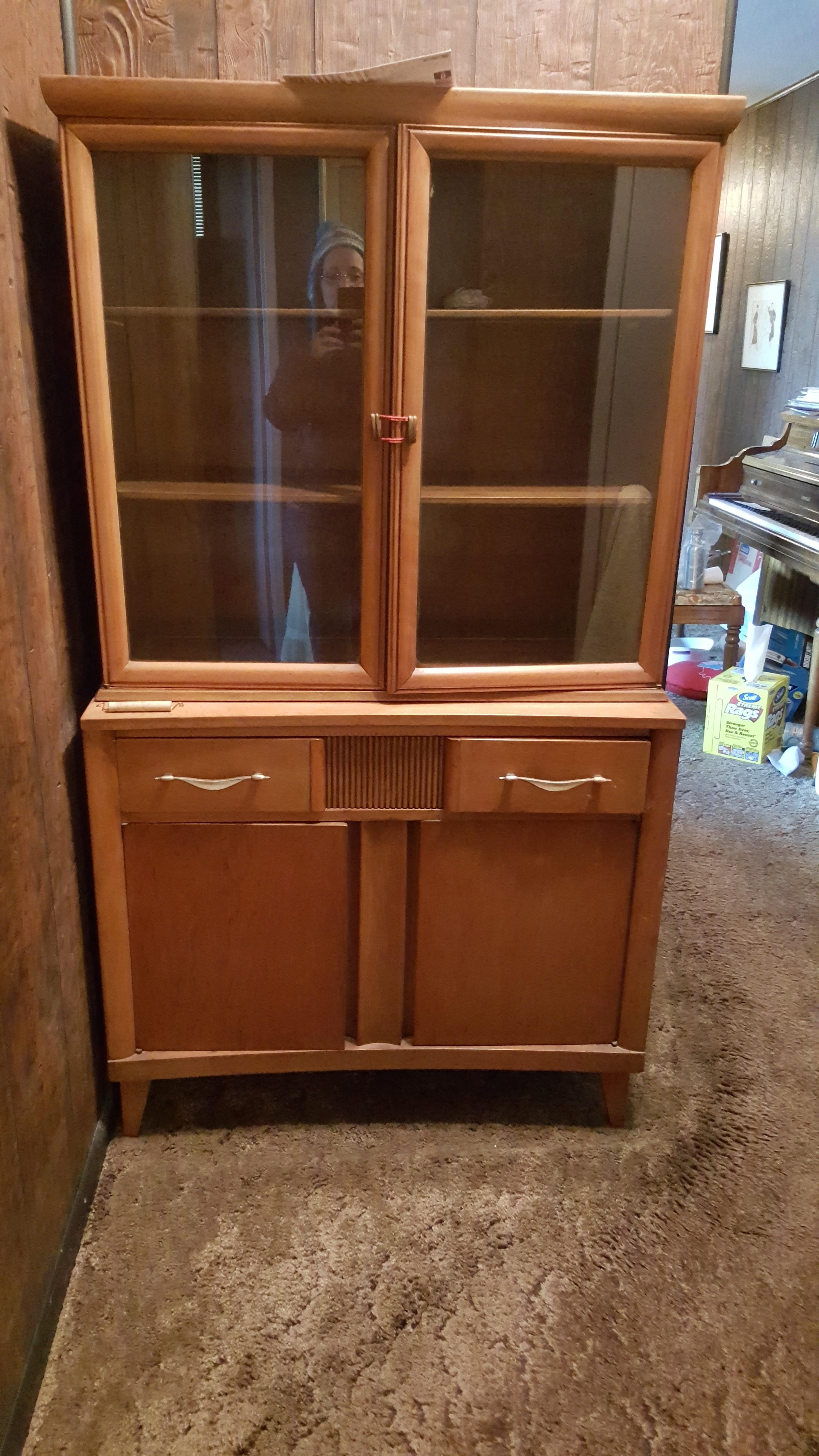 Wood China cabinet.  2 glass doors on top and 2 wood doors at bottom.  Draw has divisions inside.