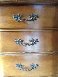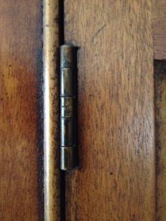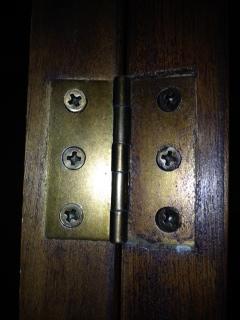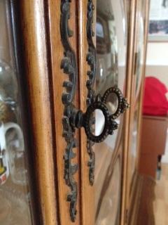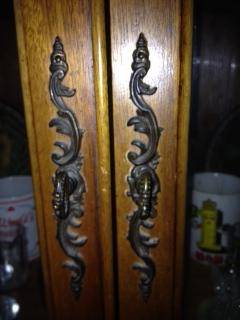 This is a family piece that has been passed around for at least the last 50 years. All latches and hardware are original. There are no markings or other identifiable stamps or numbers to indicate a maker or brand. The glass has what I call a bubble effect as the glass curves into three "bubbles" on each glass panel.