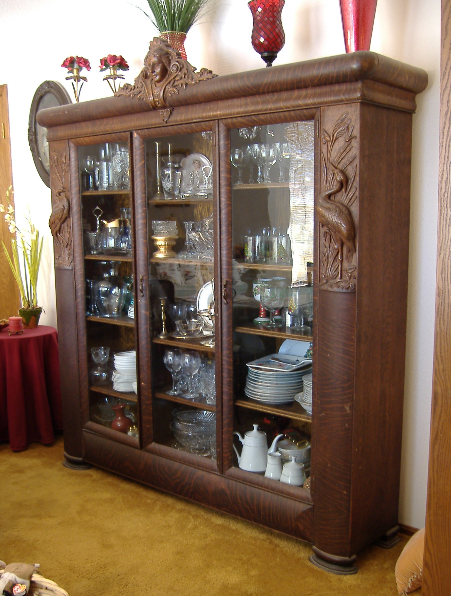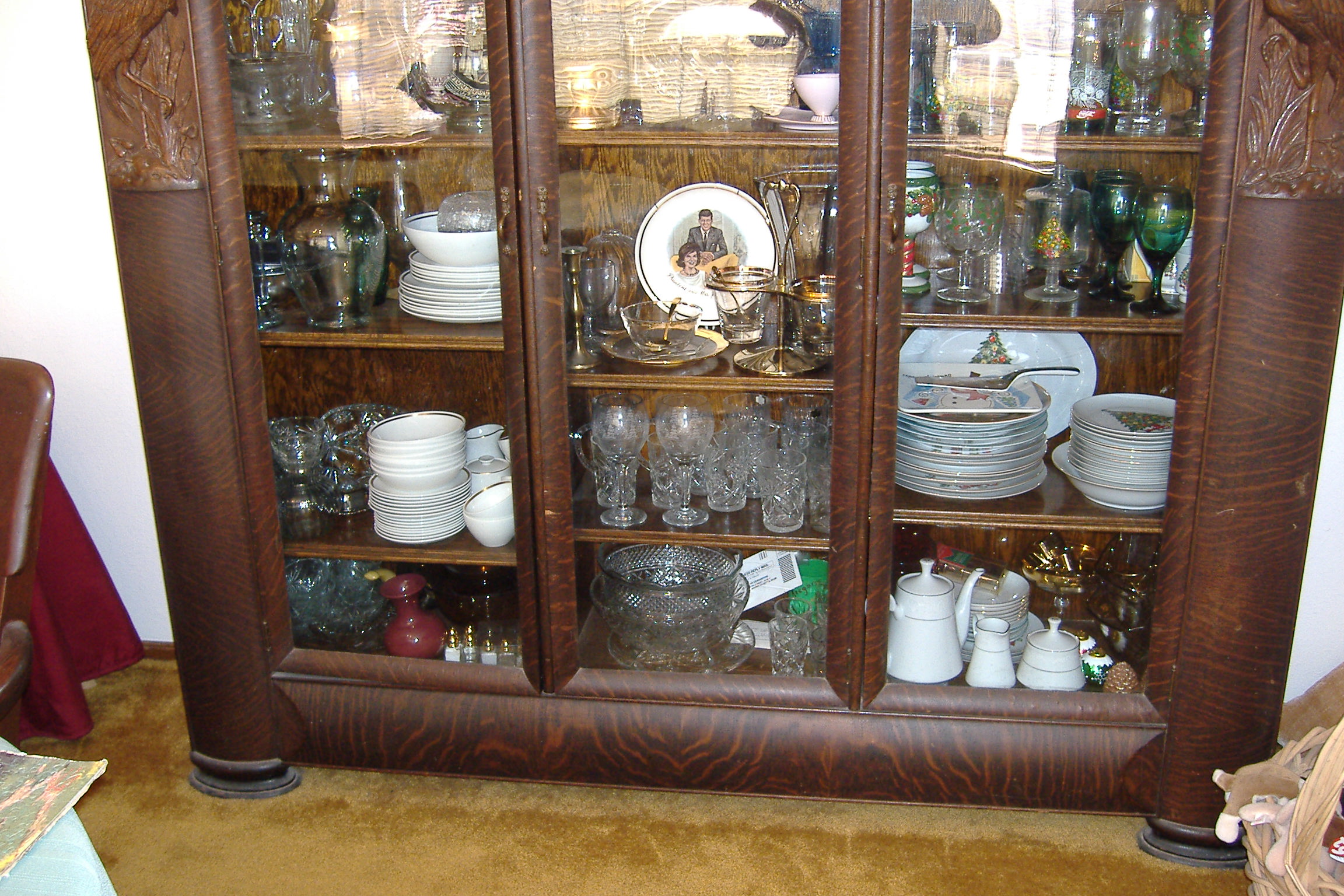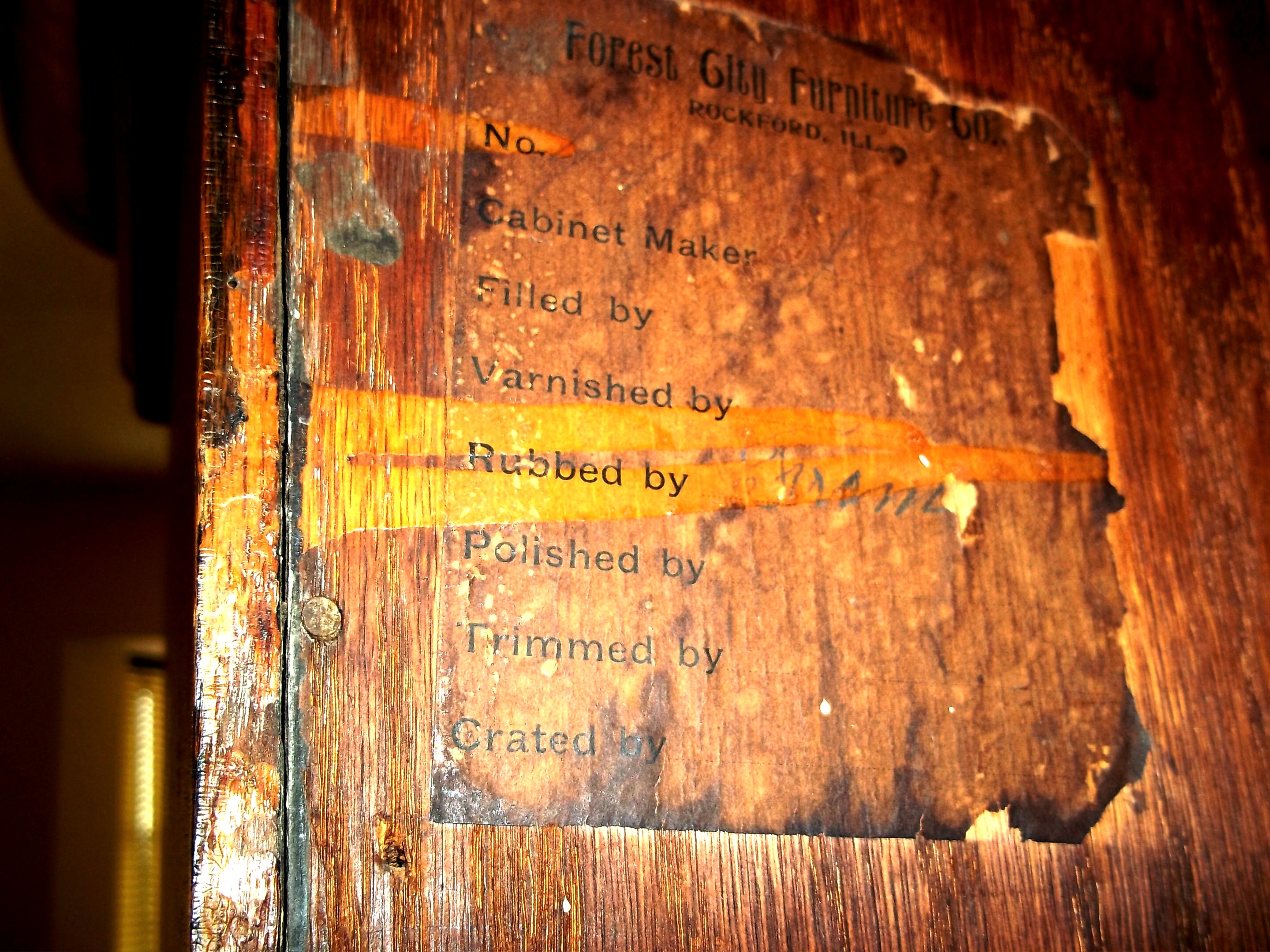 Large China Closet manufactured by Forest City Furniture Co., Rockford, ILL per manufacturer's tag still on the back of the unit. In excellent shape with a couple of small places where the veneer is loose or missing. 3 doors with original glass.