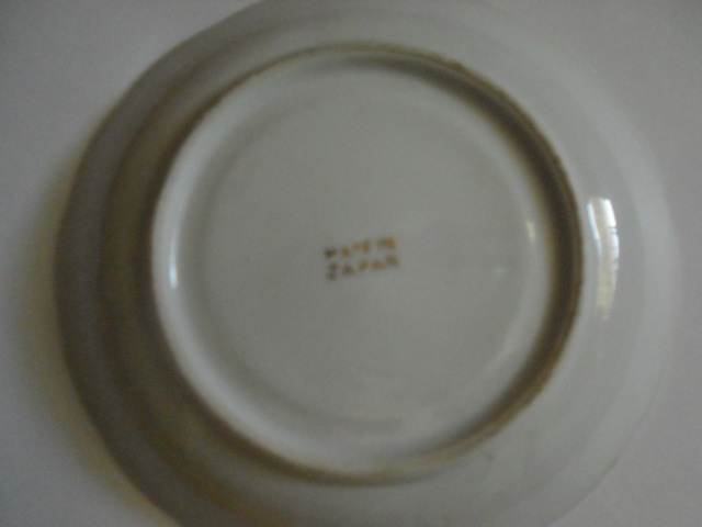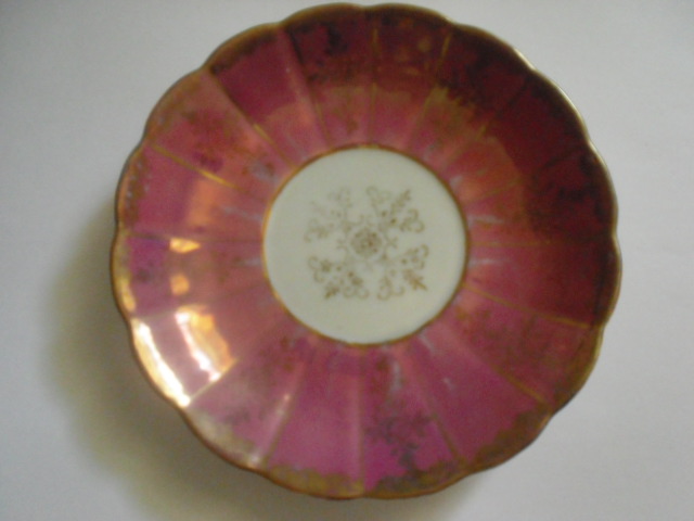 bright Pink and gold iridecent cup saucer with scallop pattern white center with gold filigree type center. Rim of plate is gold speckled. Under or on the iridecent pink is more gold filligree and the scallops are lined in gold as well. Slight wear noted on bottom of saucer. bottom marking on back is Made in Japan in gold lettering No chips or cracks